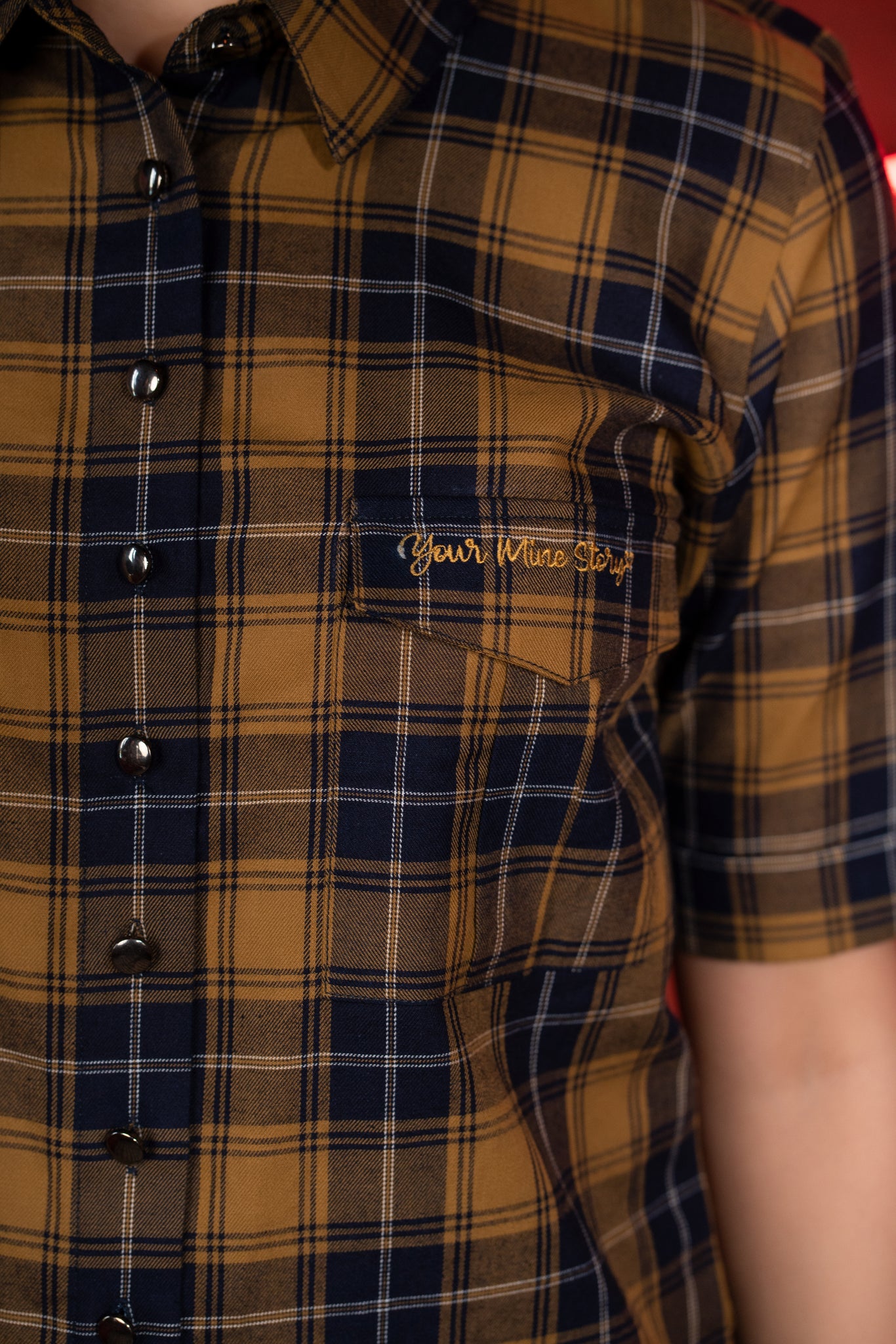 Button down shirt dress in navy blue and tan check featuring half sleeves ,knee length with comfort fit. It is crafted in textile cotton fabric.