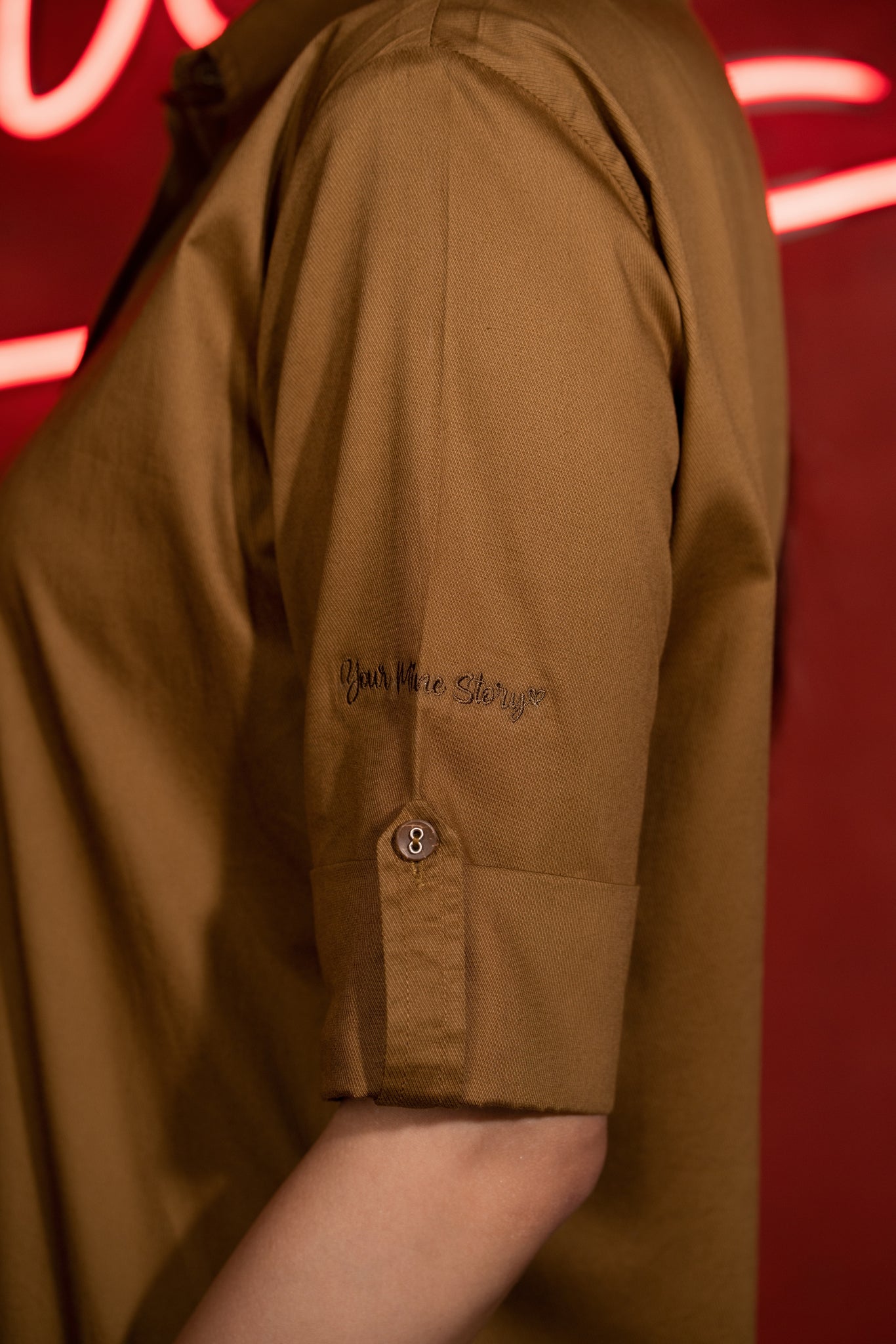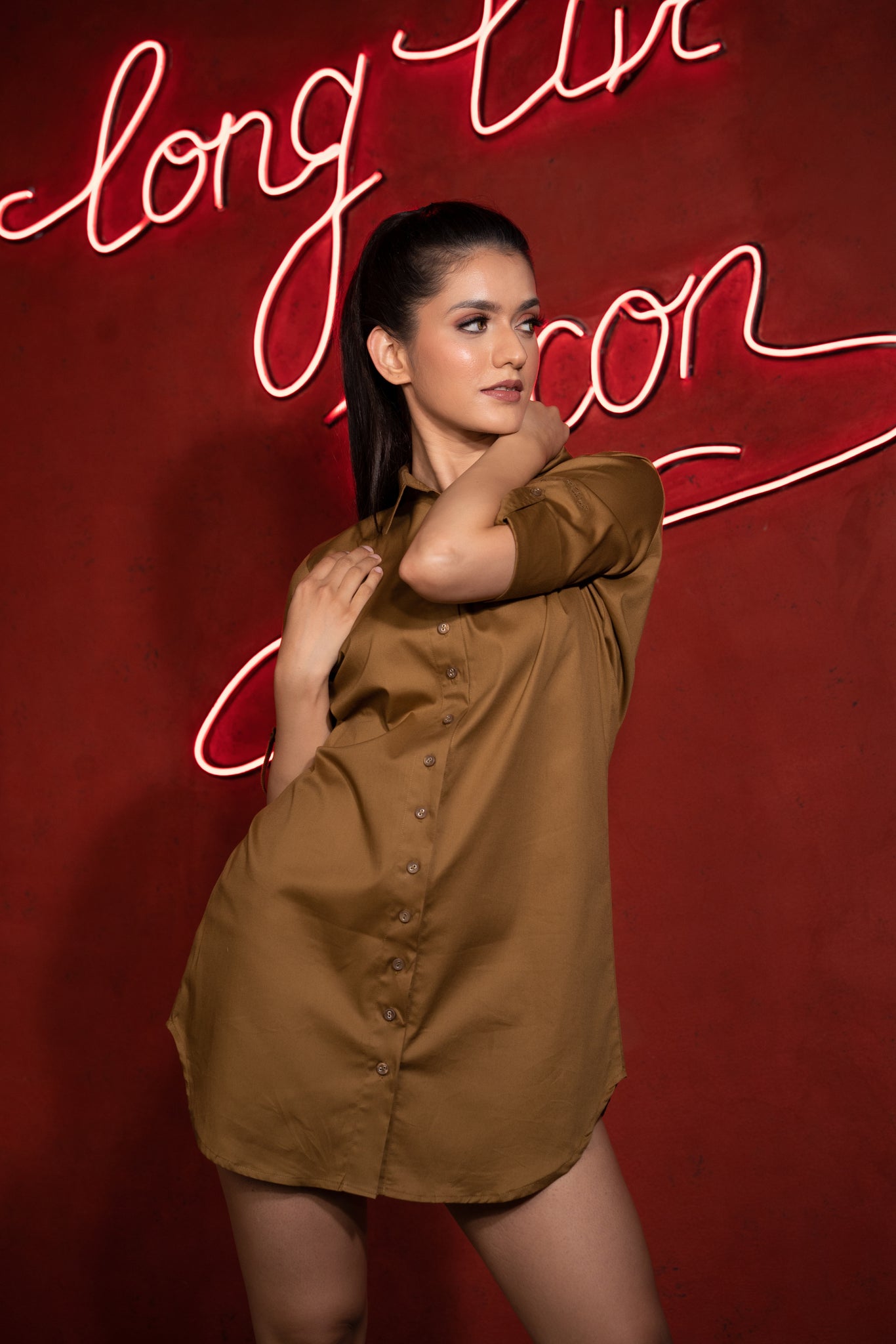 You will love the relaxed feel of this solid tan shirt dress, featuring spread collar and quarter sleeves with flap and has front button closure. Can be worn for office wear.
