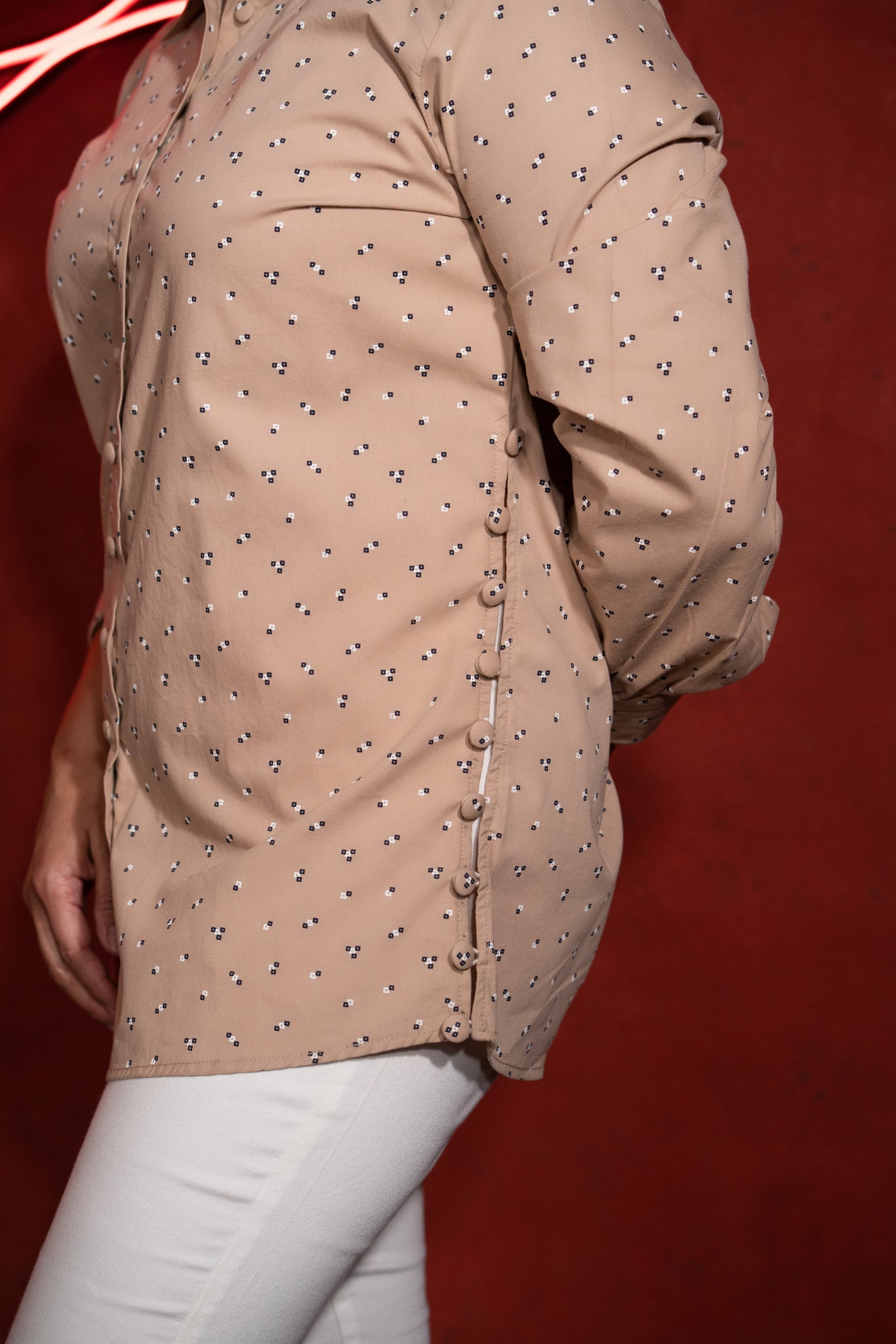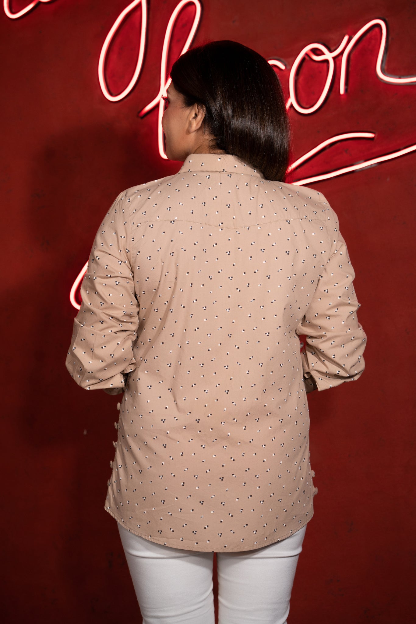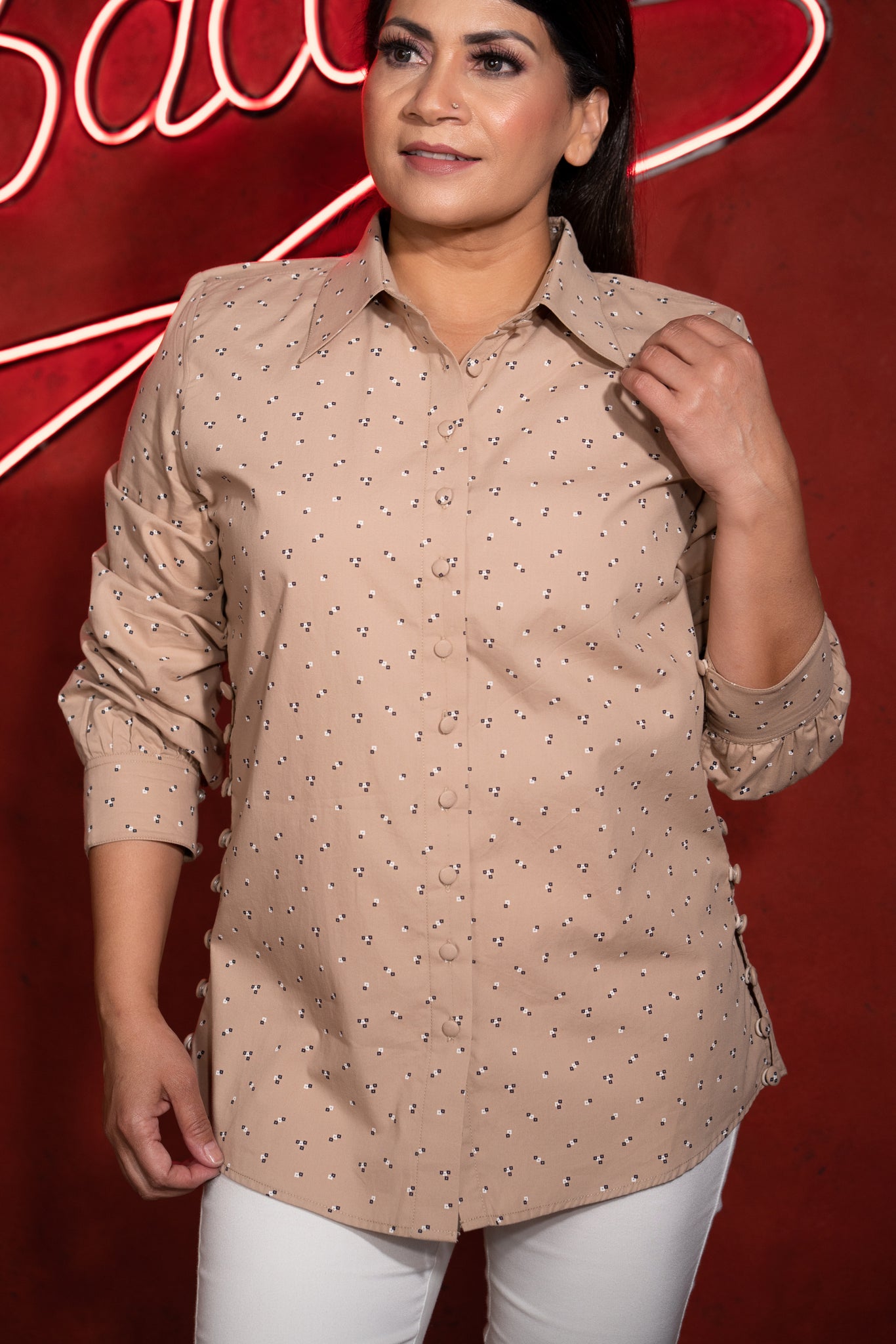 This beige printed shirt is crafted in cotton. It features spread collar, full length sleeves and has cut out details on the sides with buttoned closure. It is perfect for business meetings.