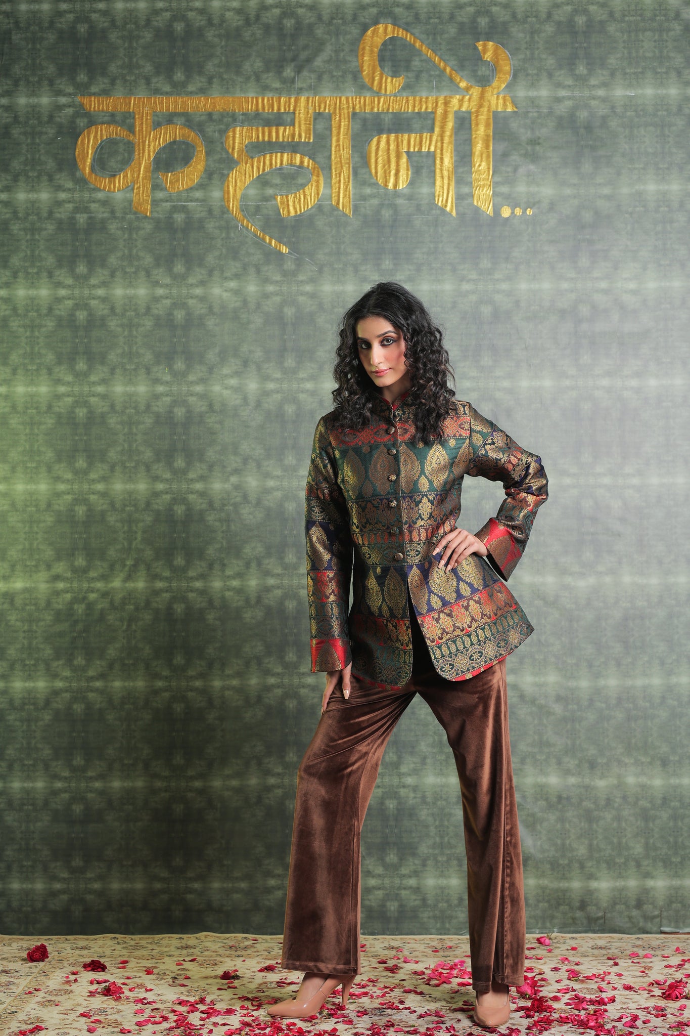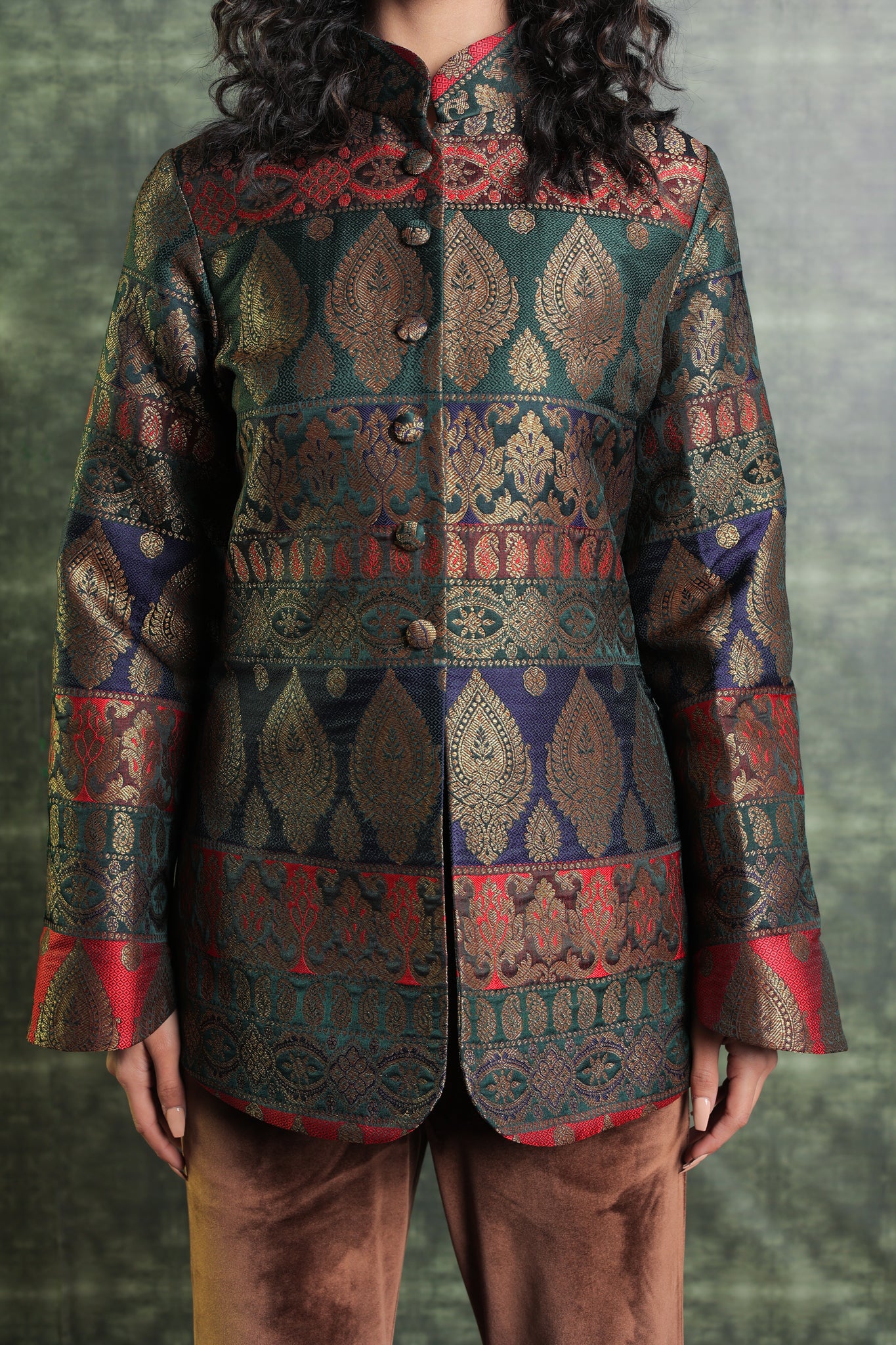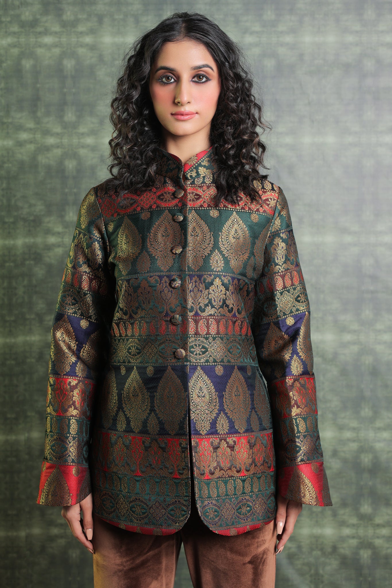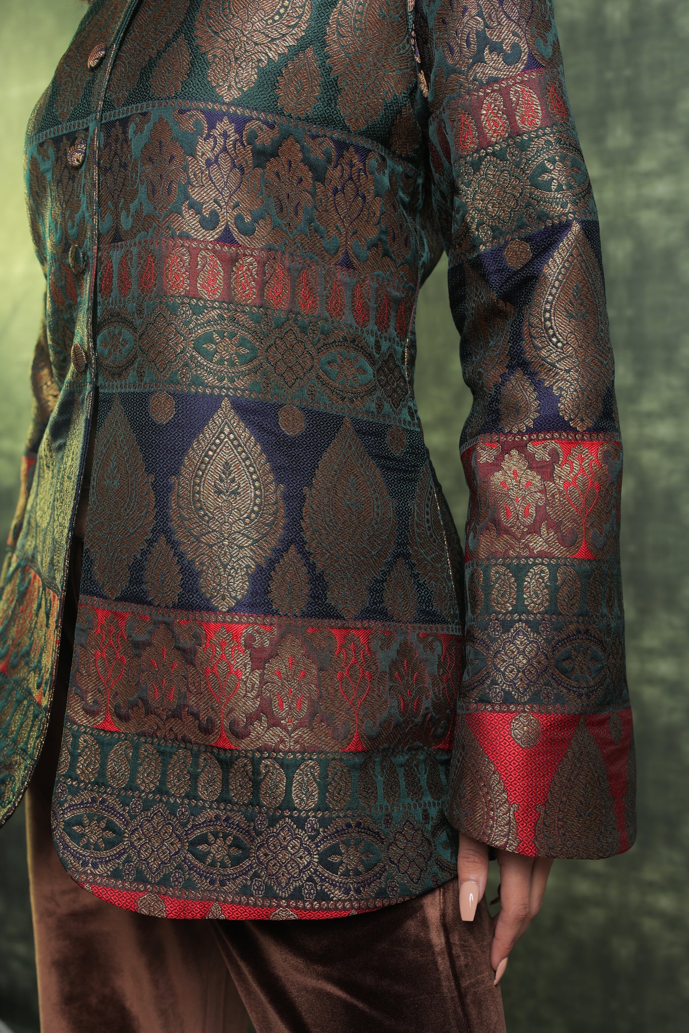 This exquisitely tailored Brocade Blazer is made of premium quality fabric and has button openings at the front and a ban collar design. Paired with Velvet trousers, This Outfit seems really festive and exquisite. Wear this ensemble at your upcoming family get-together. Get a Customised Blazer and Pants Length. Our team will assist you further.