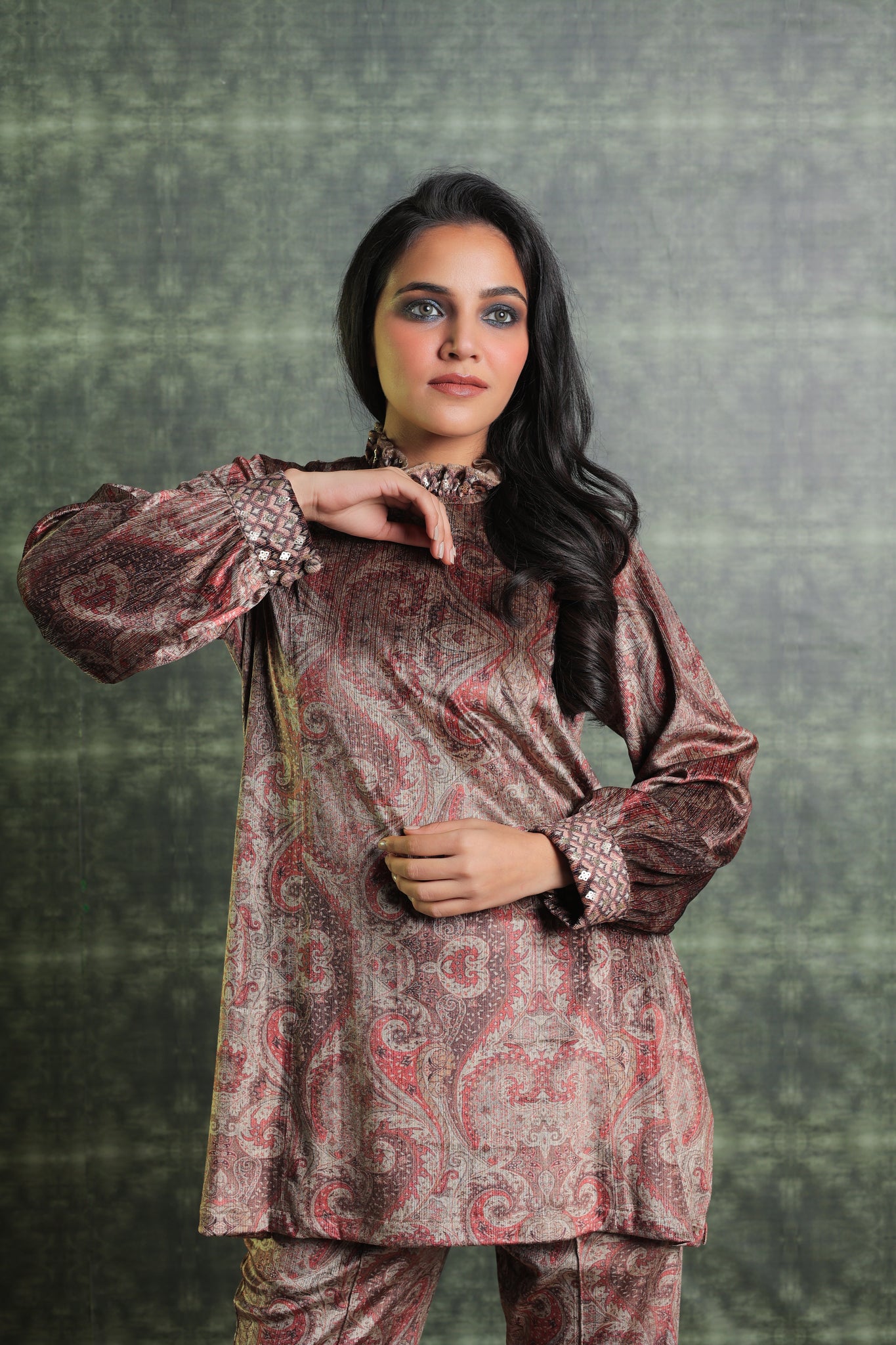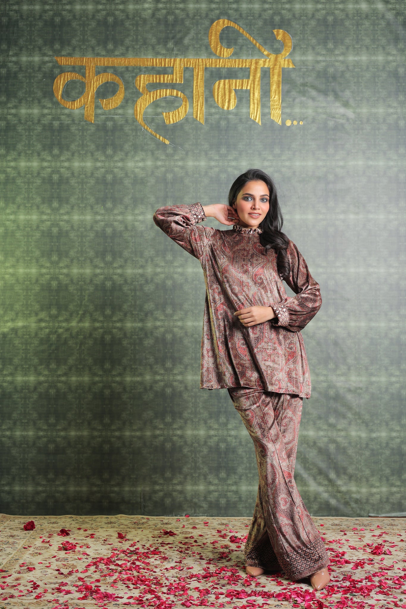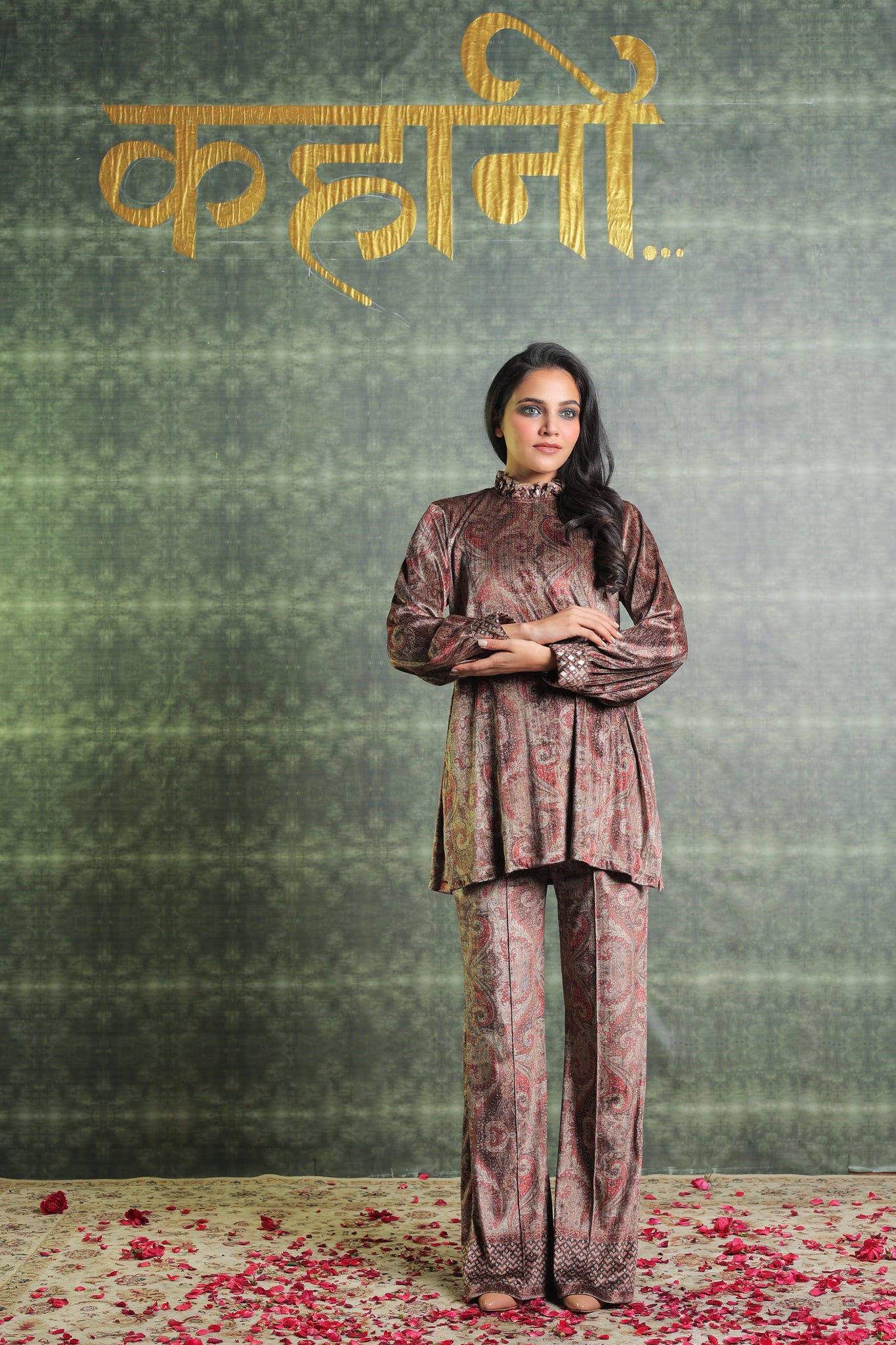 These exquisitely designed Printed Velvet Coord Sets are perfect for your upcoming festive event. The complete ensemble is made more sophisticated by the frill design on the neck and the cuff detailing on the sleeves. The Bell Bottom Pants creates an elongated look. Wear this exquisitely fitted ensemble to your upcoming festive occasion.