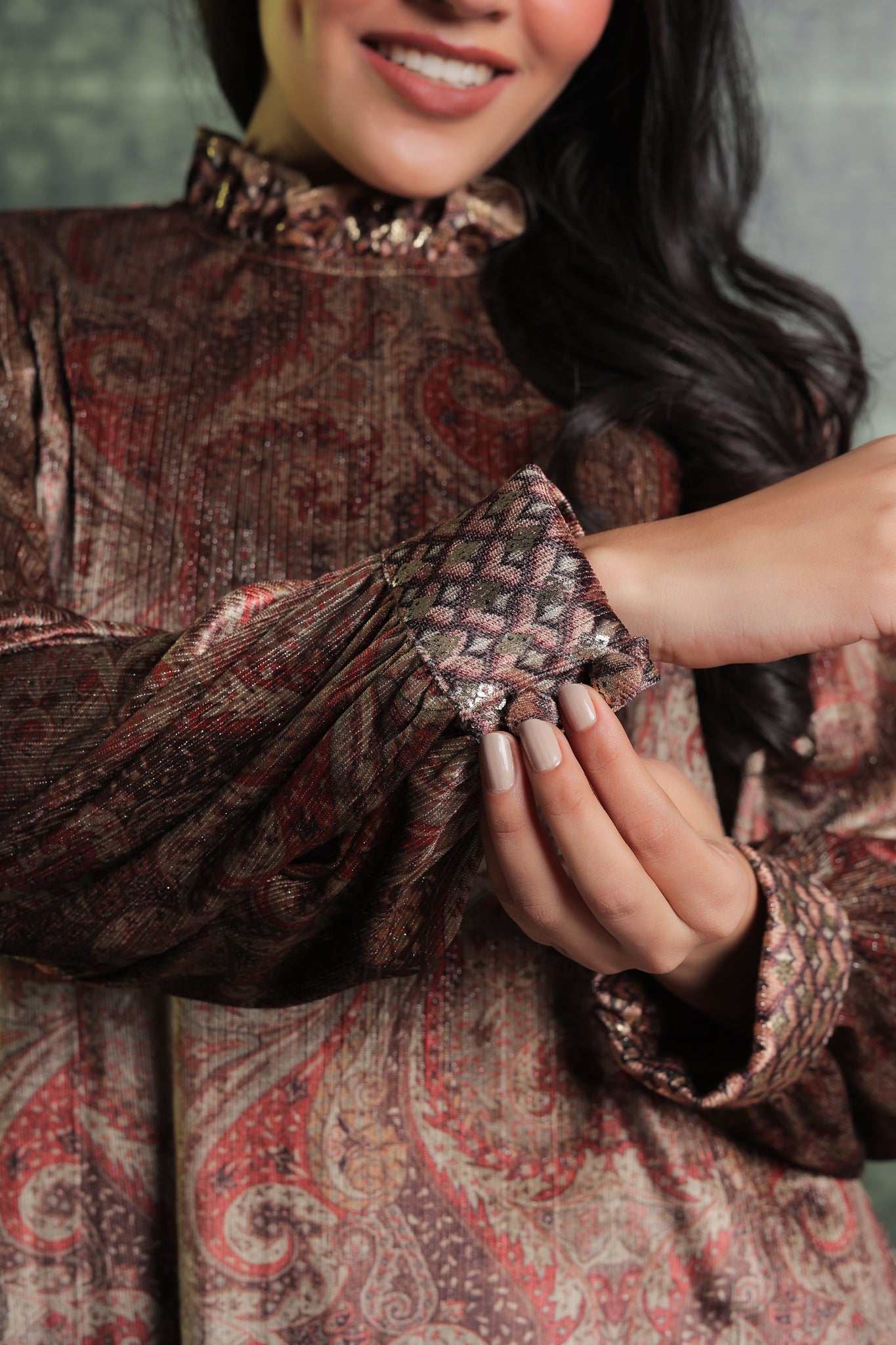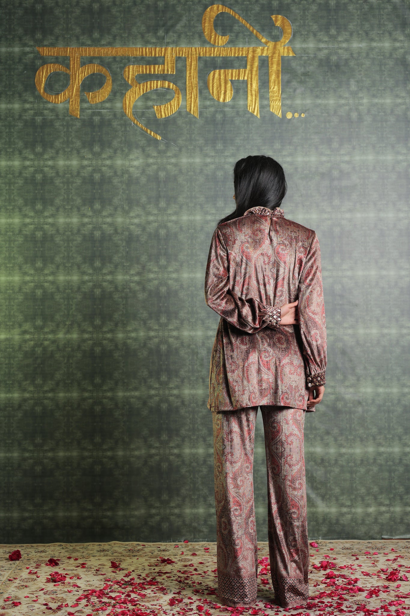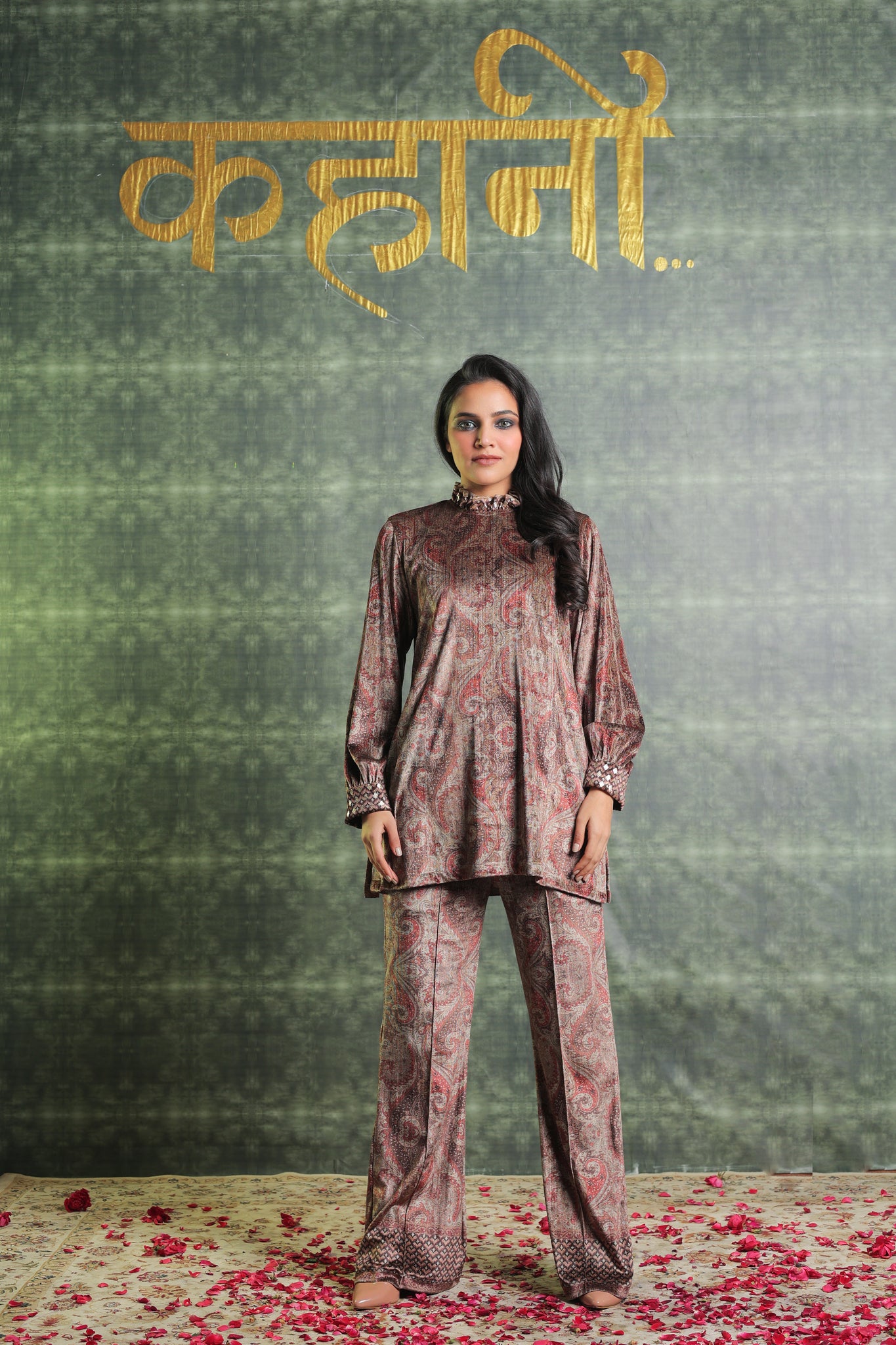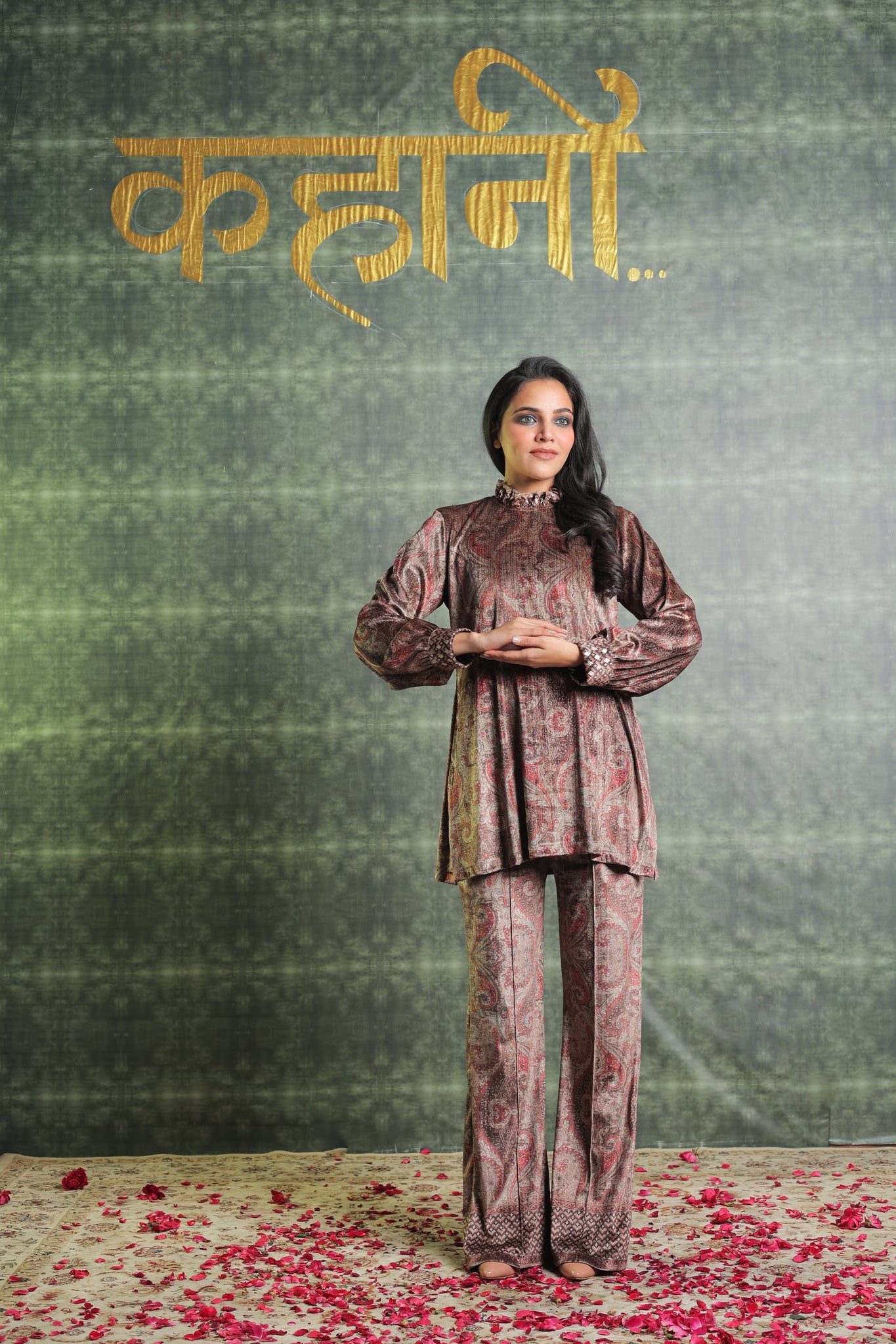 These exquisitely designed Printed Velvet Coord Sets are perfect for your upcoming festive event. The complete ensemble is made more sophisticated by the frill design on the neck and the cuff detailing on the sleeves. The Bell Bottom Pants creates an elongated look. Wear this exquisitely fitted ensemble to your upcoming festive occasion.