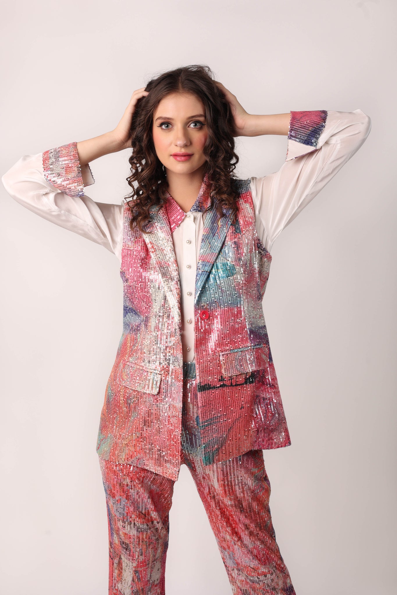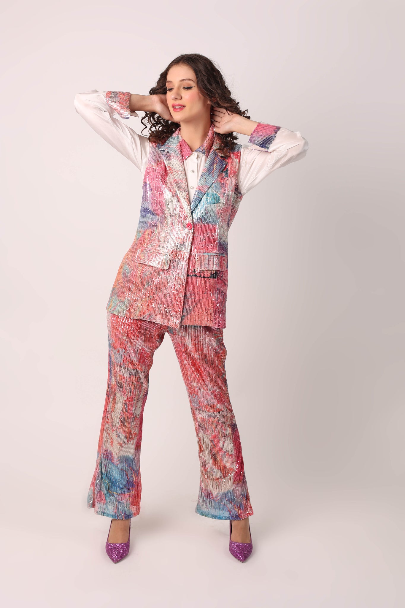 YMS IS ALL ABOUT BEING OUTSIDE THE BOX! THIS THREE-PIECE SET CONSISTS OF A WHITE FORMAL SHIRT WITH PRINTED SEQUIN DETAILING ON THE COLLAR AND CUFFS, A SLEEVELESS JACKET, AND FLARED TROUSERS. THIS PRINTED SEQUIN MAKES IT ONE OF IT’S KIND!