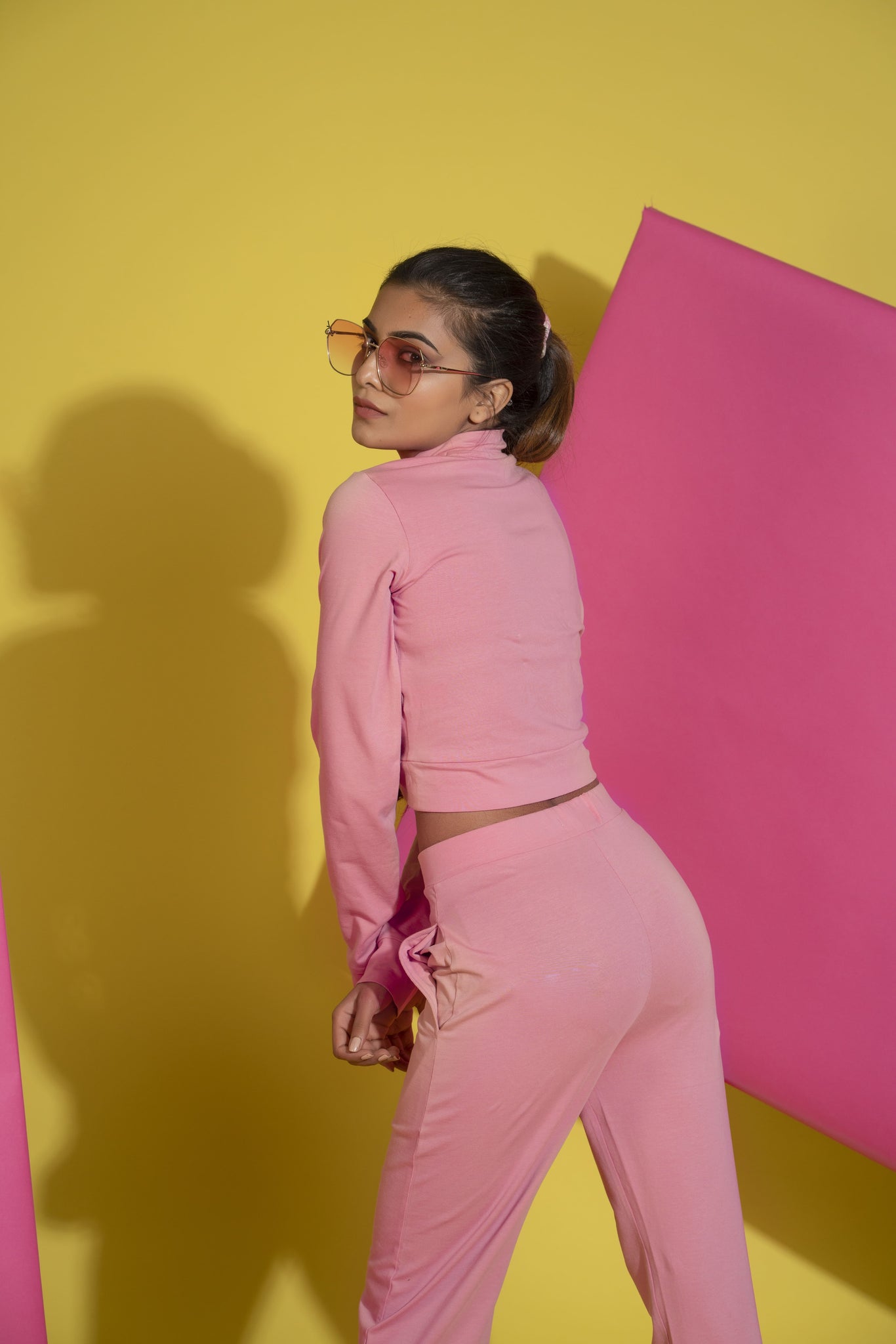 High waist pink trousers with elastic waistband and side pockets co-ordinated with cross knot full sleeves top. Fabric: Cotton Lycra MODEL SIZE & FITThe model (height 5.4ft) is wearing size S. DISCLAIMER : There might be a slight variation...Read more