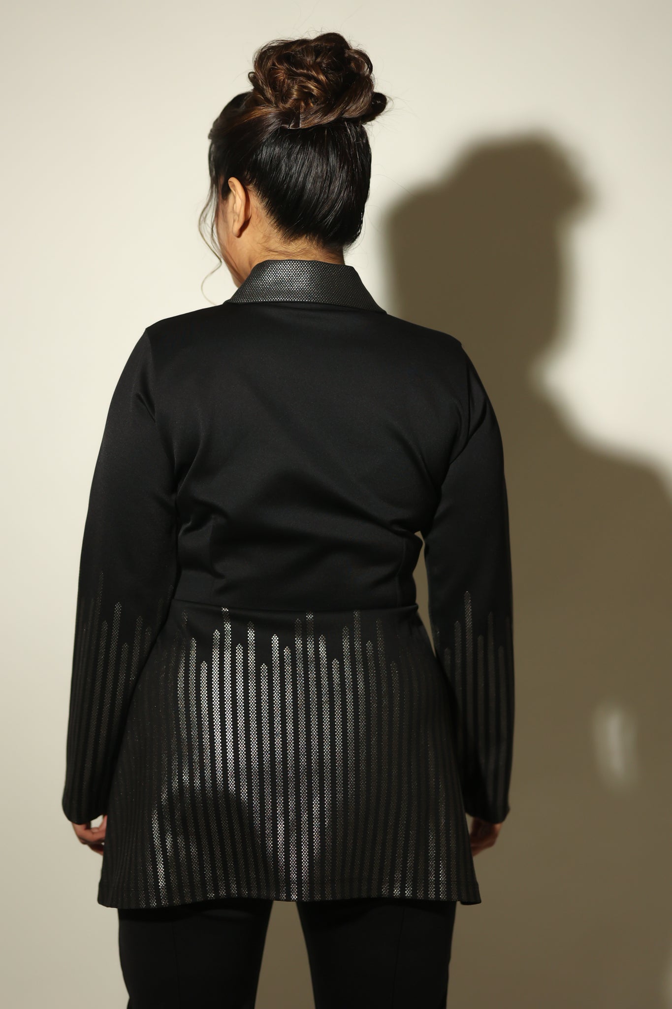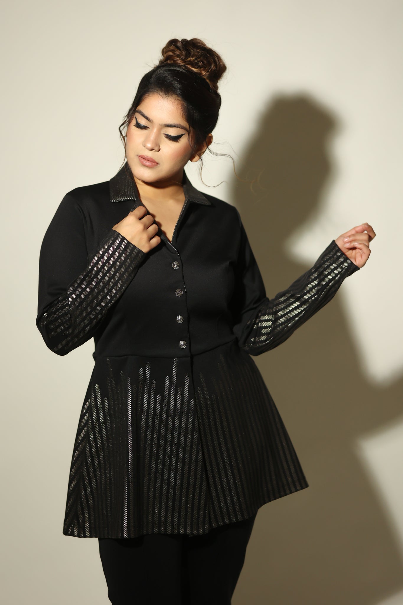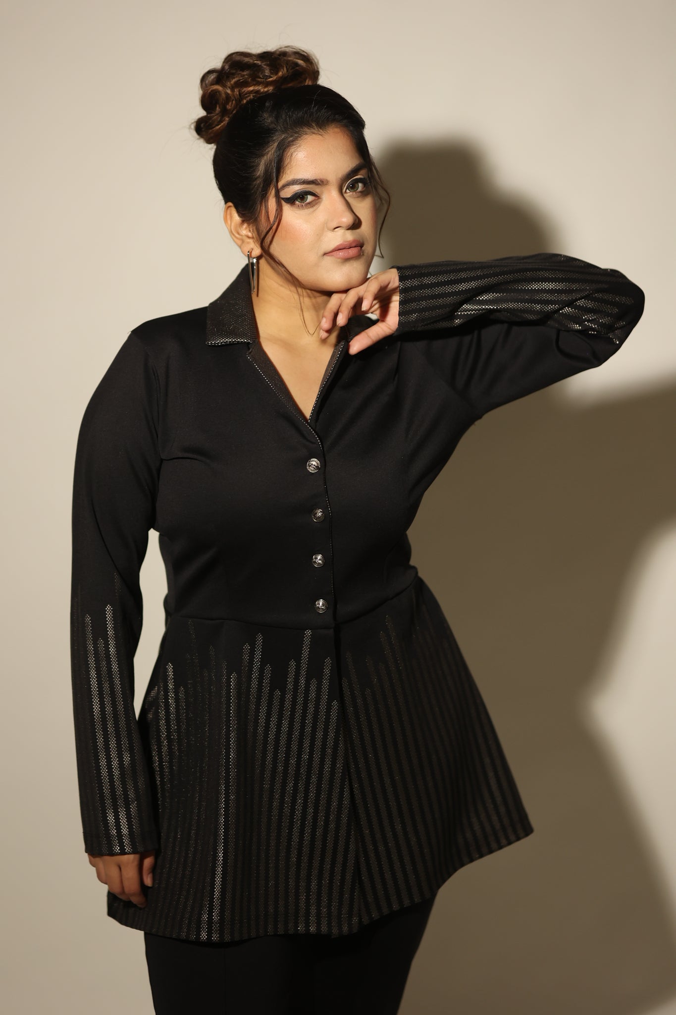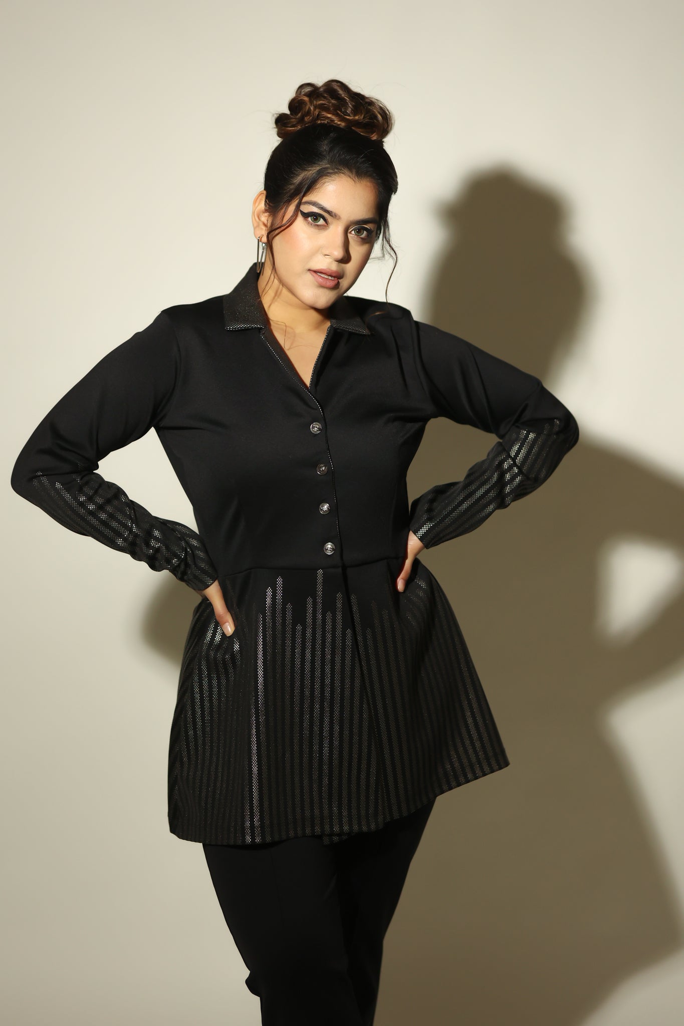 THIS BLACK COORD SET IS A PERFECT OUTFIT TO GRACE ANY FORMAL OCCASION. FEATURING FOIL PRINTED COLLAR DETAILING AND GEOMETRIC PRINT DETAILING ON THE OUTFIT ADDS A STYLE STATEMENT TO THIS ONE. THIS ONE SHOULD NOT BE MISSED!