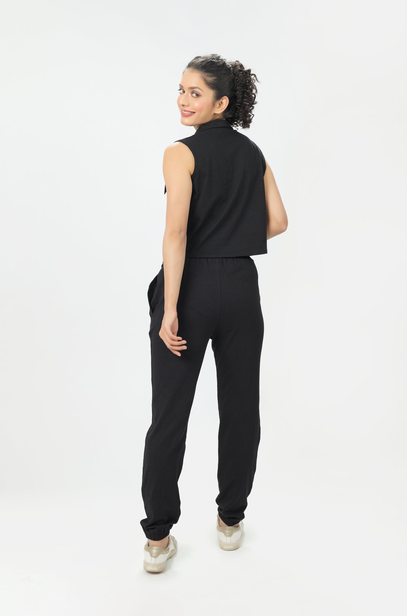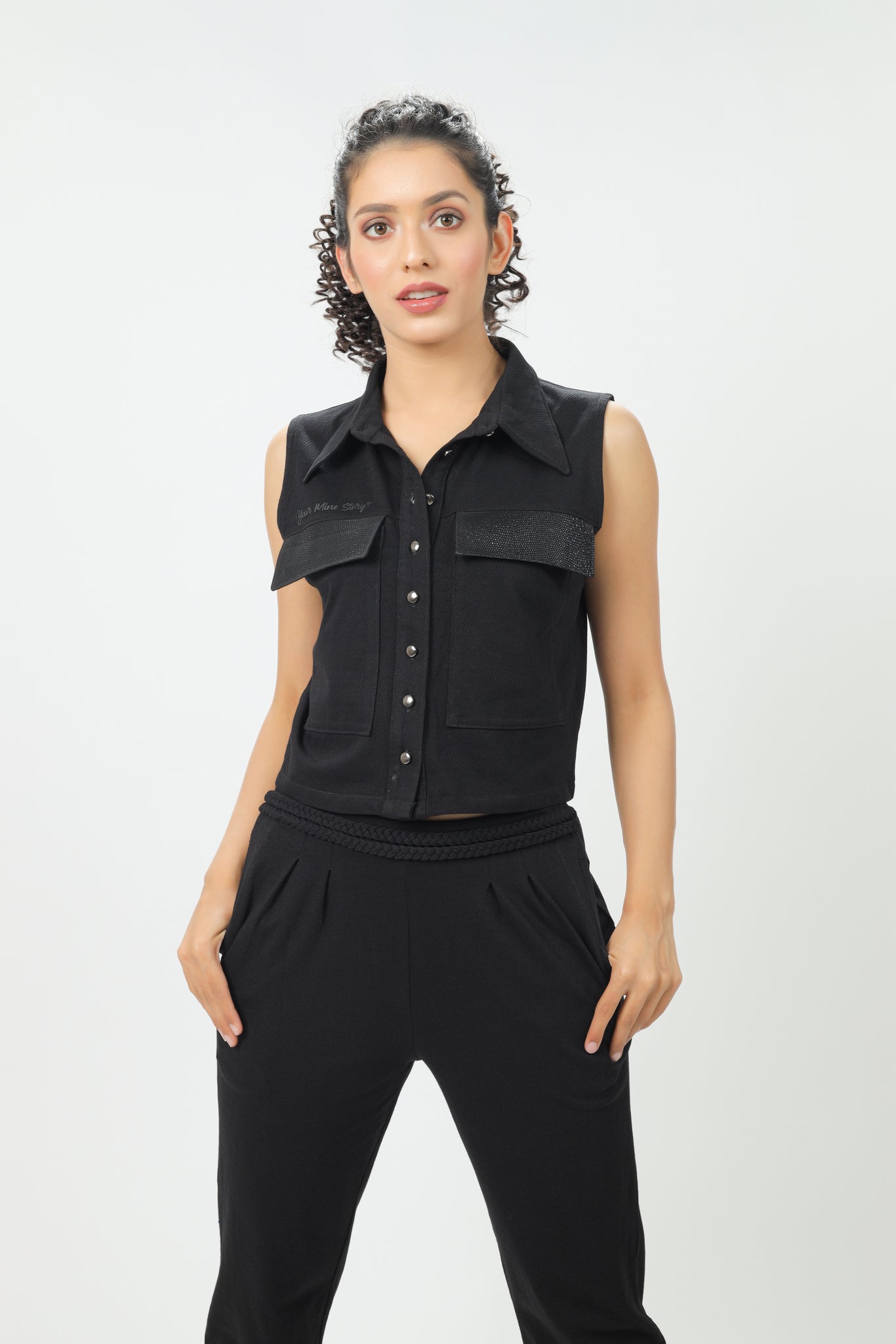 Feel at ease in this coord set featuring black buttoned-down jacket paired with joggers having braided belt details and pockets.