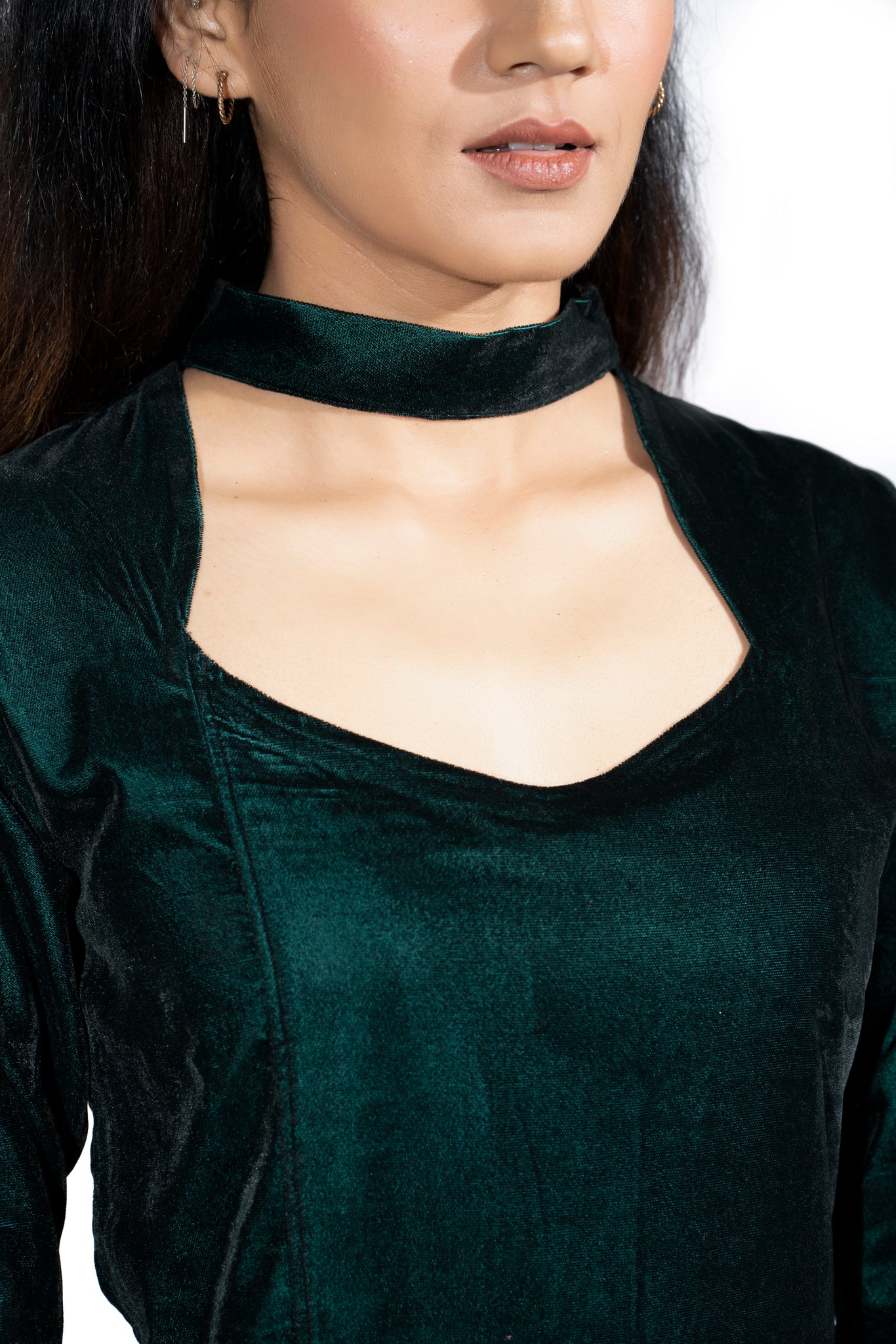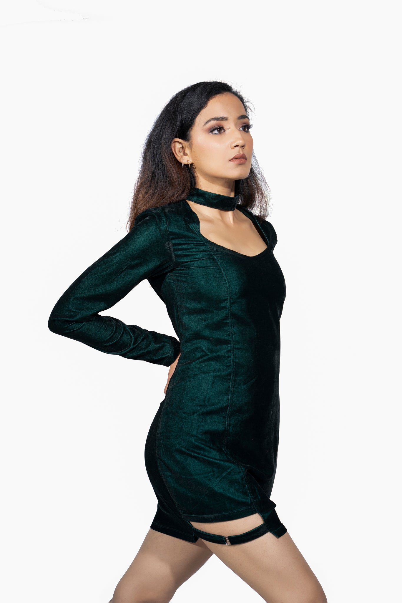 As pretty as a flower, this stunning green coloured, full sleeves dress made out of pure velvet with a solid pattern and buckled strap on the thigh is surely a must have in your wardrobe.
