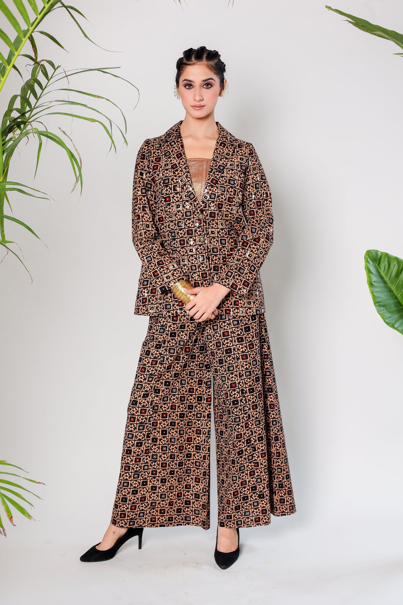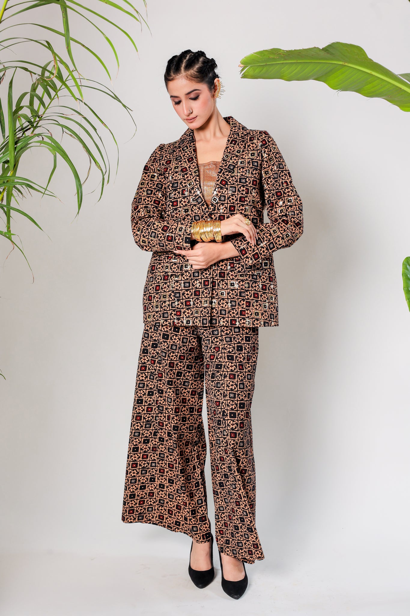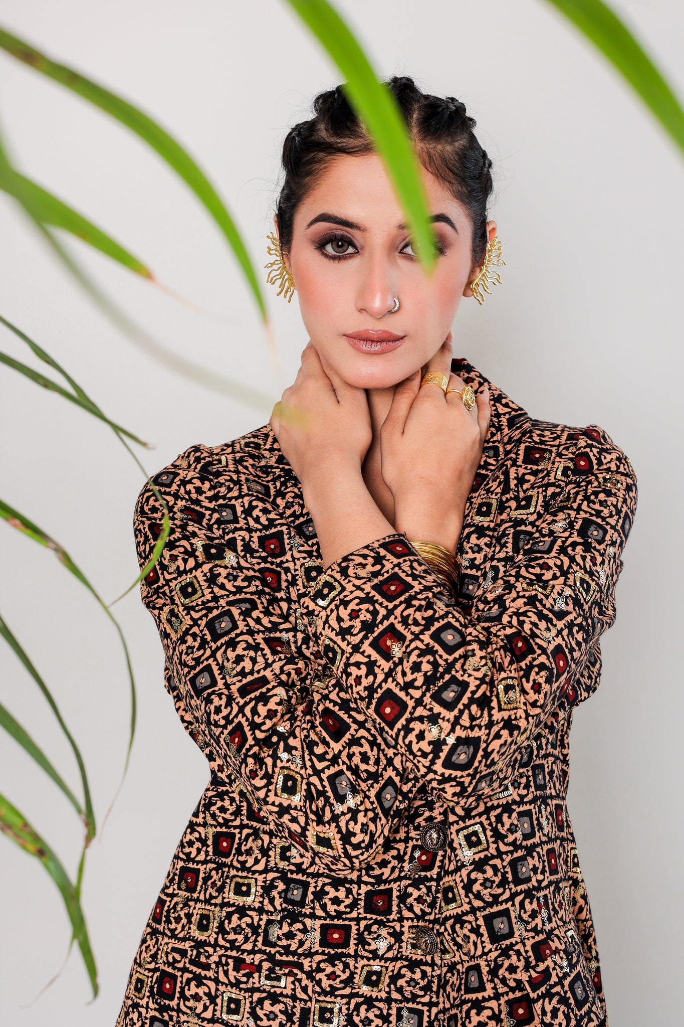 Presenting the hand-embroidered Summer Three-piece Suit from Your Mine Story! This ensemble, which includes exquisitely Flared Pants and a brilliantly hand-embroidered Blazer, exudes modern refinement. The gorgeous foil printed corset is an absolute desire and completes the outfit...Read more