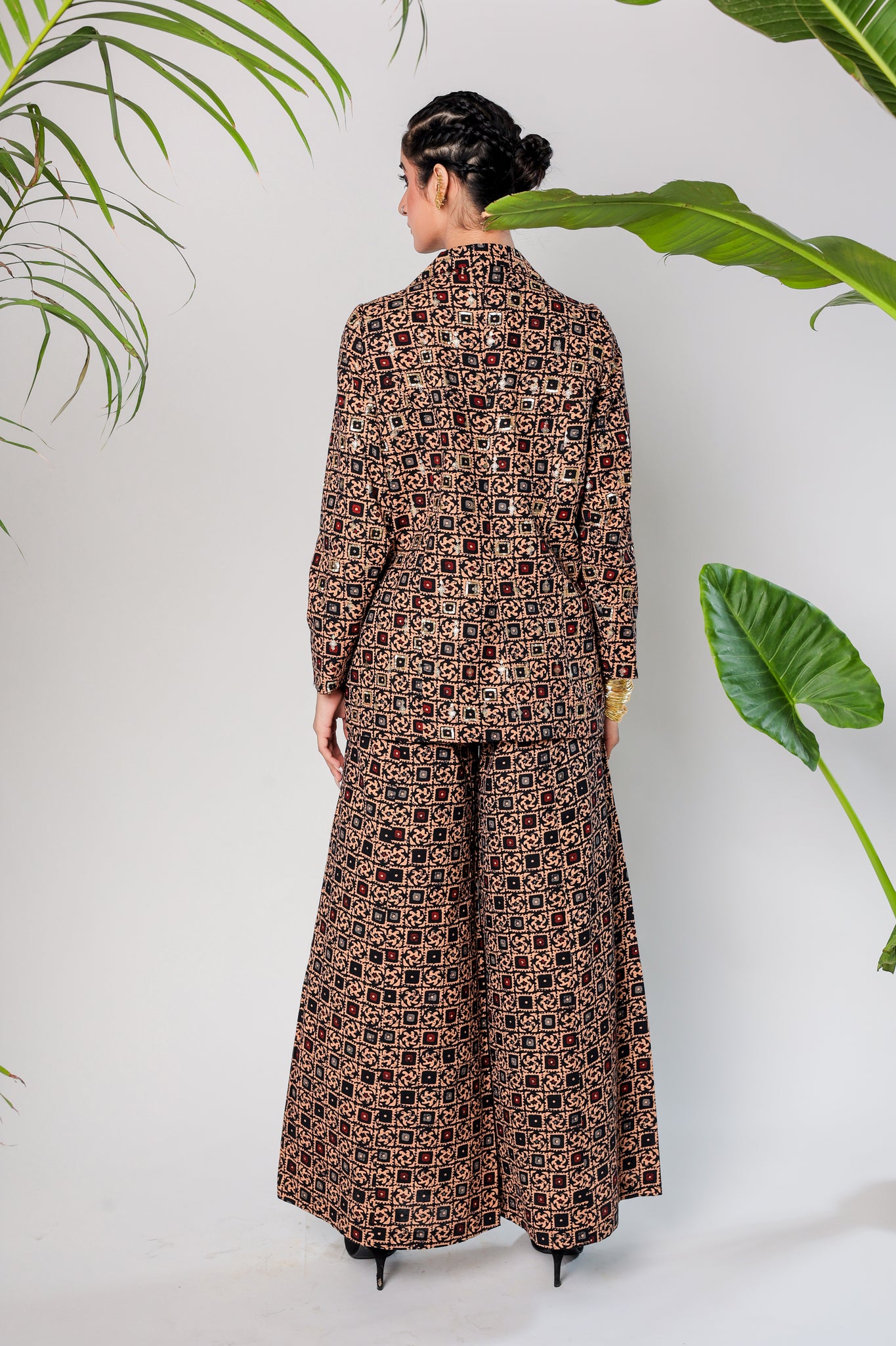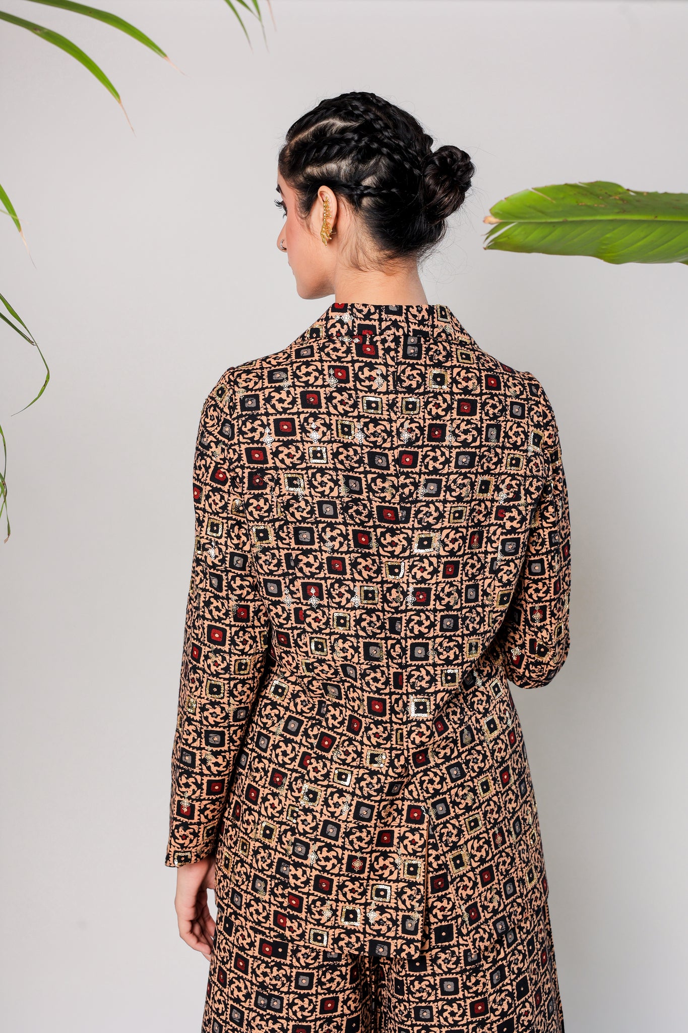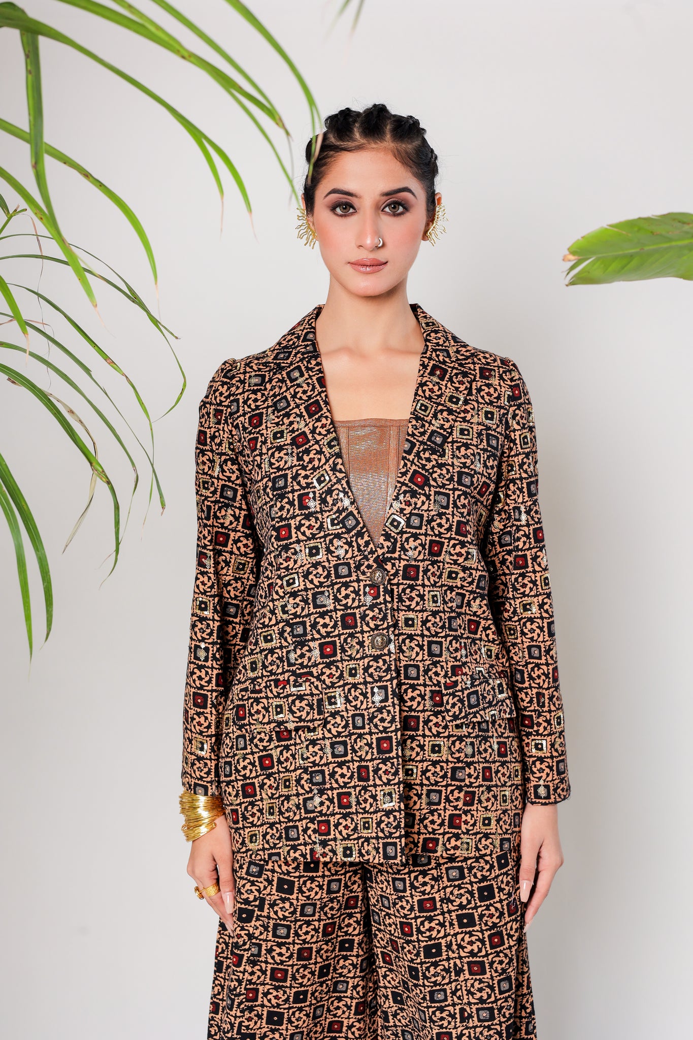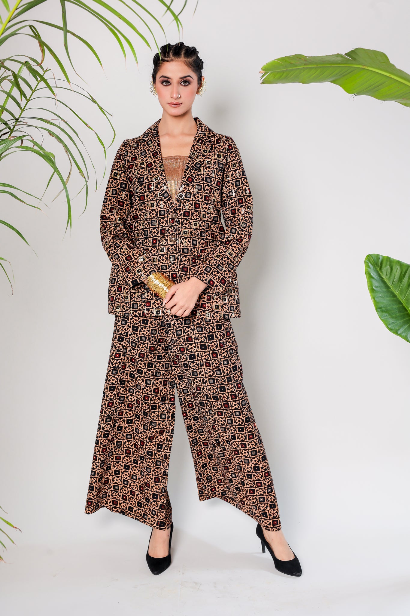 Presenting the hand-embroidered Summer Three-piece Suit from Your Mine Story! This ensemble, which includes exquisitely Flared Pants and a brilliantly hand-embroidered Blazer, exudes modern refinement. The gorgeous foil printed corset is an absolute desire and completes the outfit...Read more