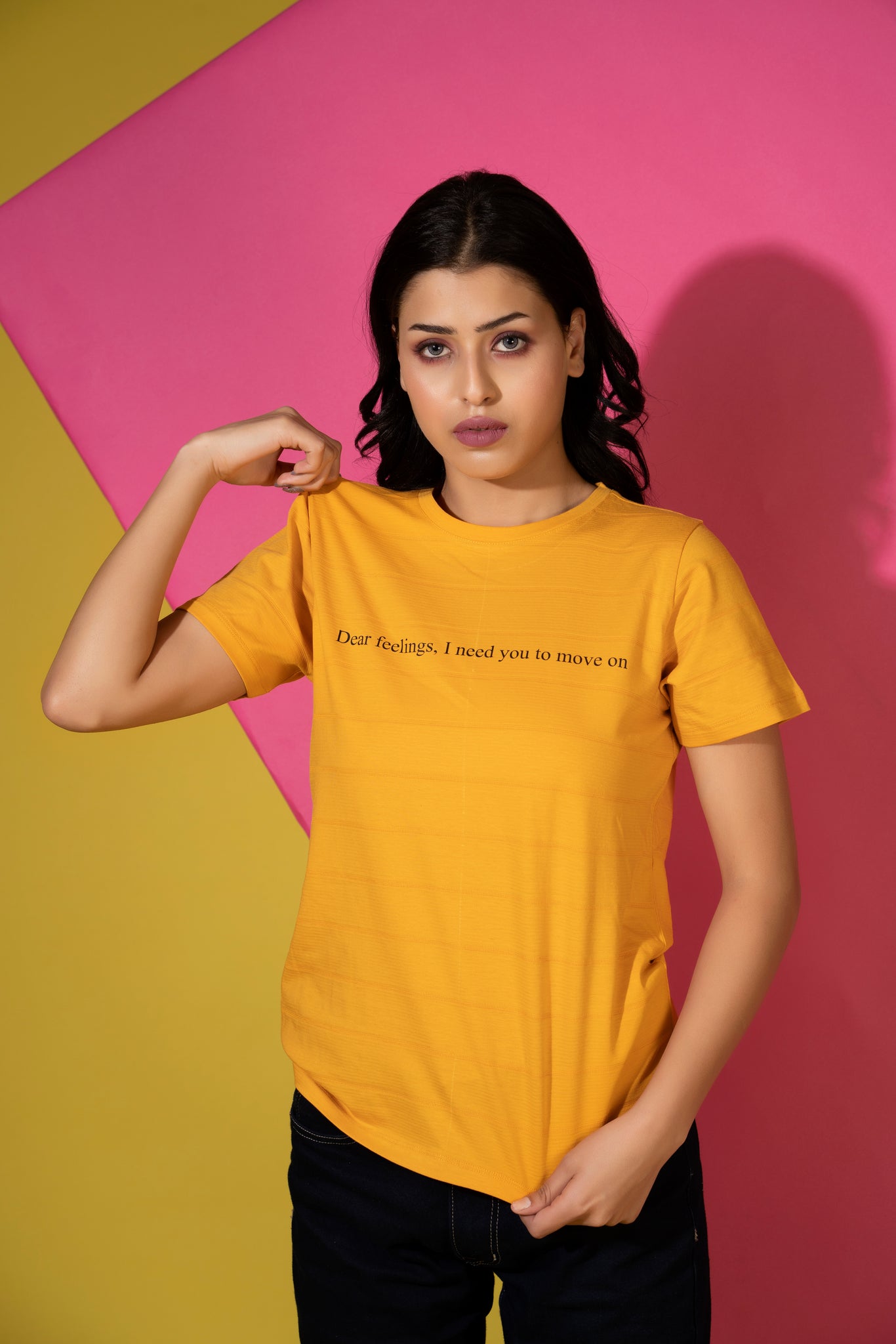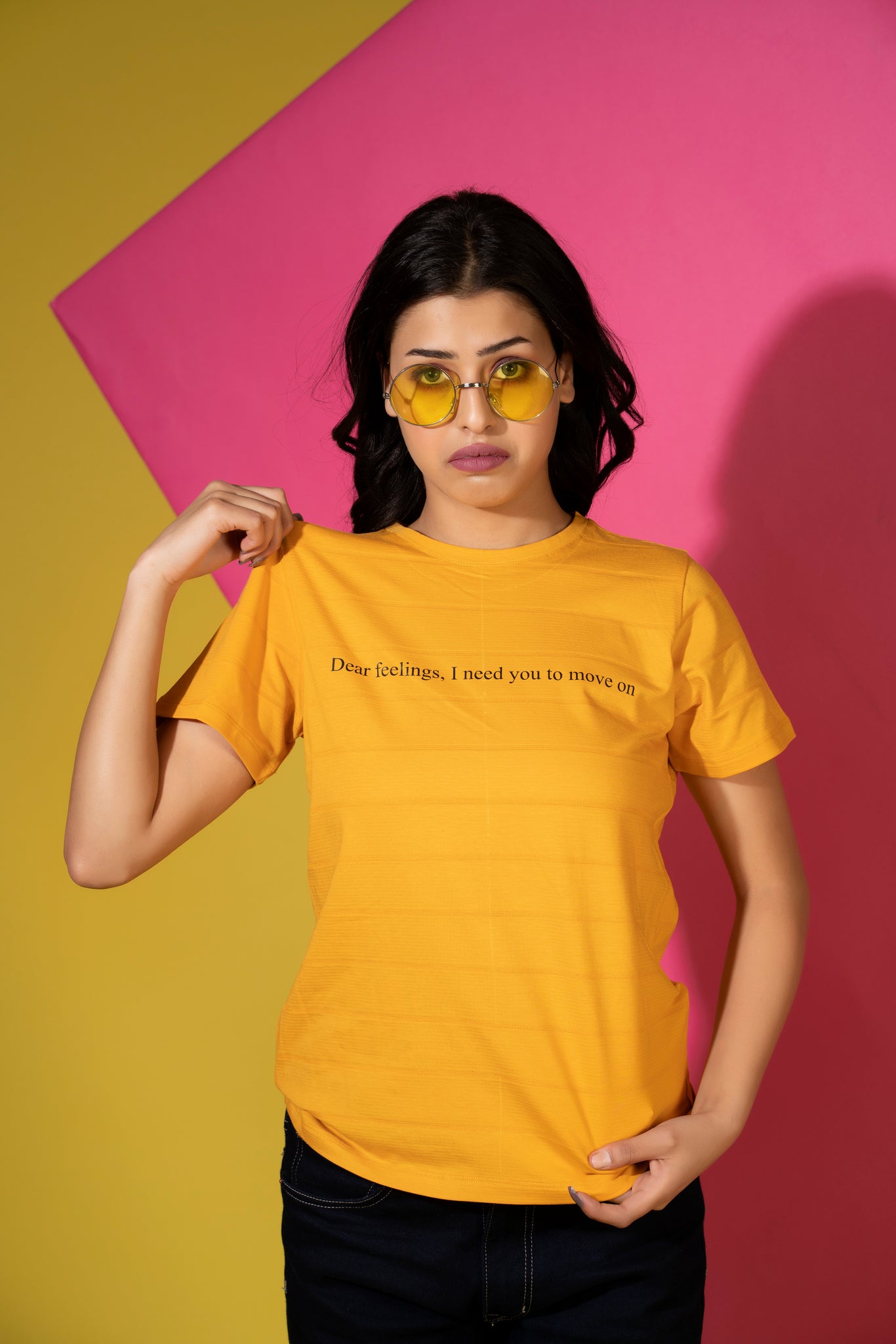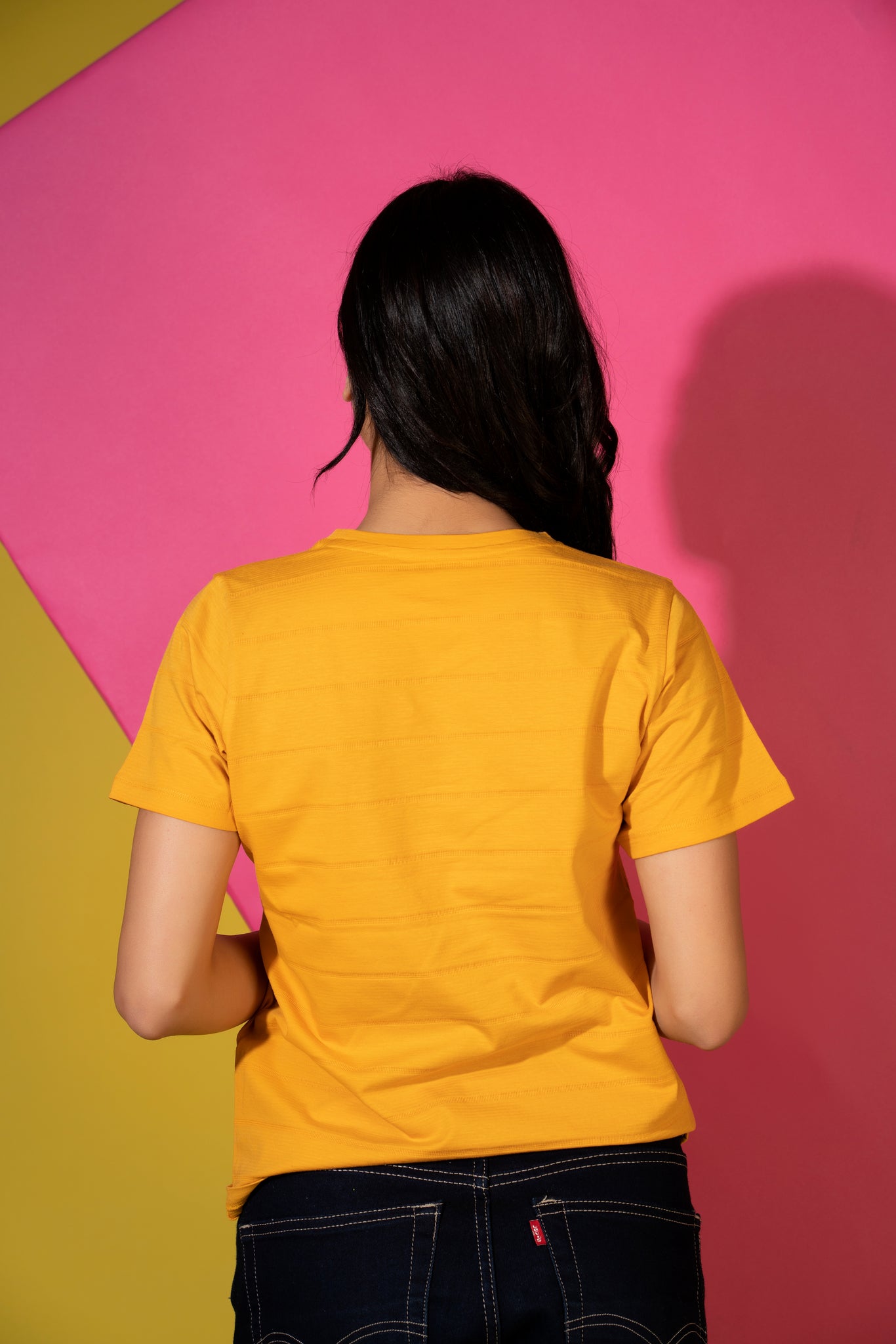 A sunrise yellow t-shirt with round neck & half sleeves.
