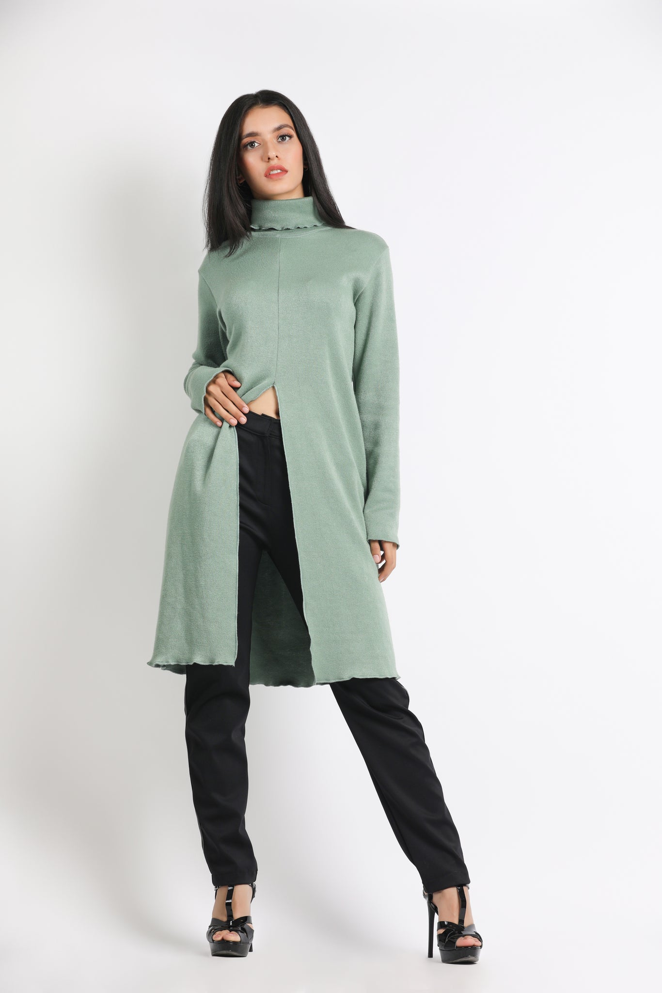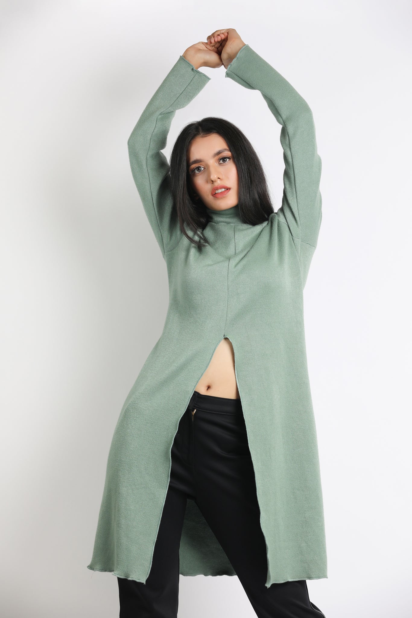 This mint Long woolen dress with cutout details in the front and YMS print at the back is a great addition to your winter wardrobe.