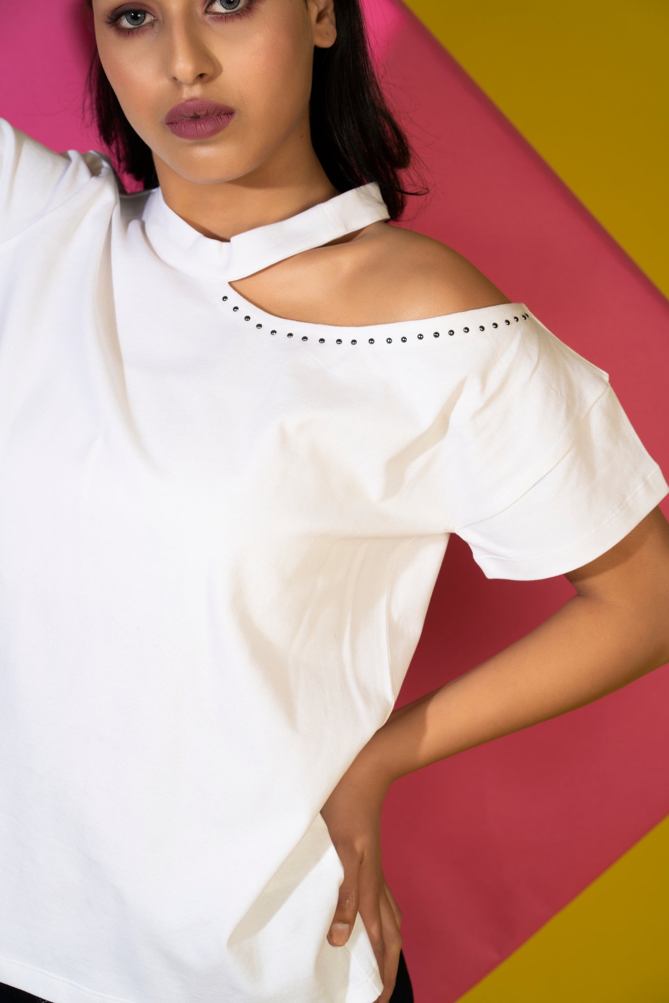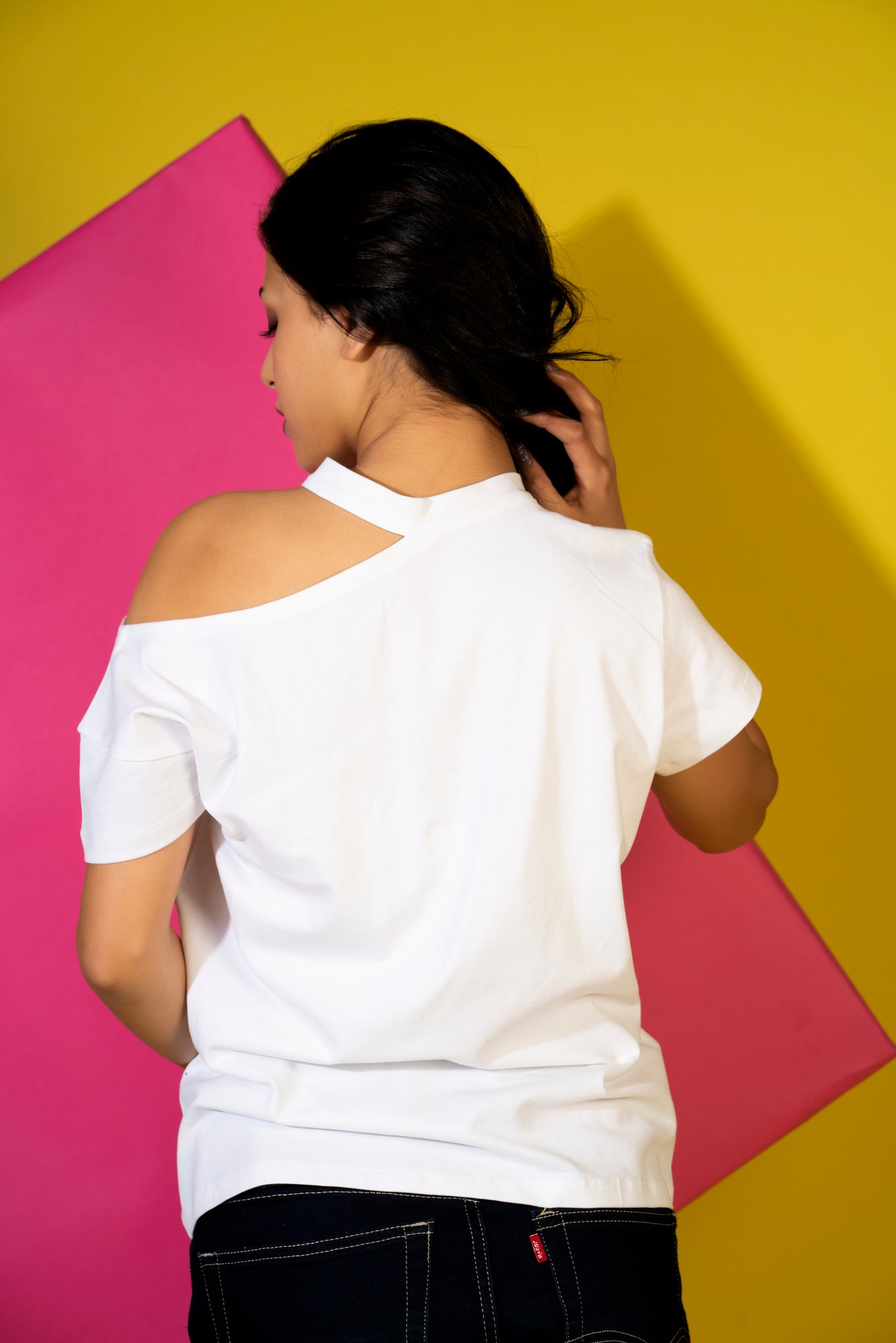 Add comfort to the summer with this one shoulder, cut out white top. It could be your go to piece with all bottoms this season.