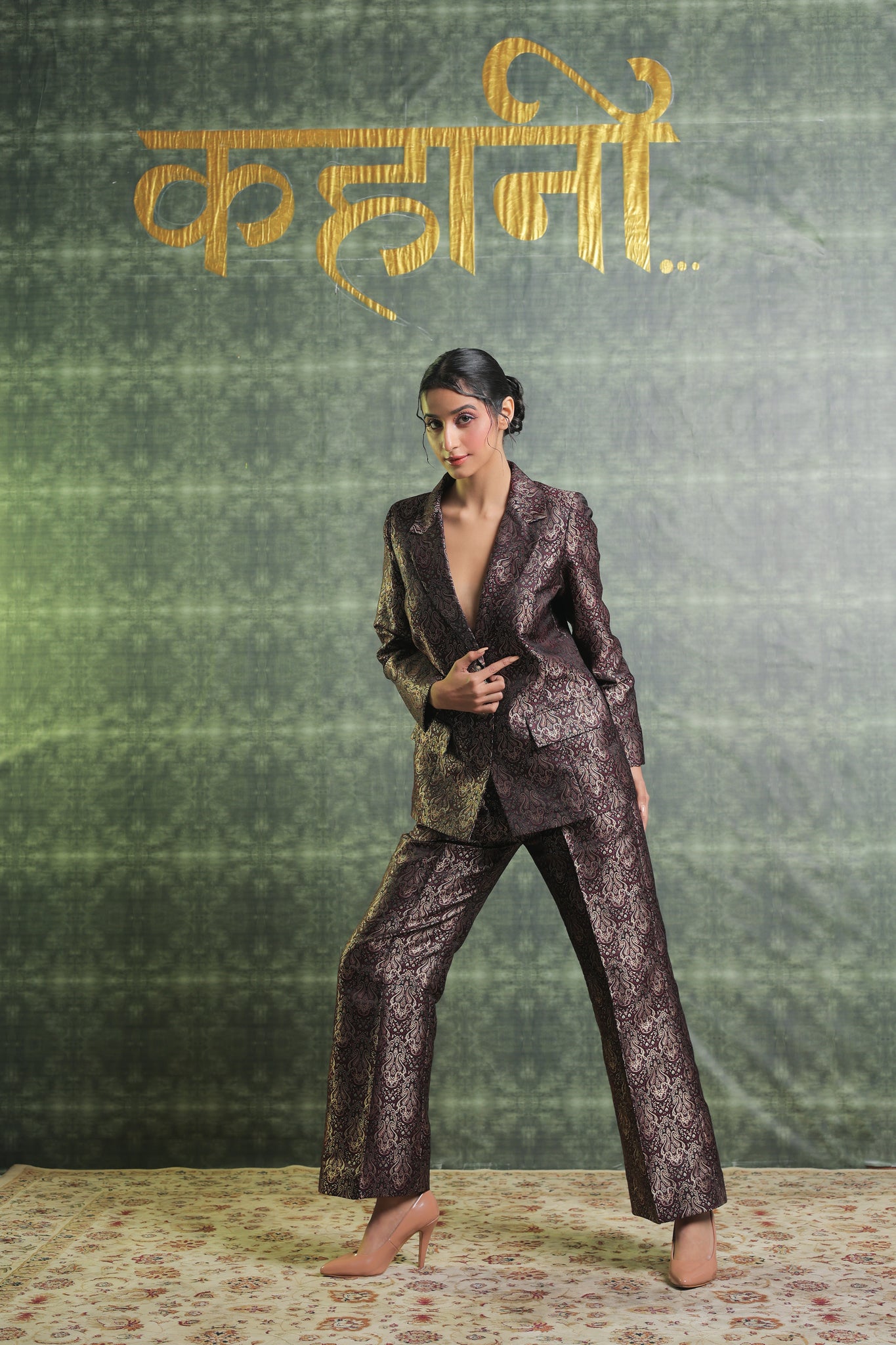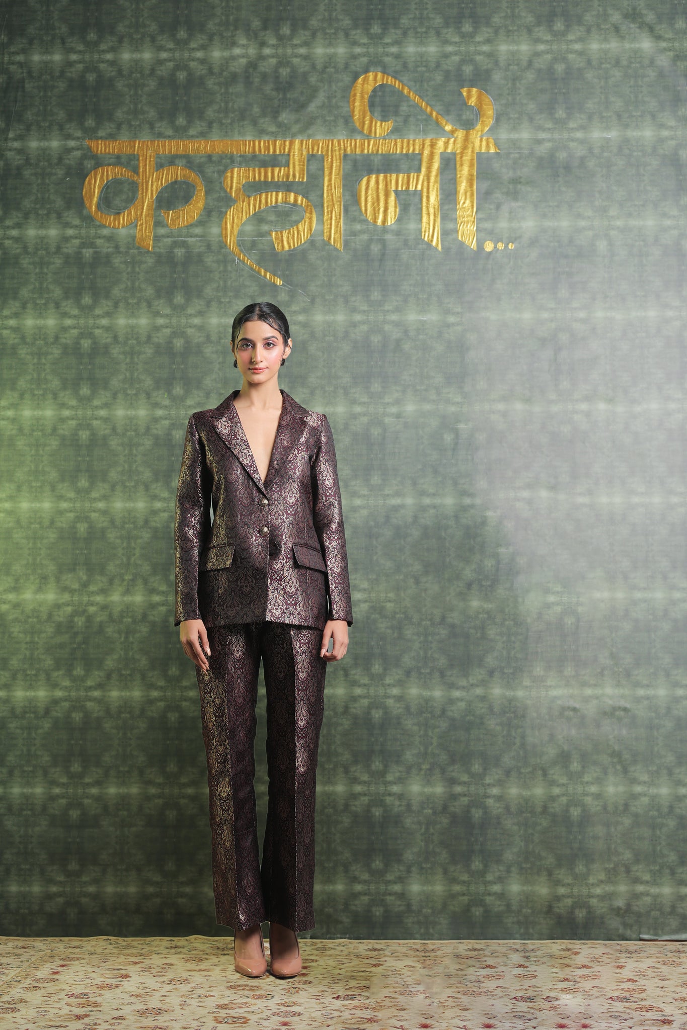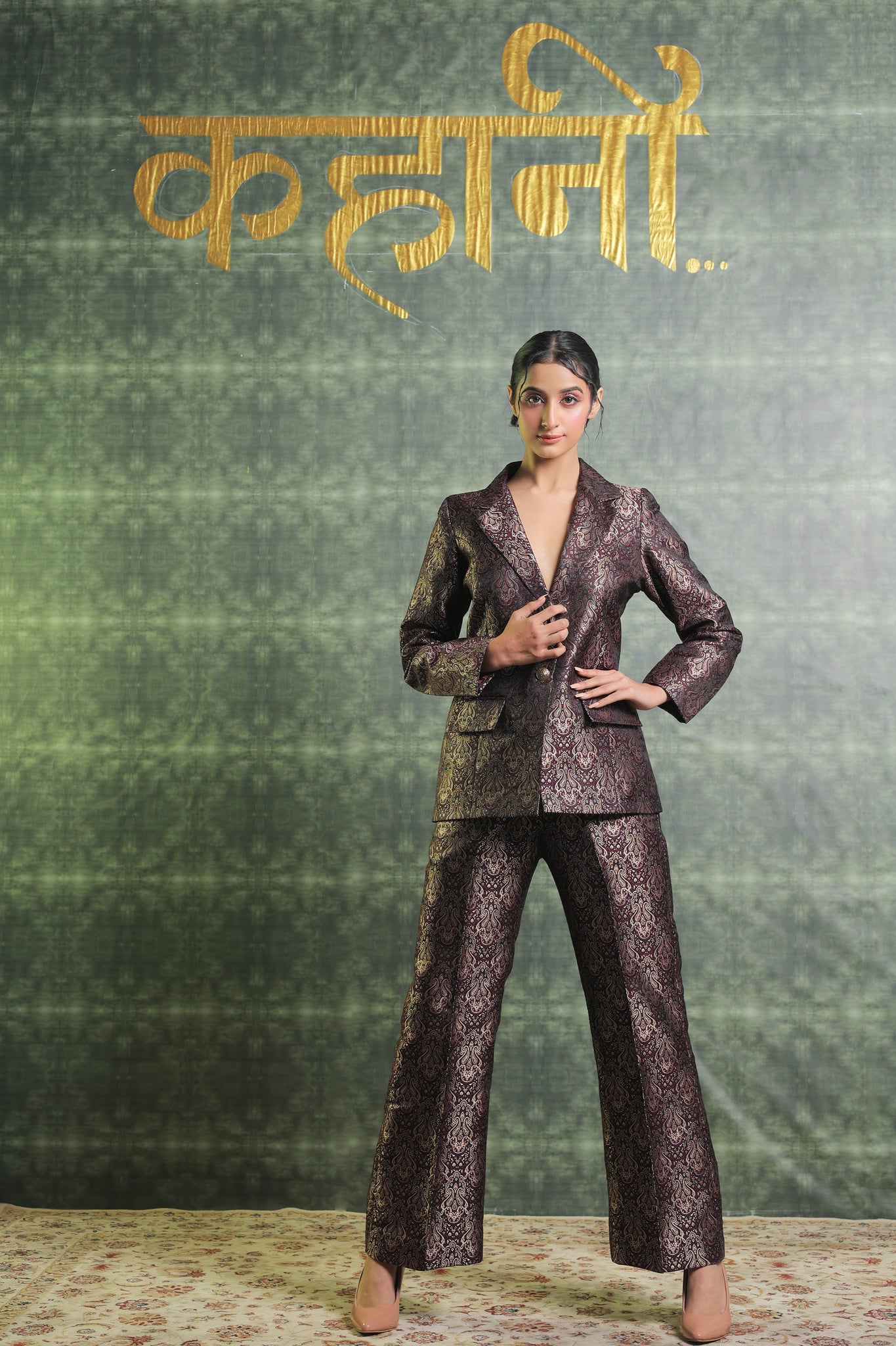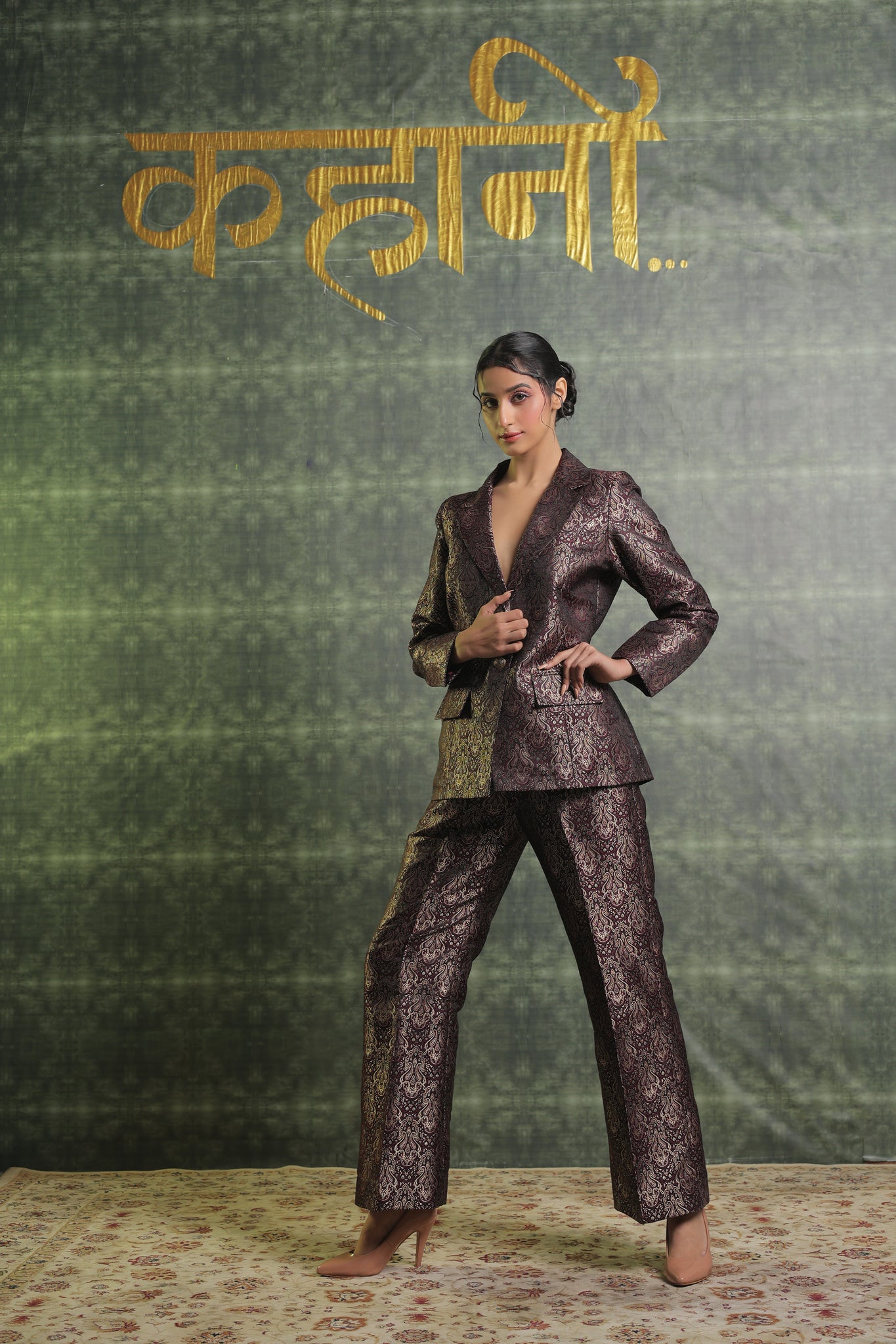 These exquisitely crafted pant suits, with their elaborate brocade designs and premium materials, perfectly combine classic elegance with contemporary design. This Power Suit from Your Mine Story, with its two button opening and broad collar design, will breathe new life into your wardrobe. Style it with a stunning necklace to give it an Indo - western Look. Get a Customised Fit in this Pant Suit.