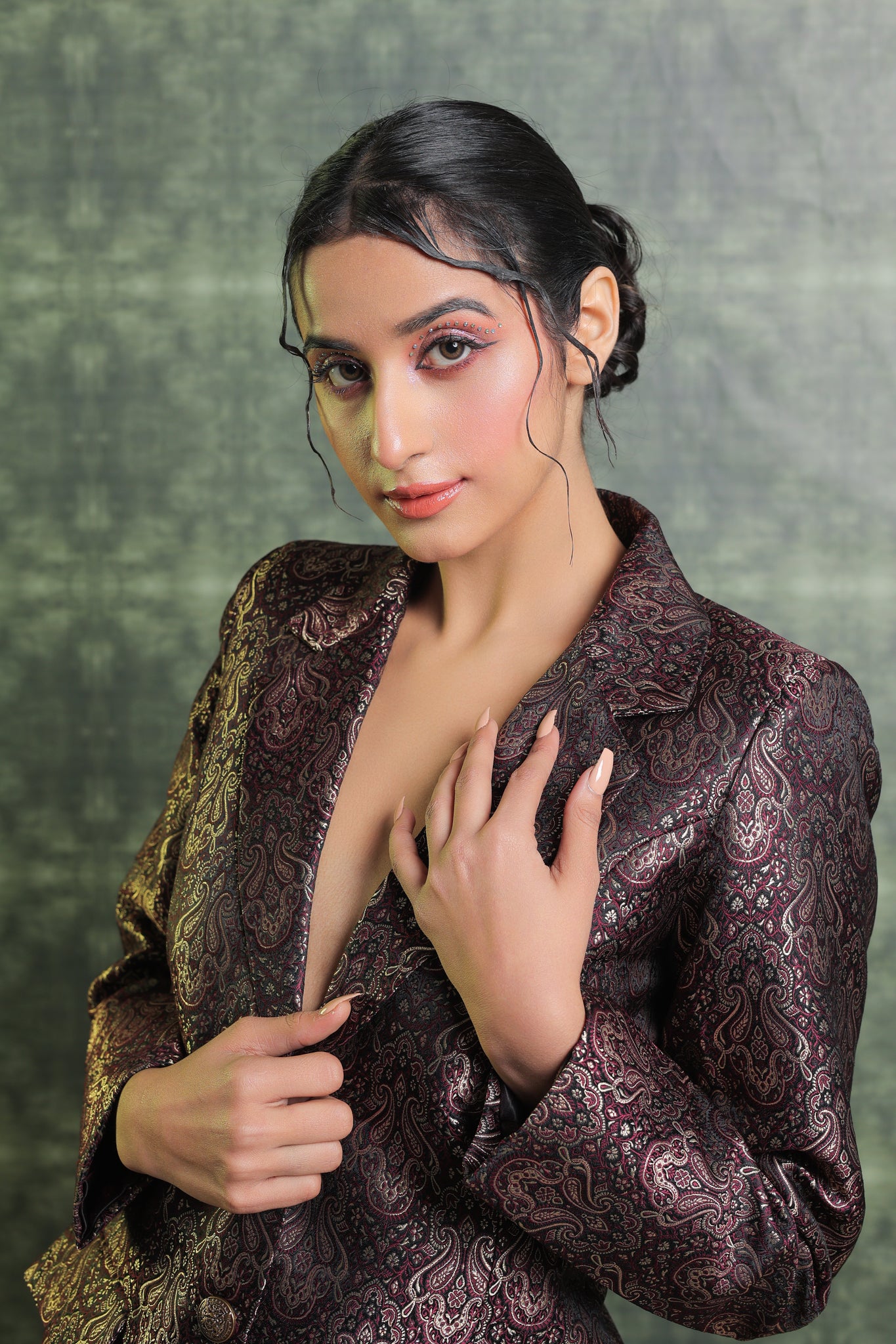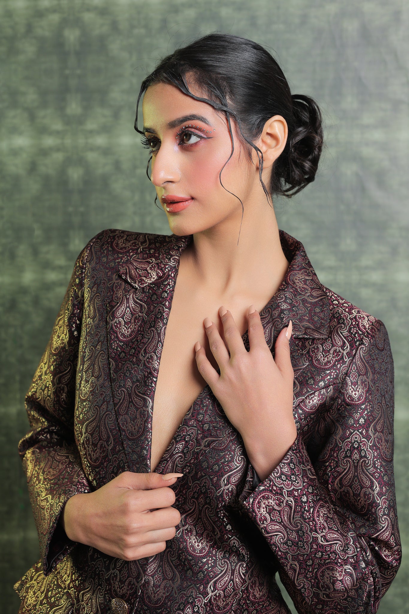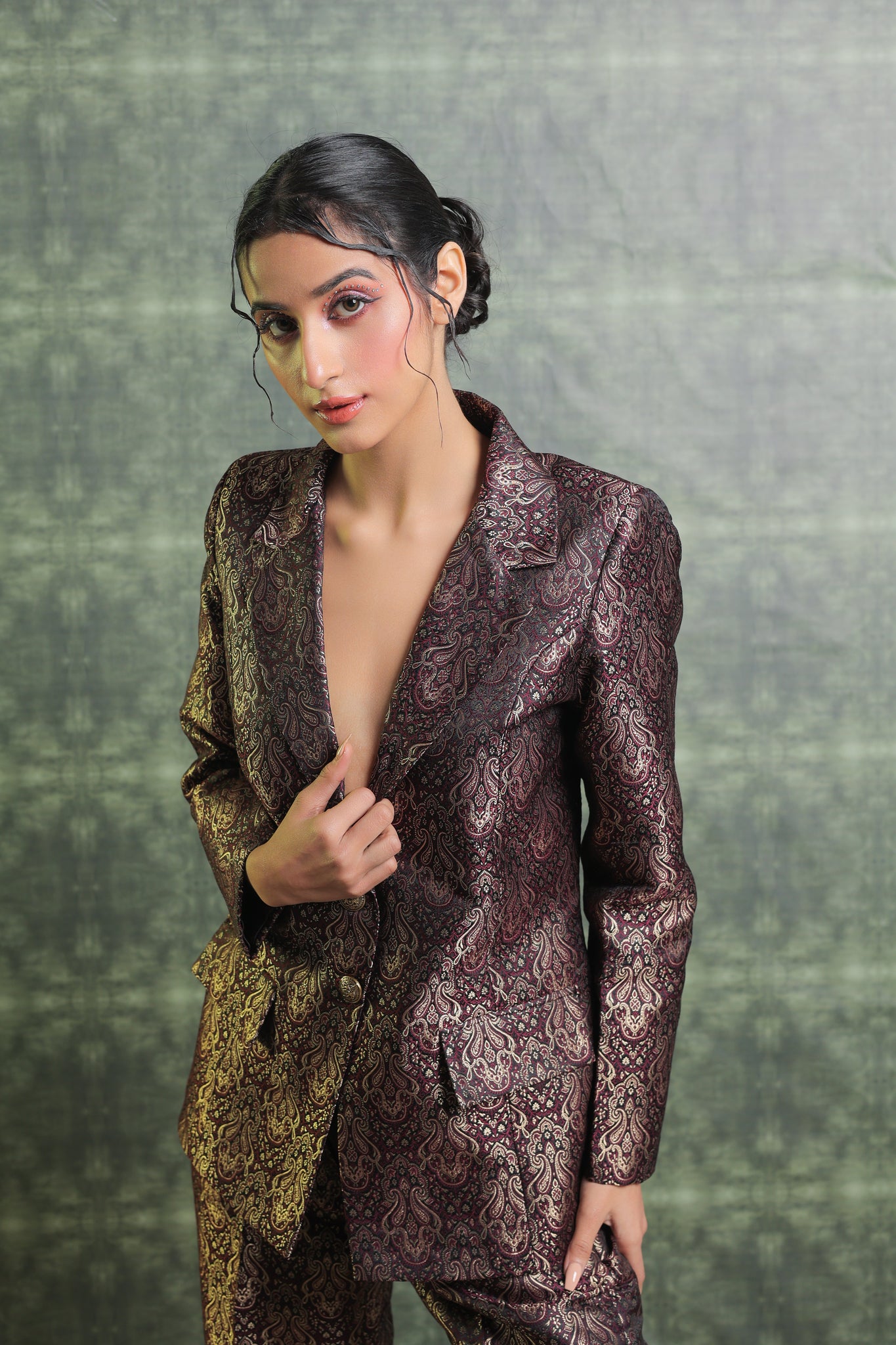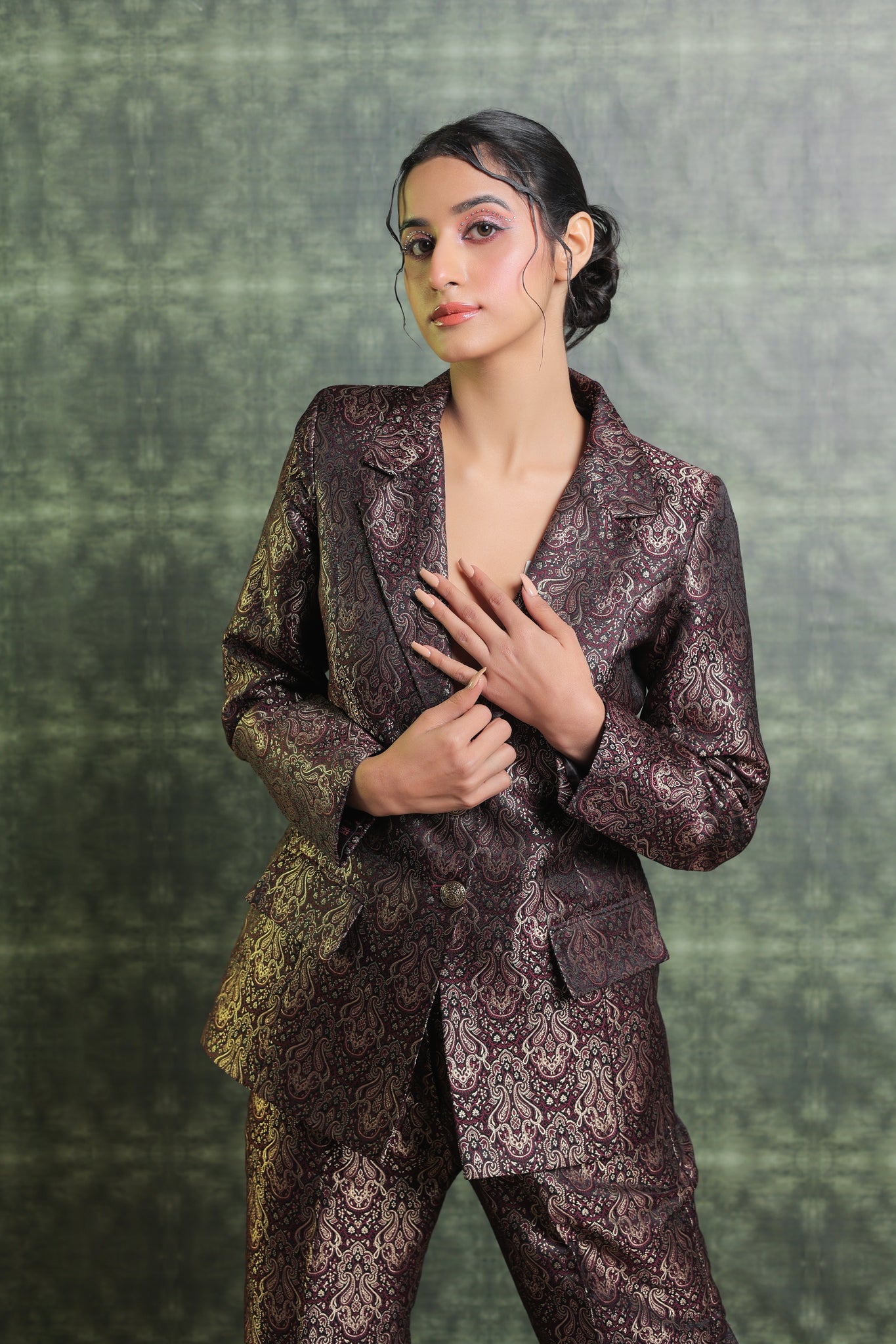 These exquisitely crafted pant suits, with their elaborate brocade designs and premium materials, perfectly combine classic elegance with contemporary design. This Power Suit from Your Mine Story, with its two button opening and broad collar design, will breathe new life into your wardrobe. Style it with a stunning necklace to give it an Indo - western Look. Get a Customised Fit in this Pant Suit.