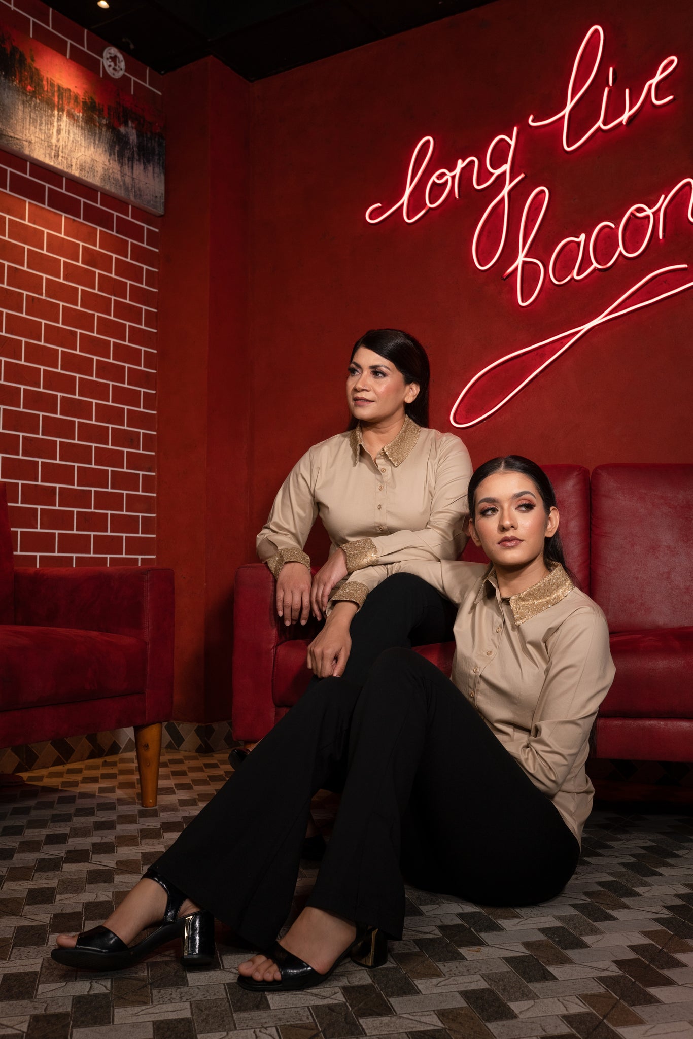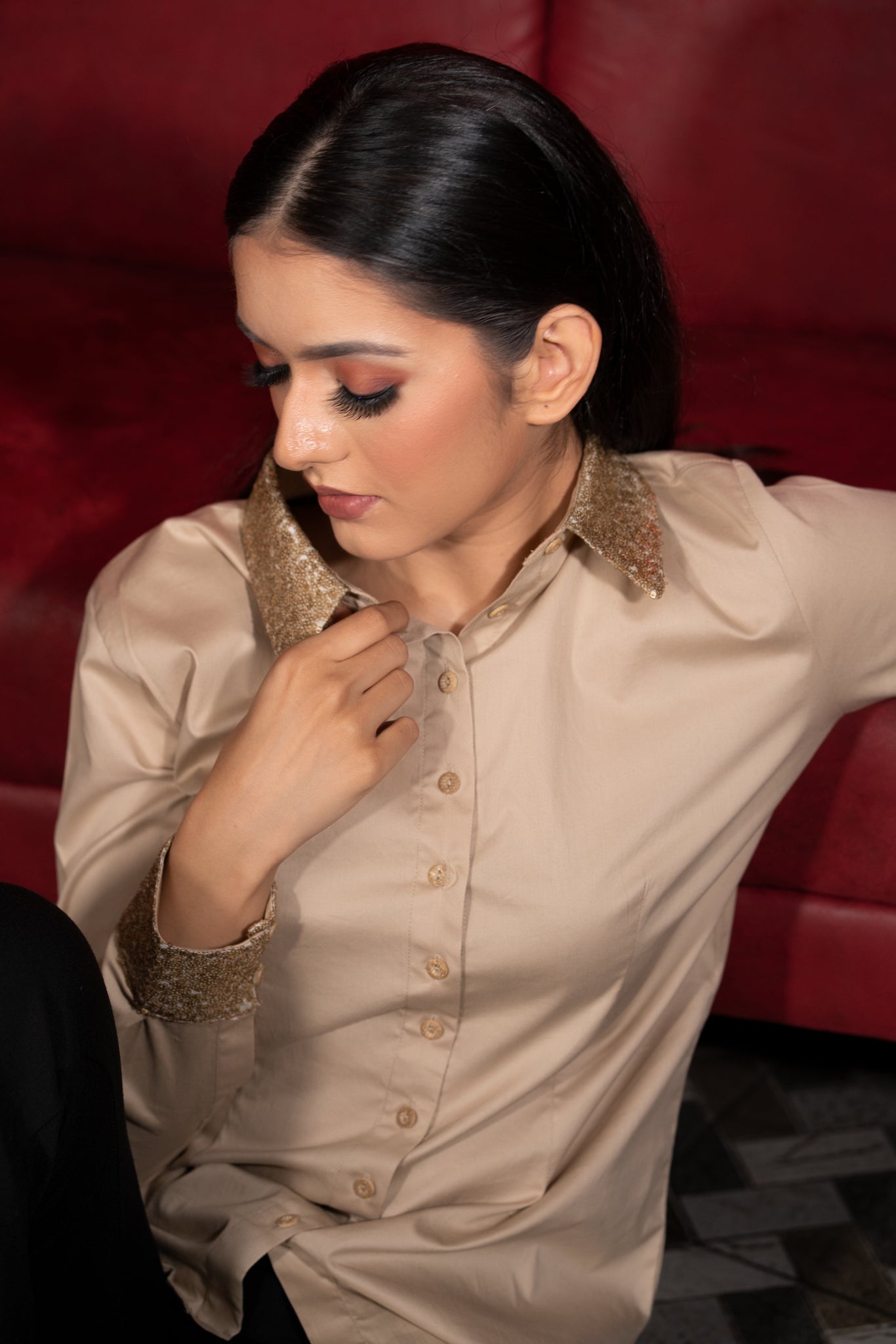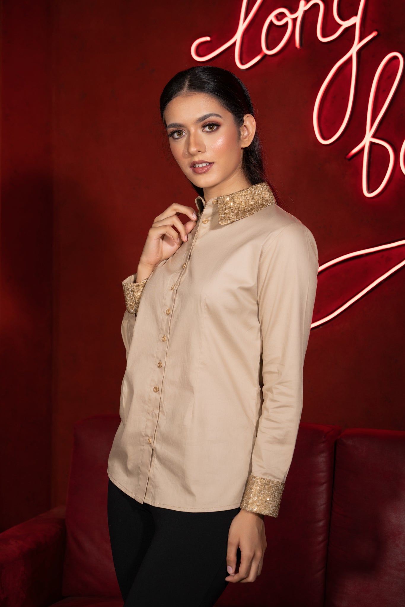 When you want a work wardrobe that is subtle and stylish make this light beige formal shirt your business, complementing sequins on the collar and cuffs of sleeves with front button closure.