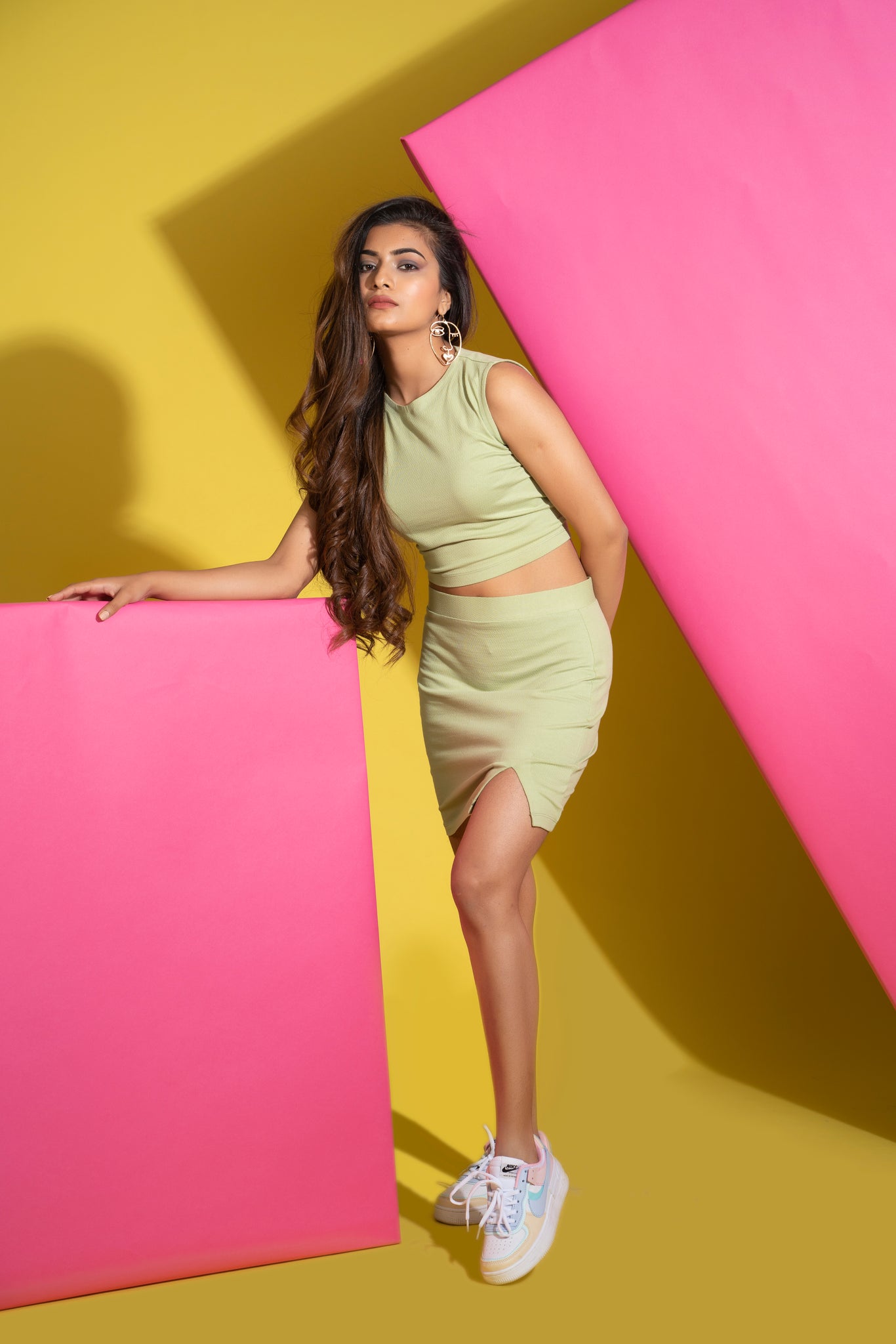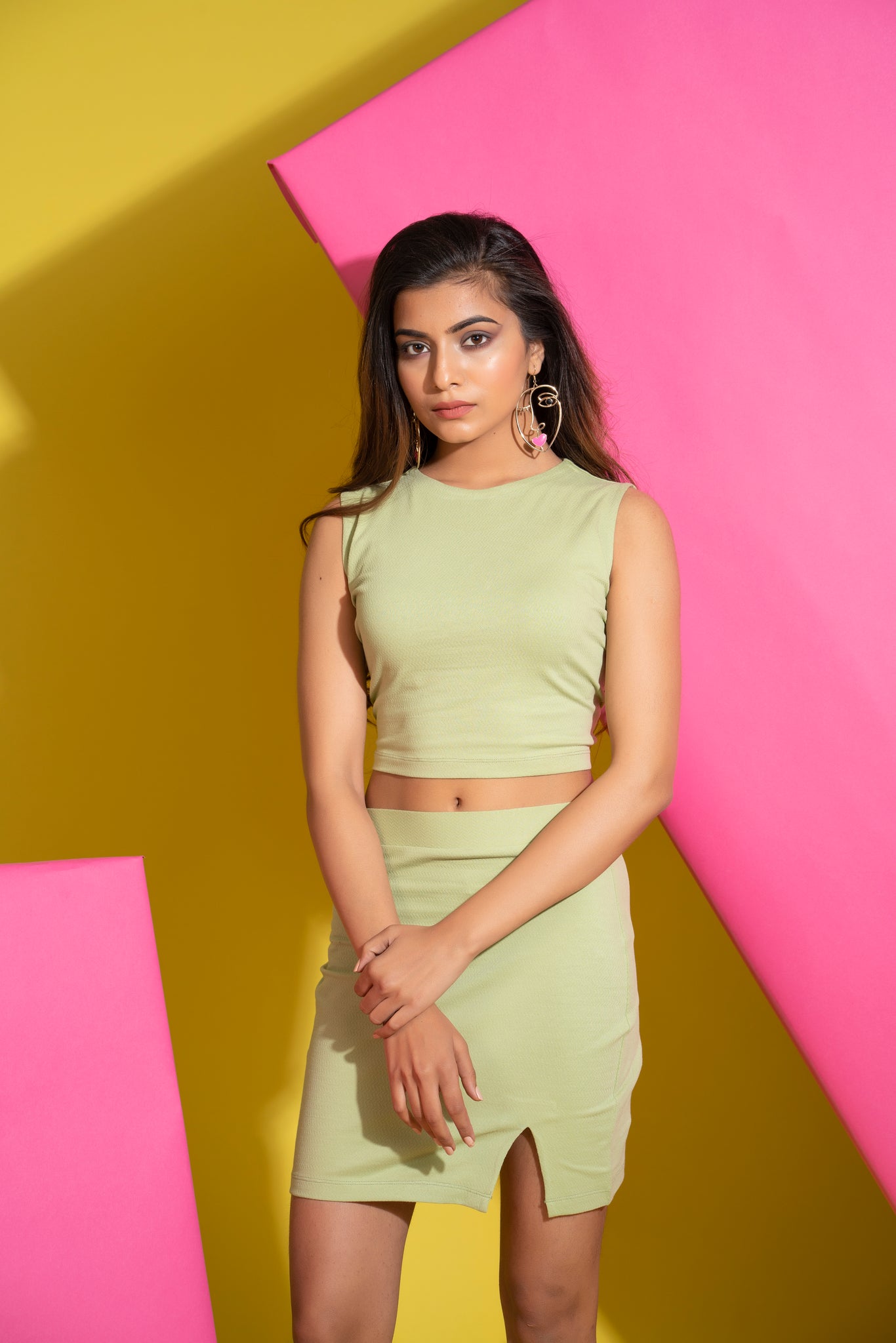Refresh your wardrobe with this easy breezy mint coloured crop top paired with front cut & elastic waistband skirt.