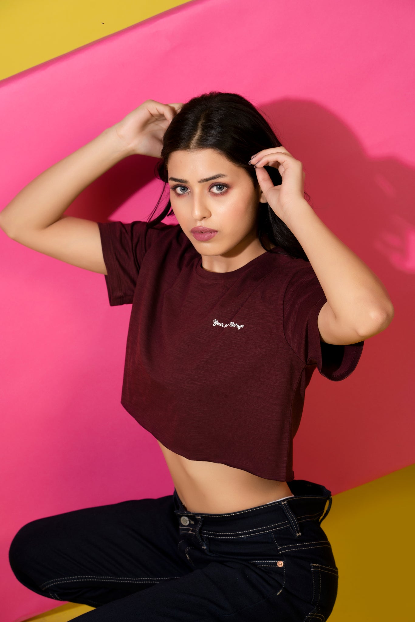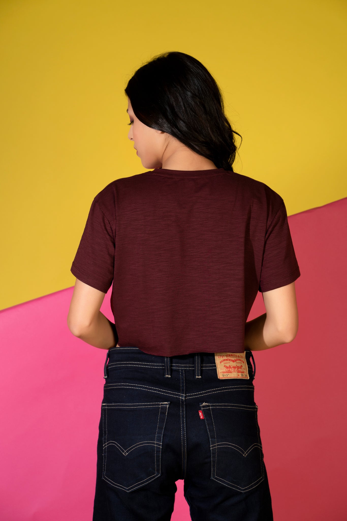 This wine coloured crop t-shirt is made in a fabric that is super soft and comfortable.
