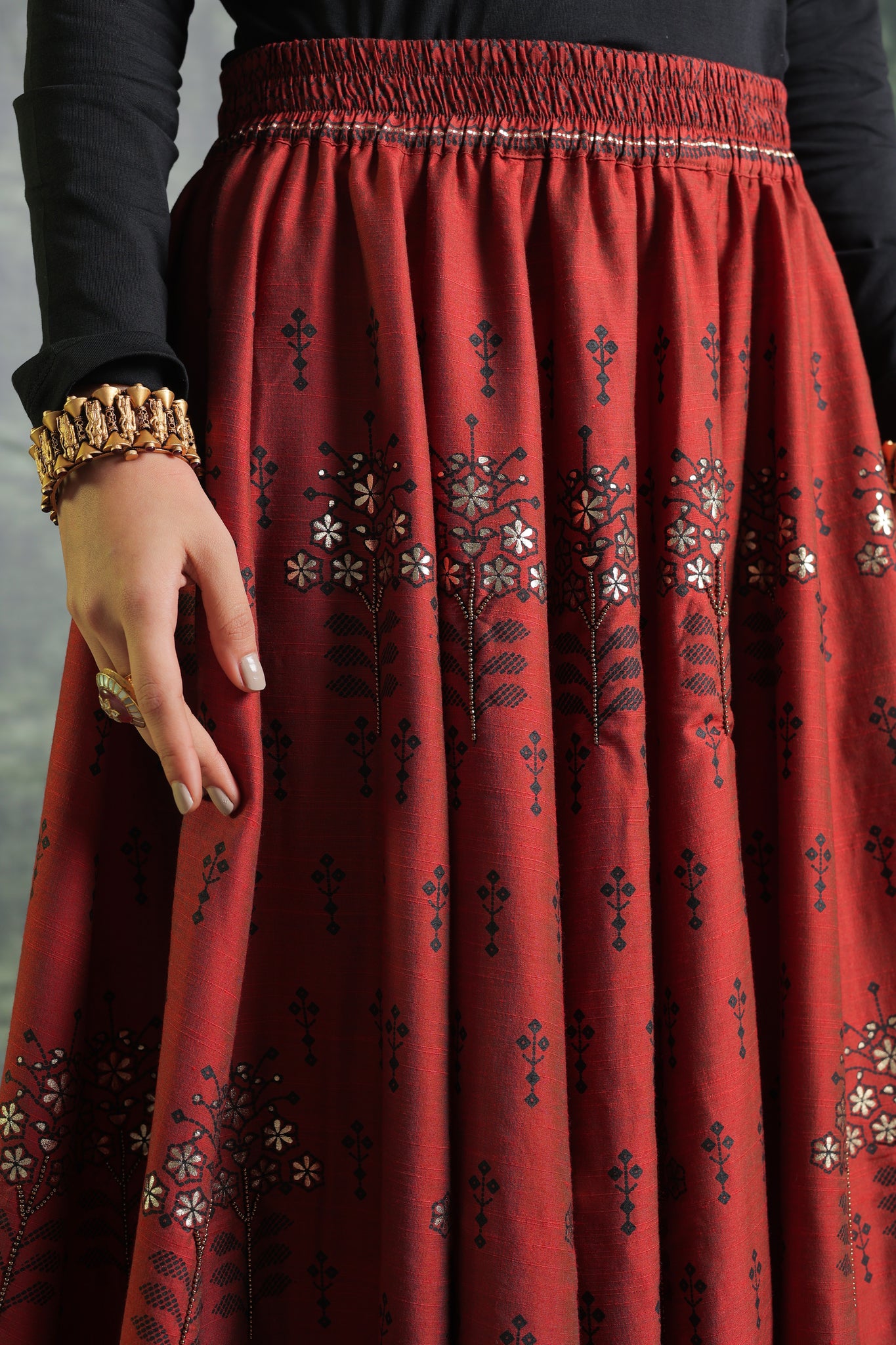 This exquisitely designed ethnic long skirt with pockets and an elastic waist belt exudes a festive feeling. Wear it with traditional jewellery to achieve an Indo-Western look. In terms of fashion, traditional long skirts are making its comeback!...Read more