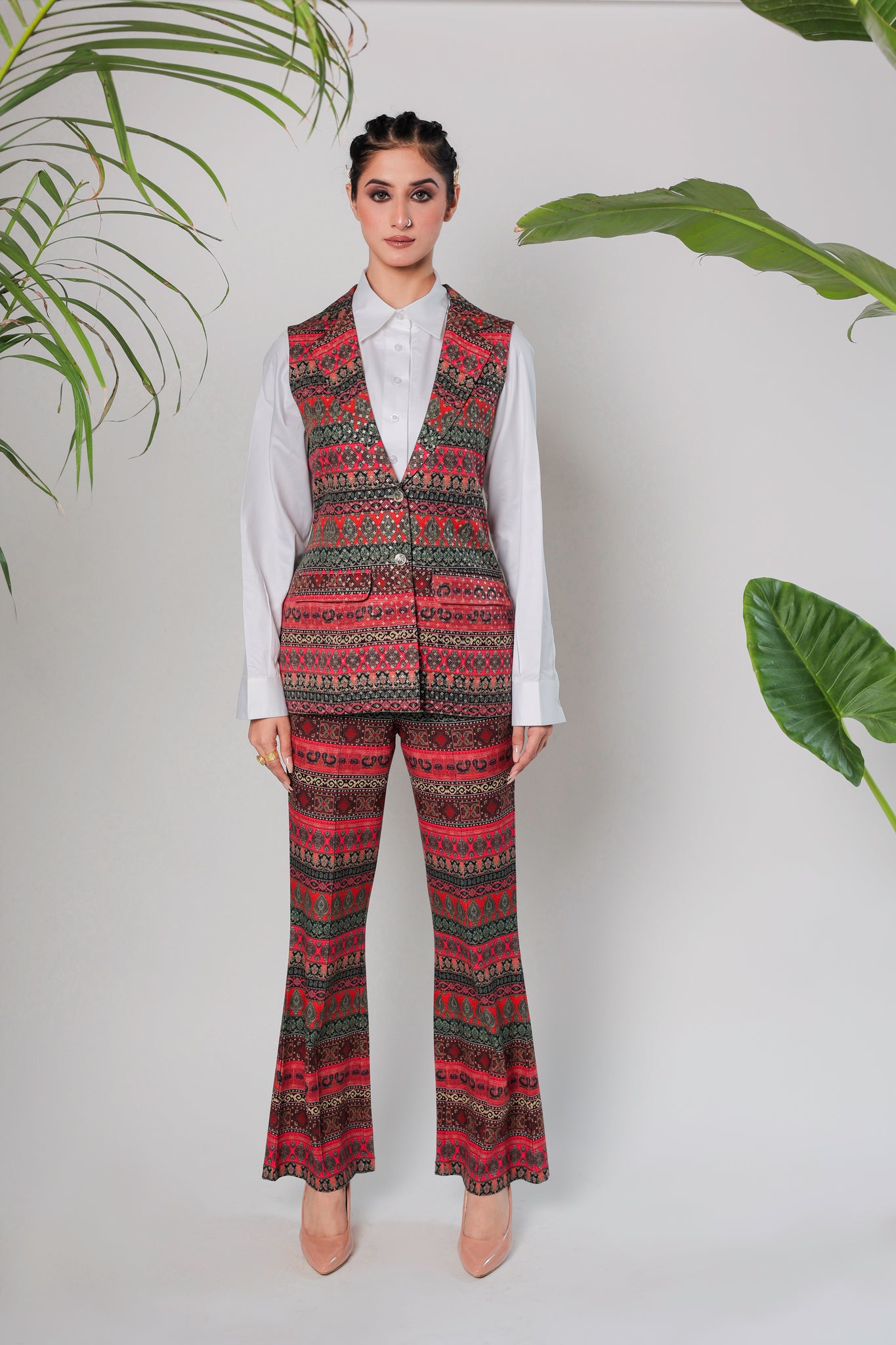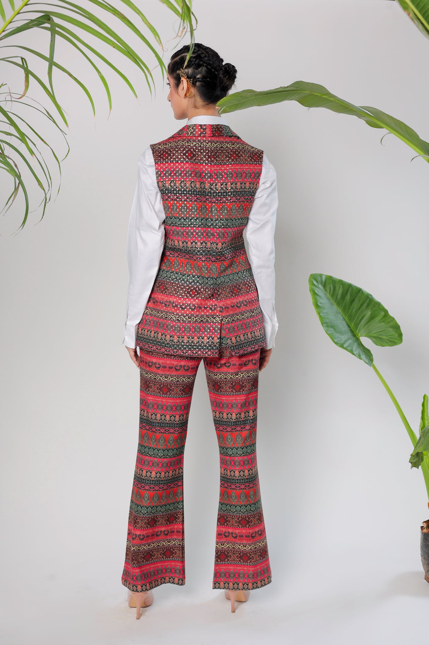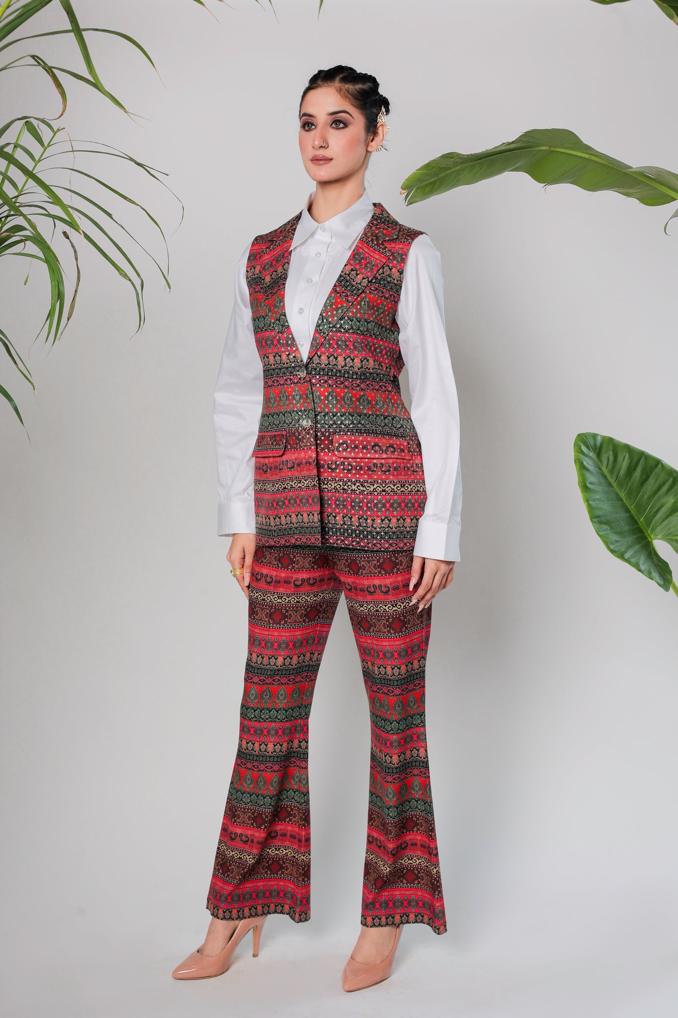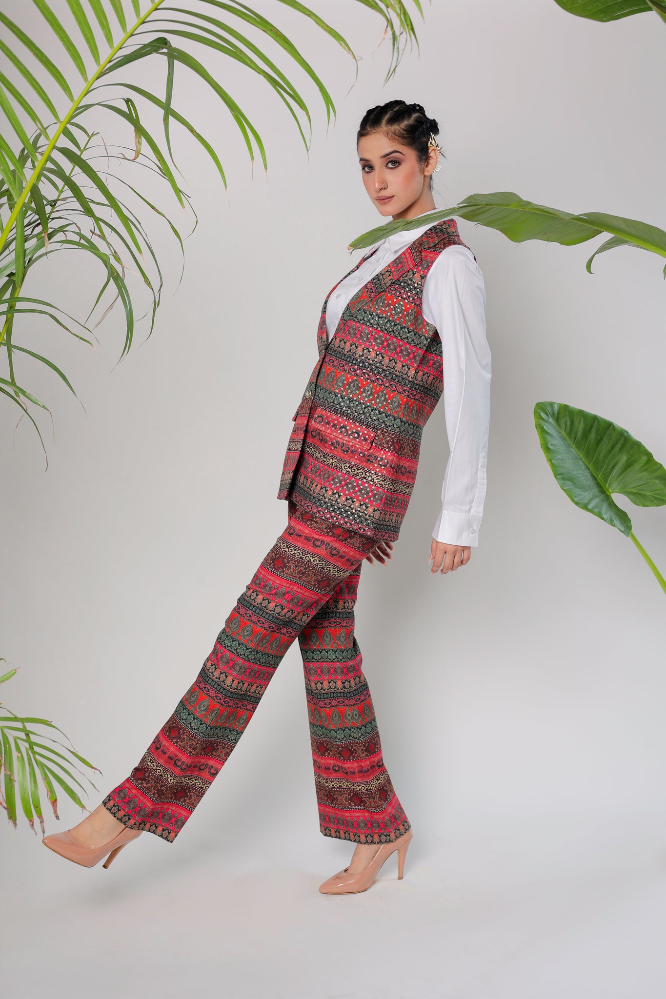 This modern sleeveless pant suit stands out because of its exquisite print detailing! This pant suit's trendy silhouette makes it ideal for your formal evenings! Give it a western outlook by pairing it with a nice choker!