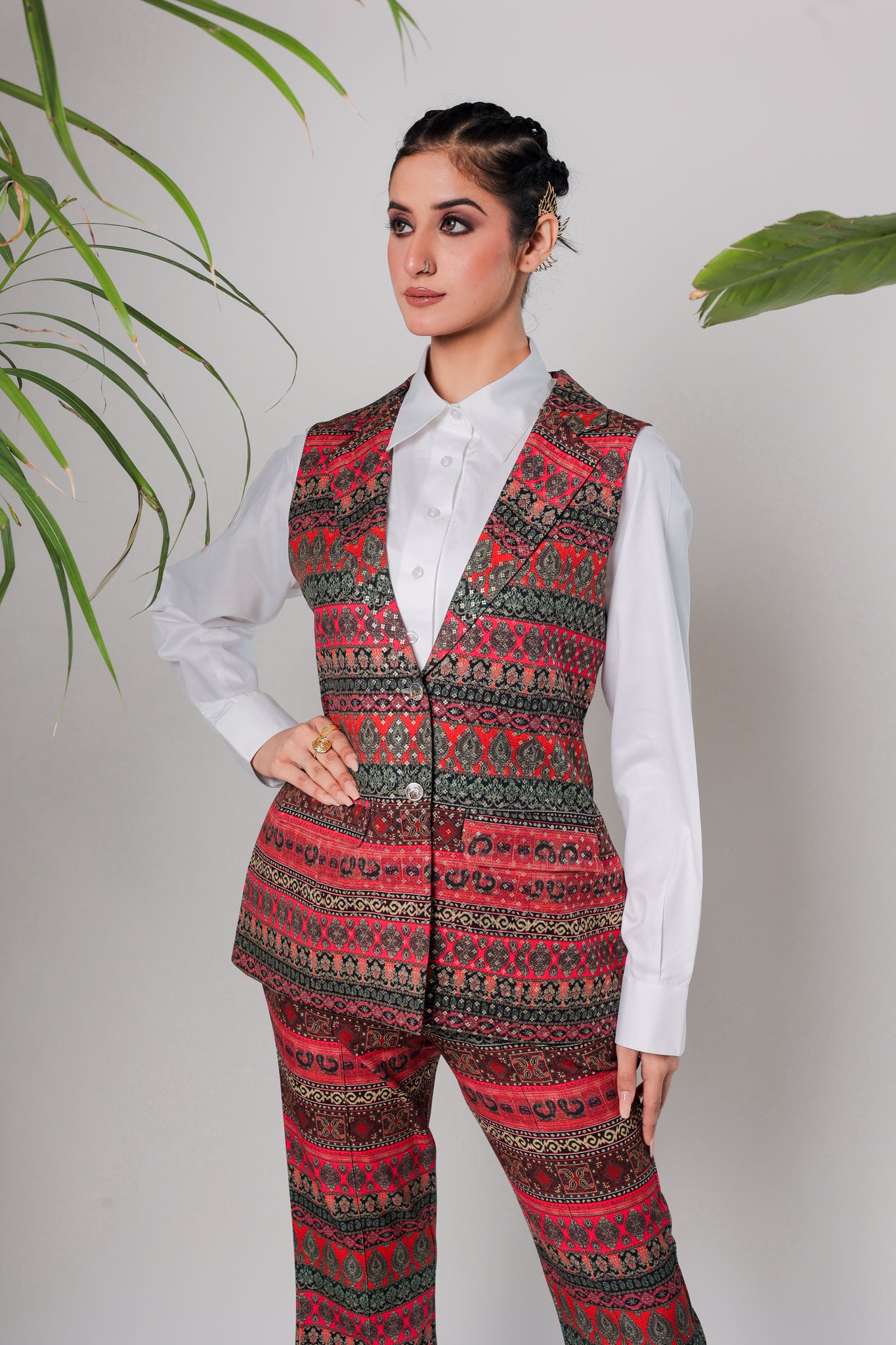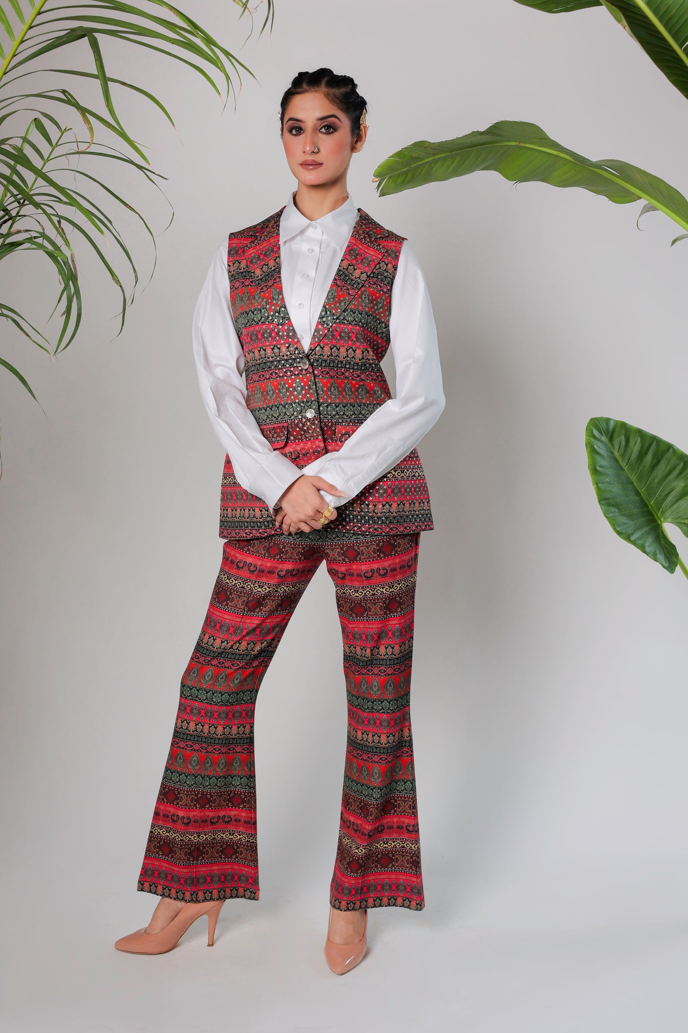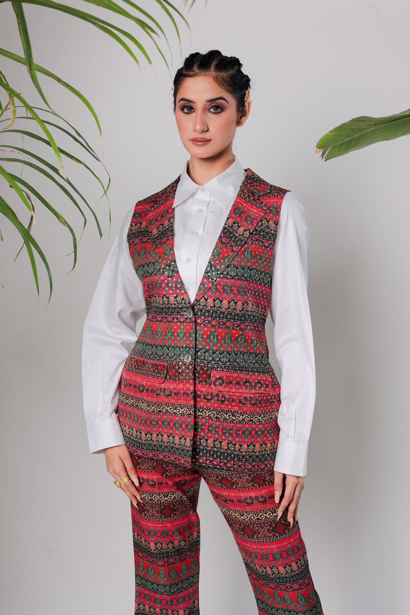 This modern sleeveless pant suit stands out because of its exquisite print detailing! This pant suit's trendy silhouette makes it ideal for your formal evenings! Give it a western outlook by pairing it with a nice choker!