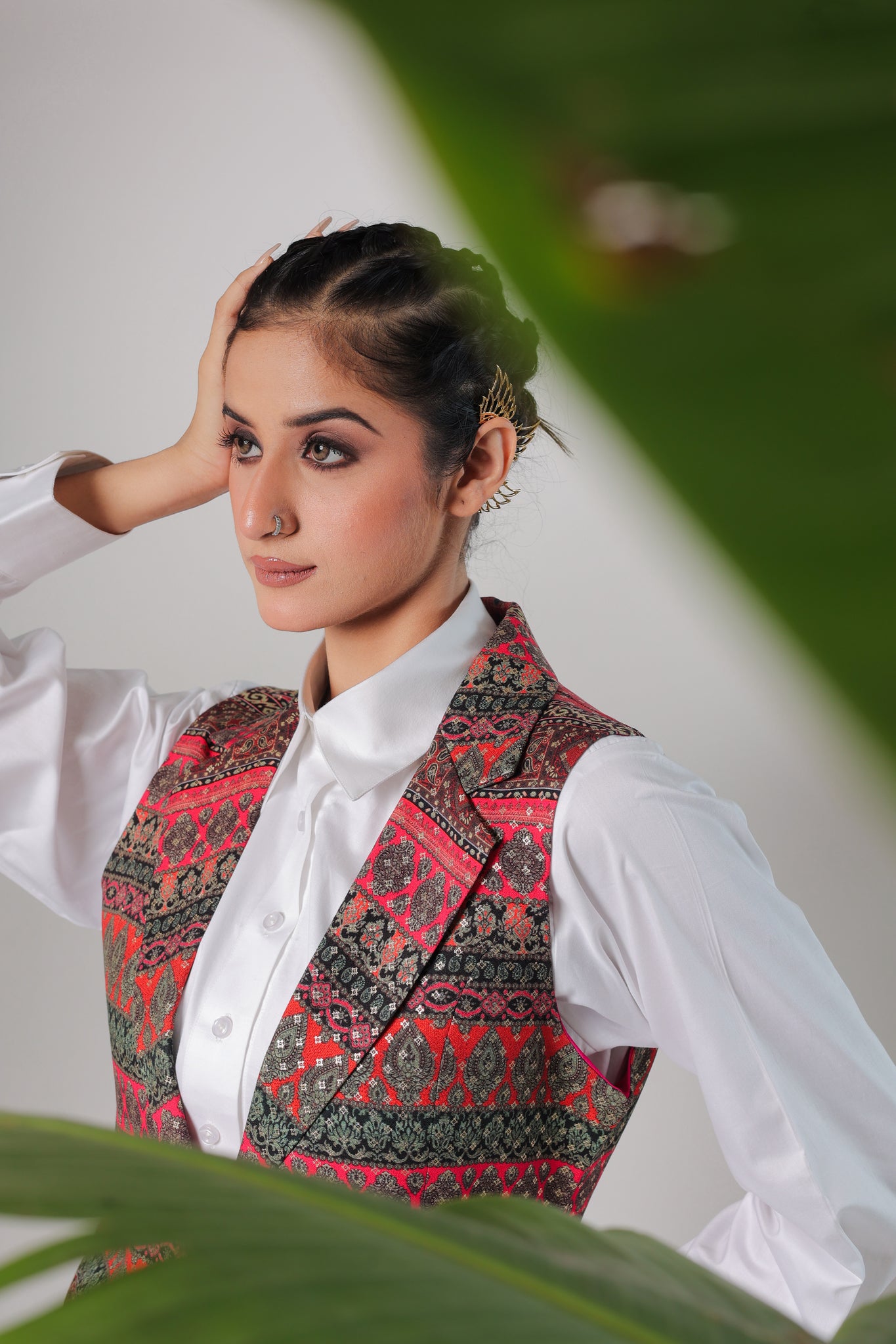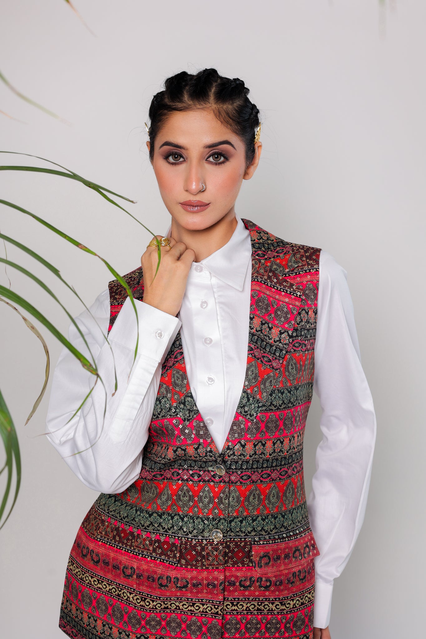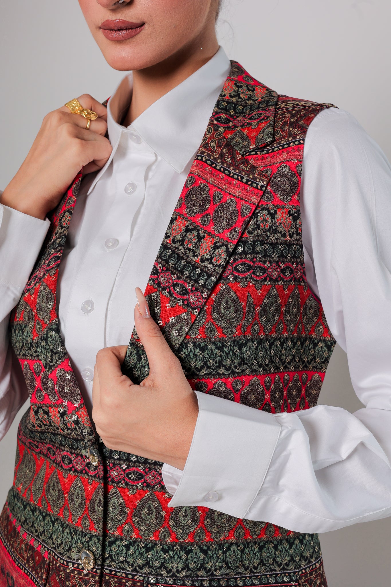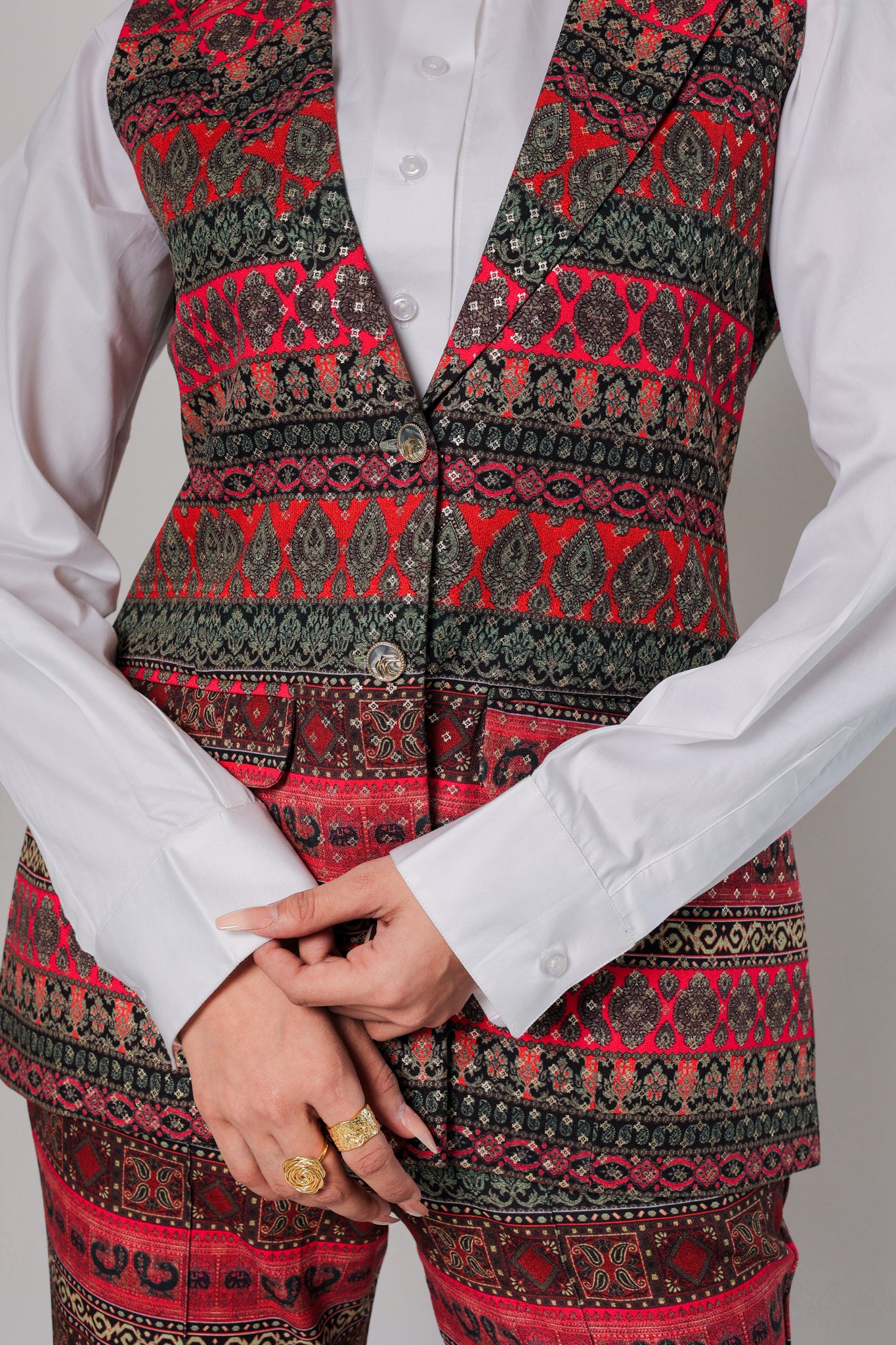 This modern sleeveless pant suit stands out because of its exquisite print detailing! This pant suit's trendy silhouette makes it ideal for your formal evenings! Give it a western outlook by pairing it with a nice choker!