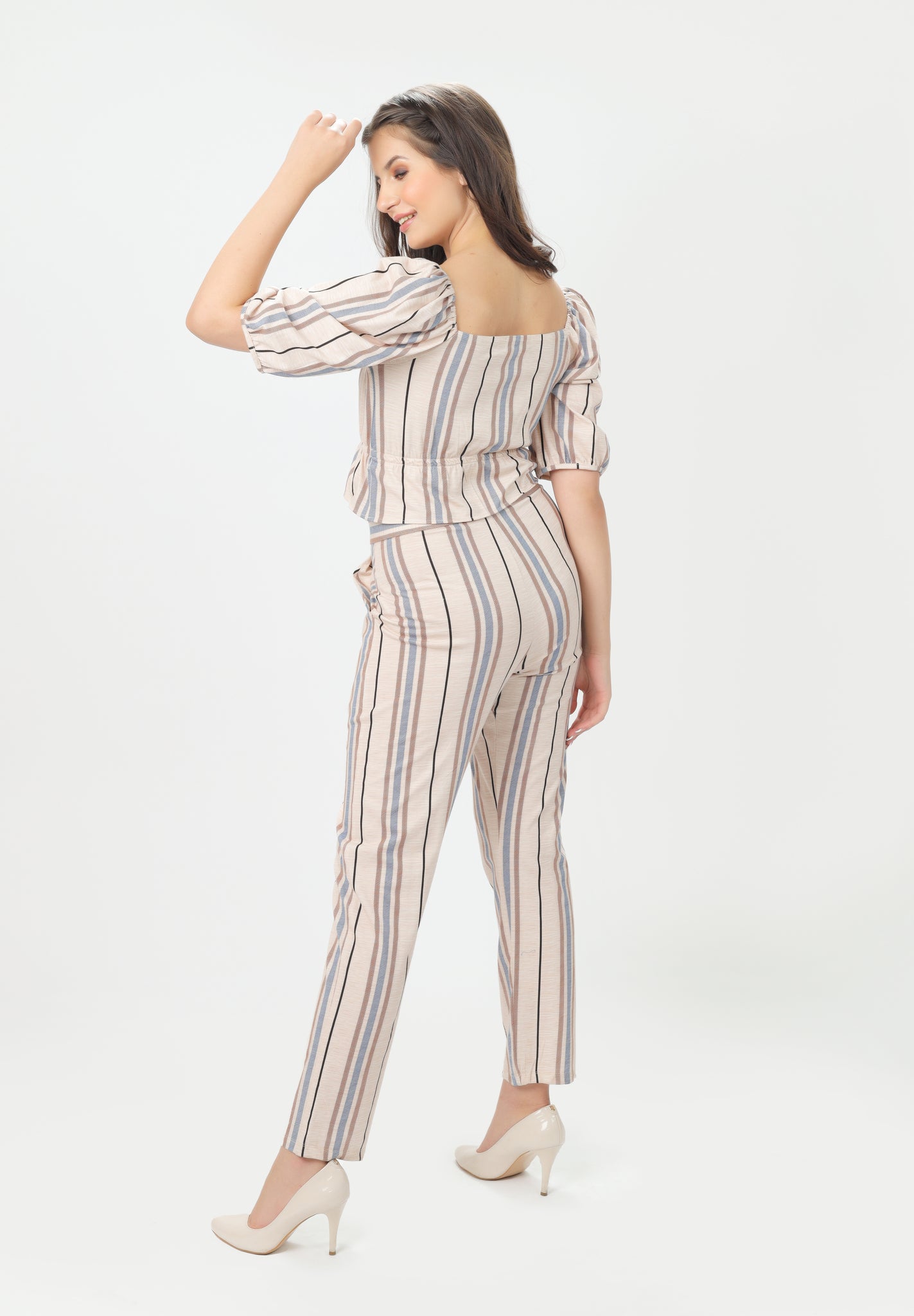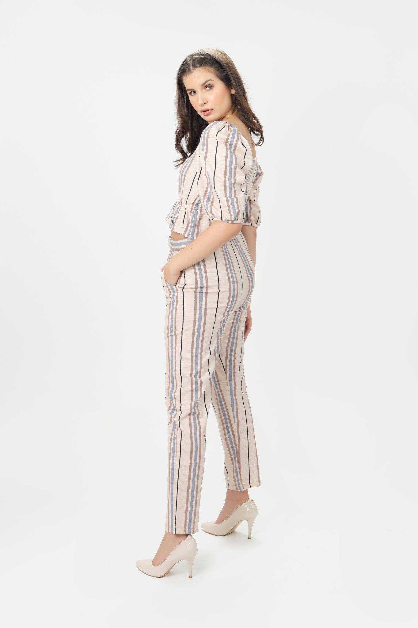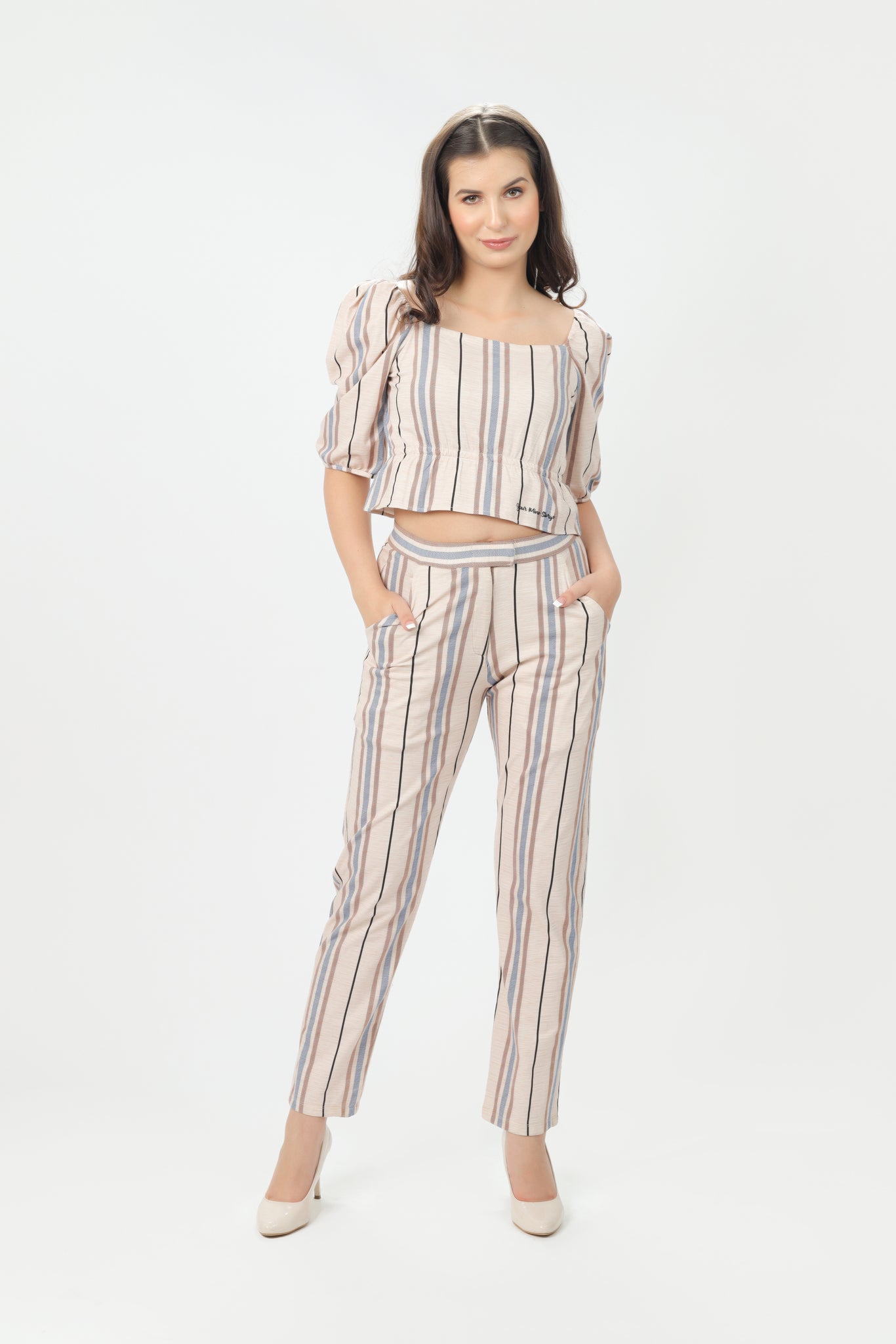 This striped printed coord set with puff sleeves and crop top is suitable for any season. Rock it on your next Girls day out!