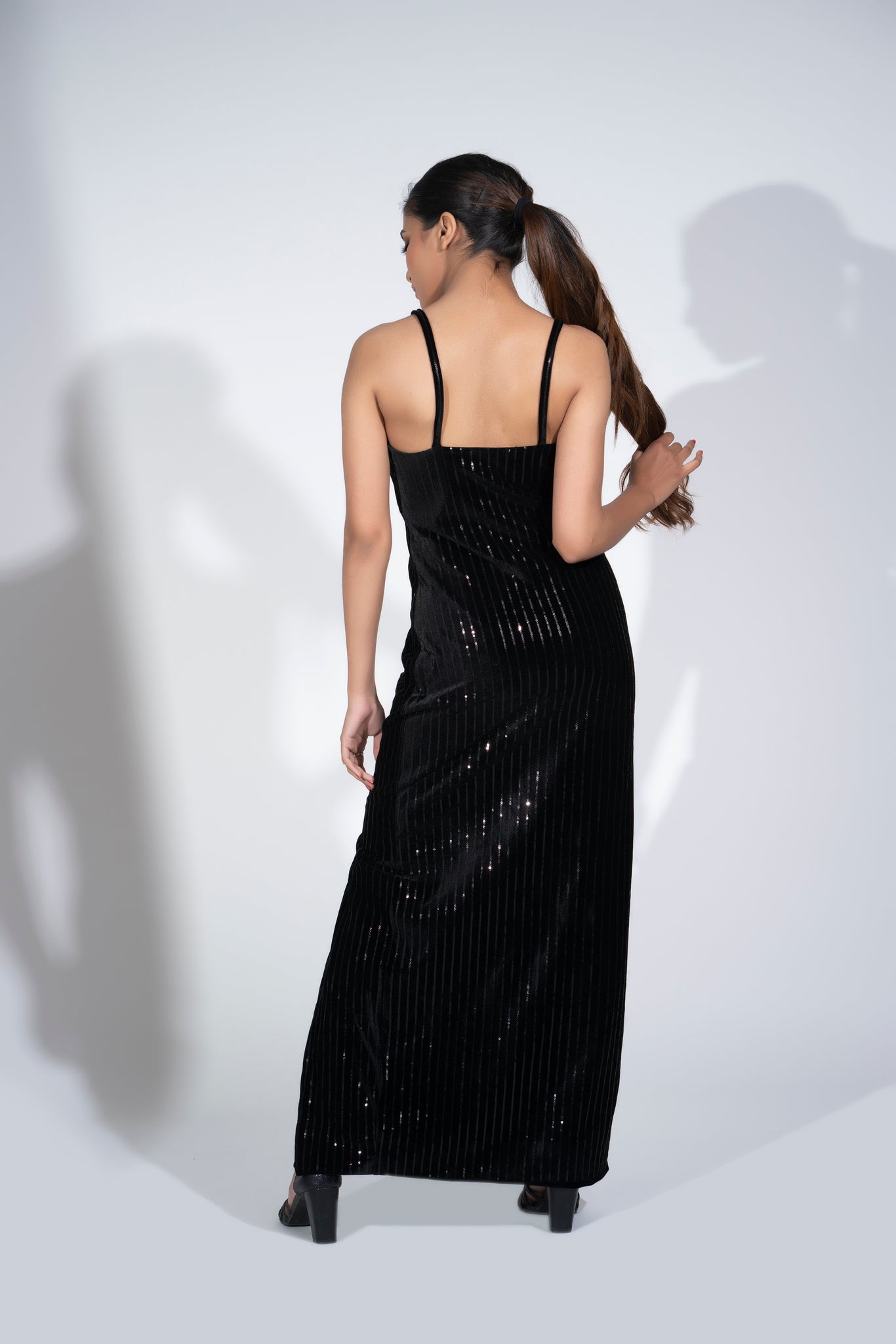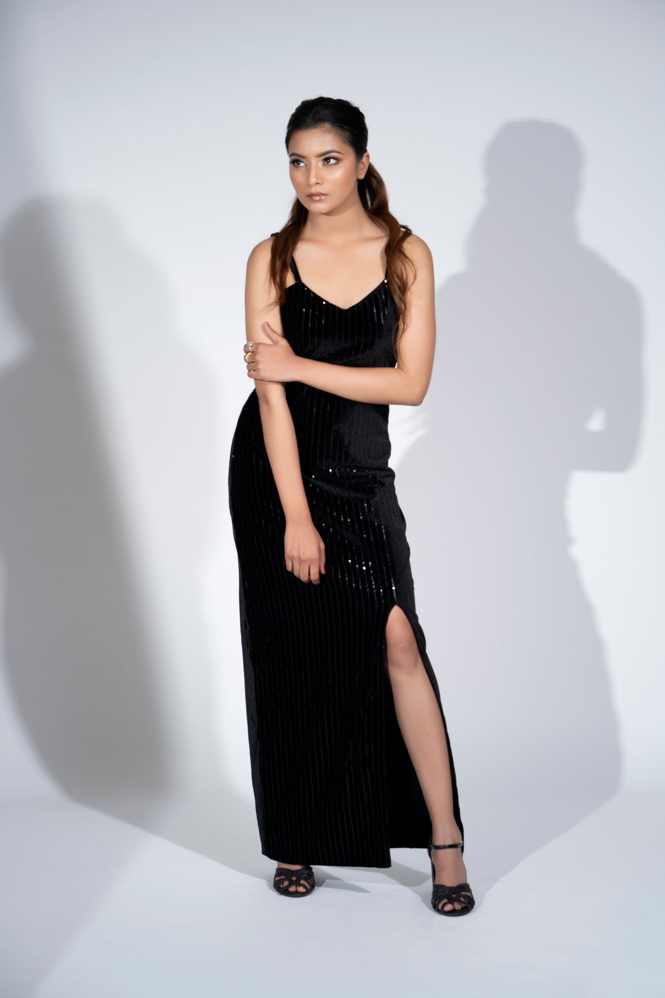 It's black, its sequins and its velvet! Only if it could get any better than that. It features a V- neckline, side slit and spaghetti straps. Fabric: VELVET SEQUENCE. MODEL SIZE & FITThe model (height 5.4ft) is wearing size S.....Read more