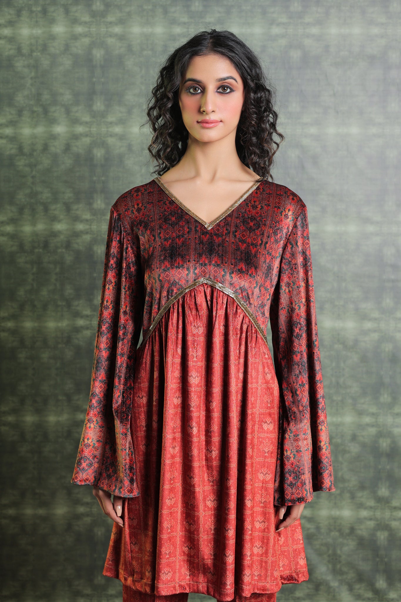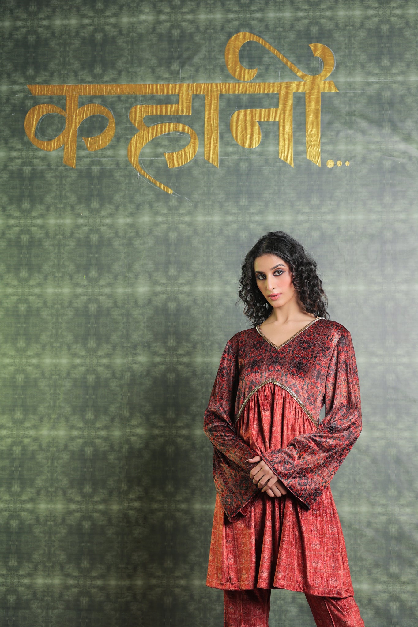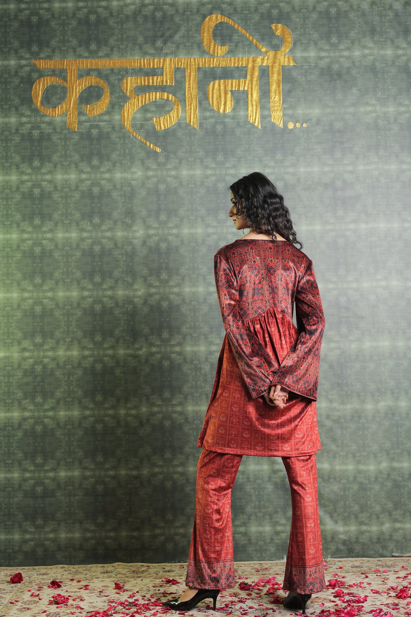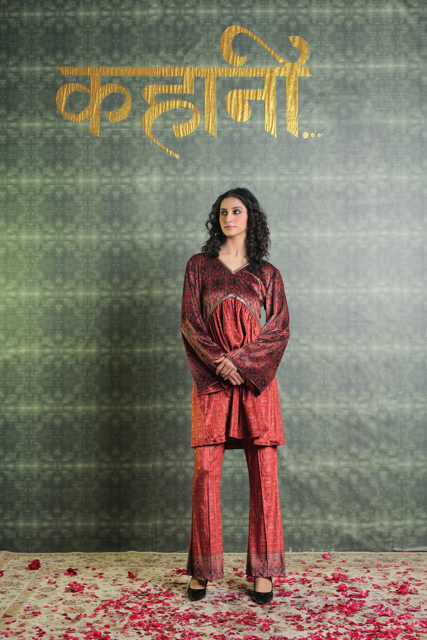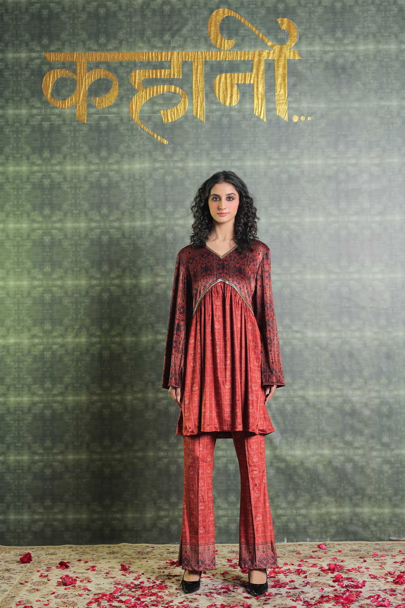 These exquisitely designed Printed Velvet Coord Sets are perfect for your upcoming festive event. Featuring V neck detailing and flared sleeves, This Outfit is gorgeous yet comfortable. A sophisticated overall appearance is enhanced by the bell bottom trousers....Read more