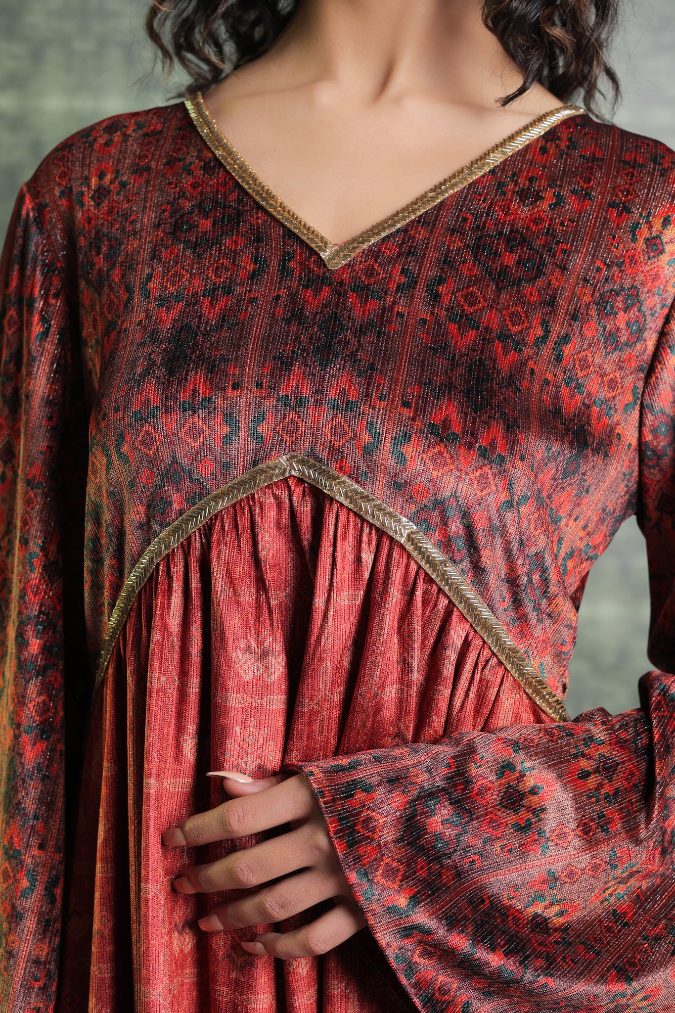 These exquisitely designed Printed Velvet Coord Sets are perfect for your upcoming festive event. Featuring V neck detailing and flared sleeves, This Outfit is gorgeous yet comfortable. A sophisticated overall appearance is enhanced by the bell bottom trousers. Have your trousers and top length customised, our team will assist you further.