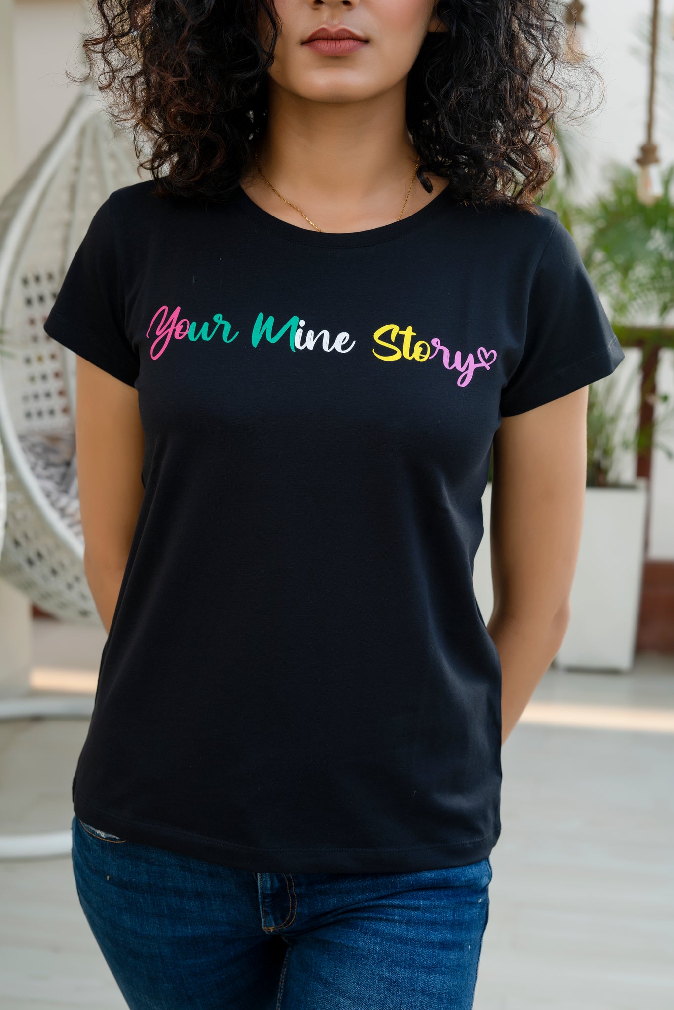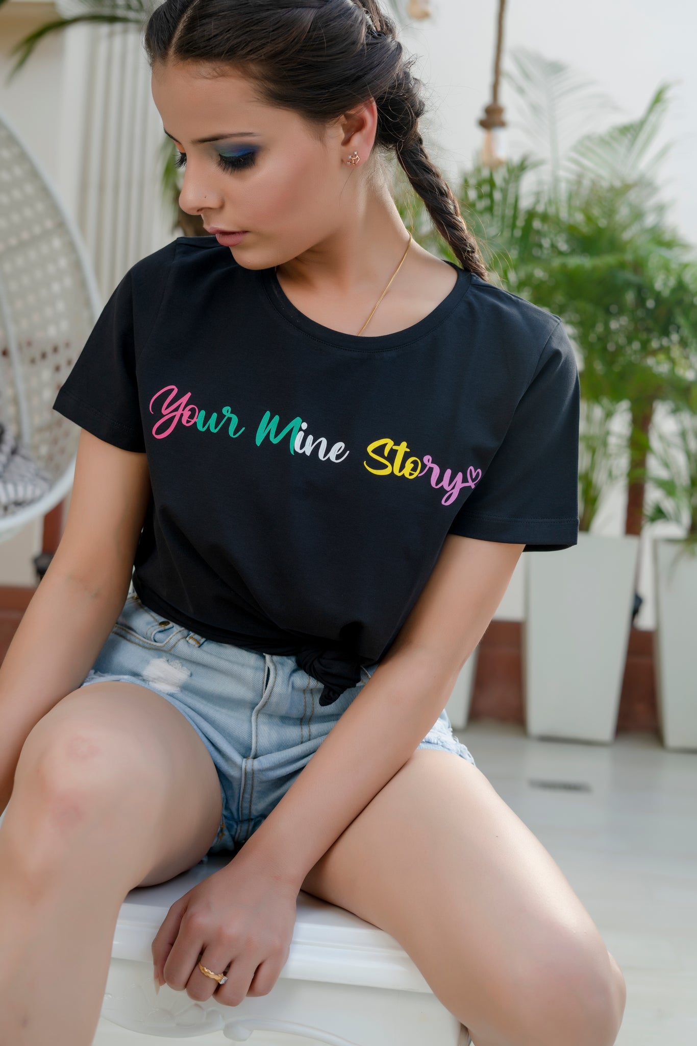 Classic Your Mine Story Black Tshirt printed with rainbow colours is perfect for your next outing with friends.