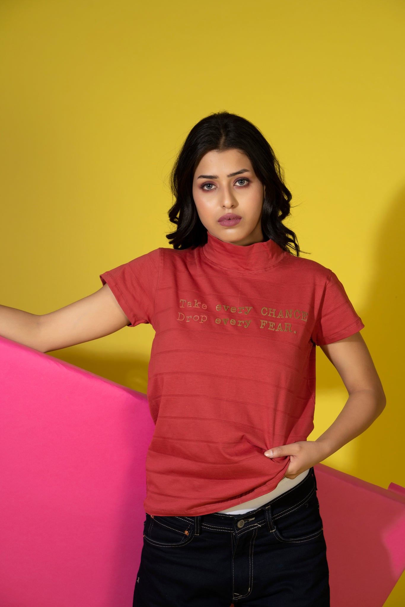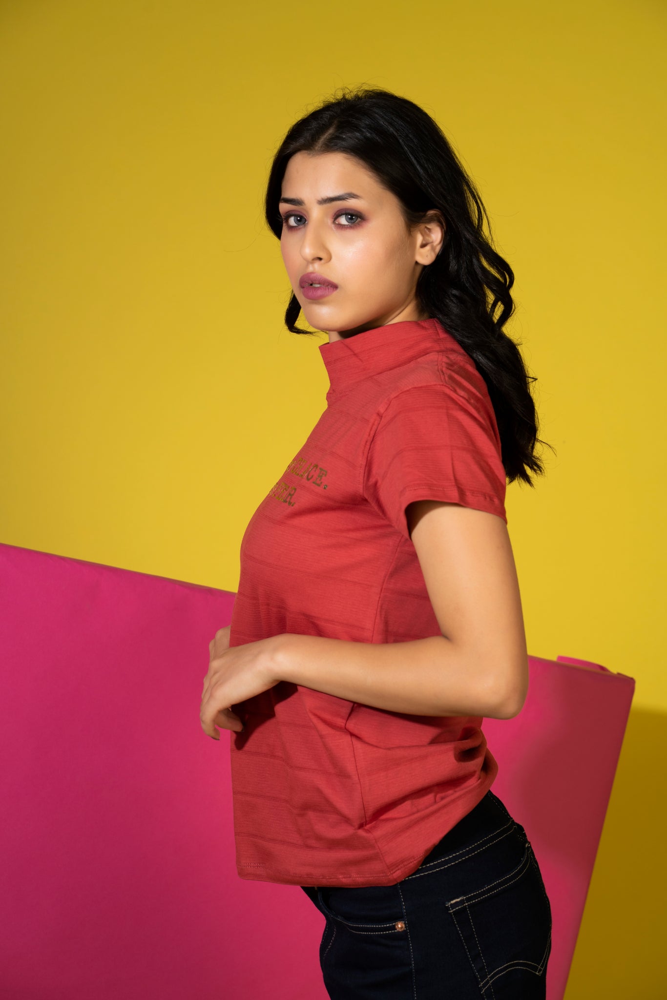 This high neck short sleeved t - shirt with statement print us all you need this summer. Fabric : ZIG ZAG SELF KNIT. MODEL SIZE & FIT The model (height 5.5ft) is wearing size S. DISCLAIMER : There might be...Read more