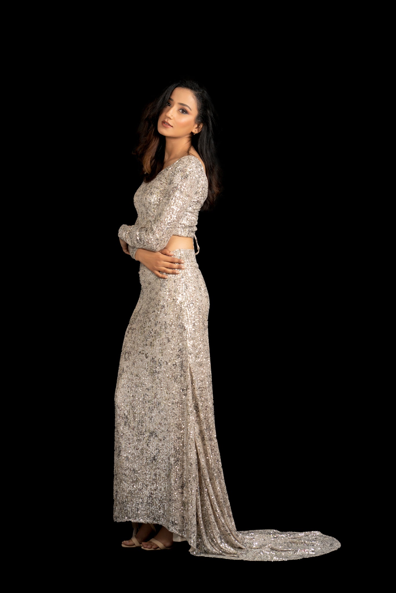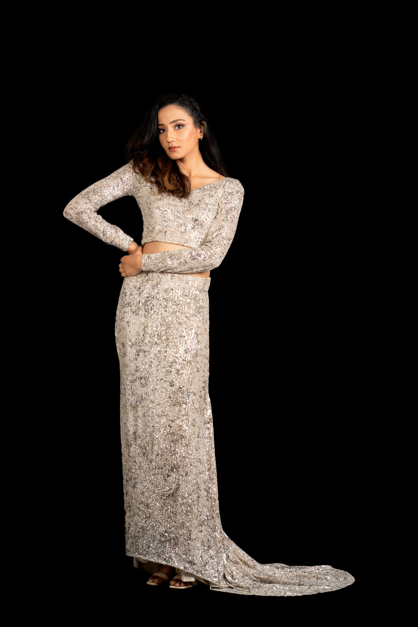 Interfuse inner charm by wearing this fabulous net sequene long tail skirt paired with blouse complementing back details