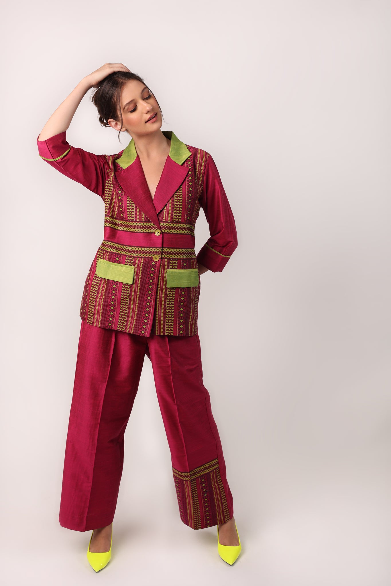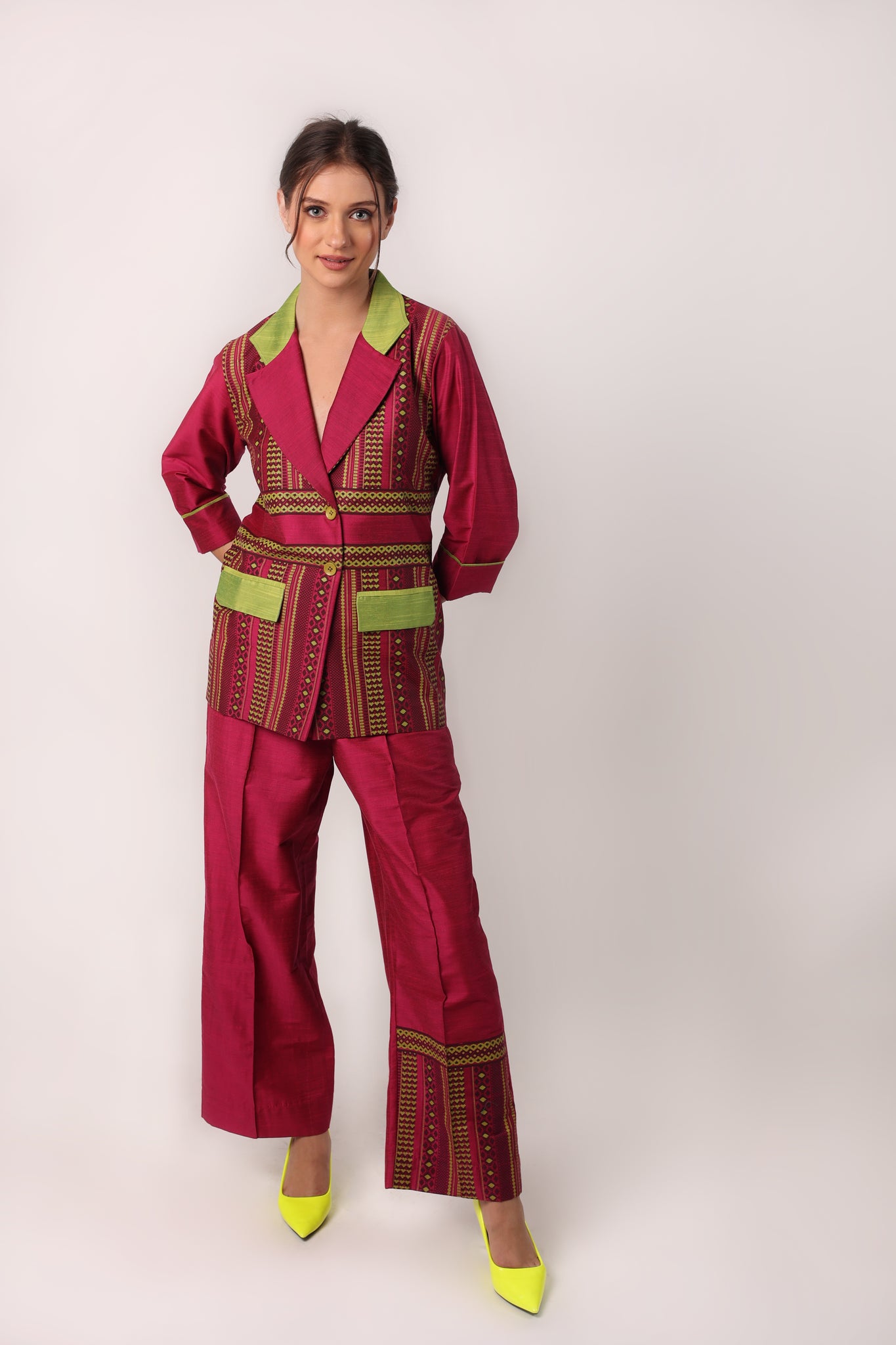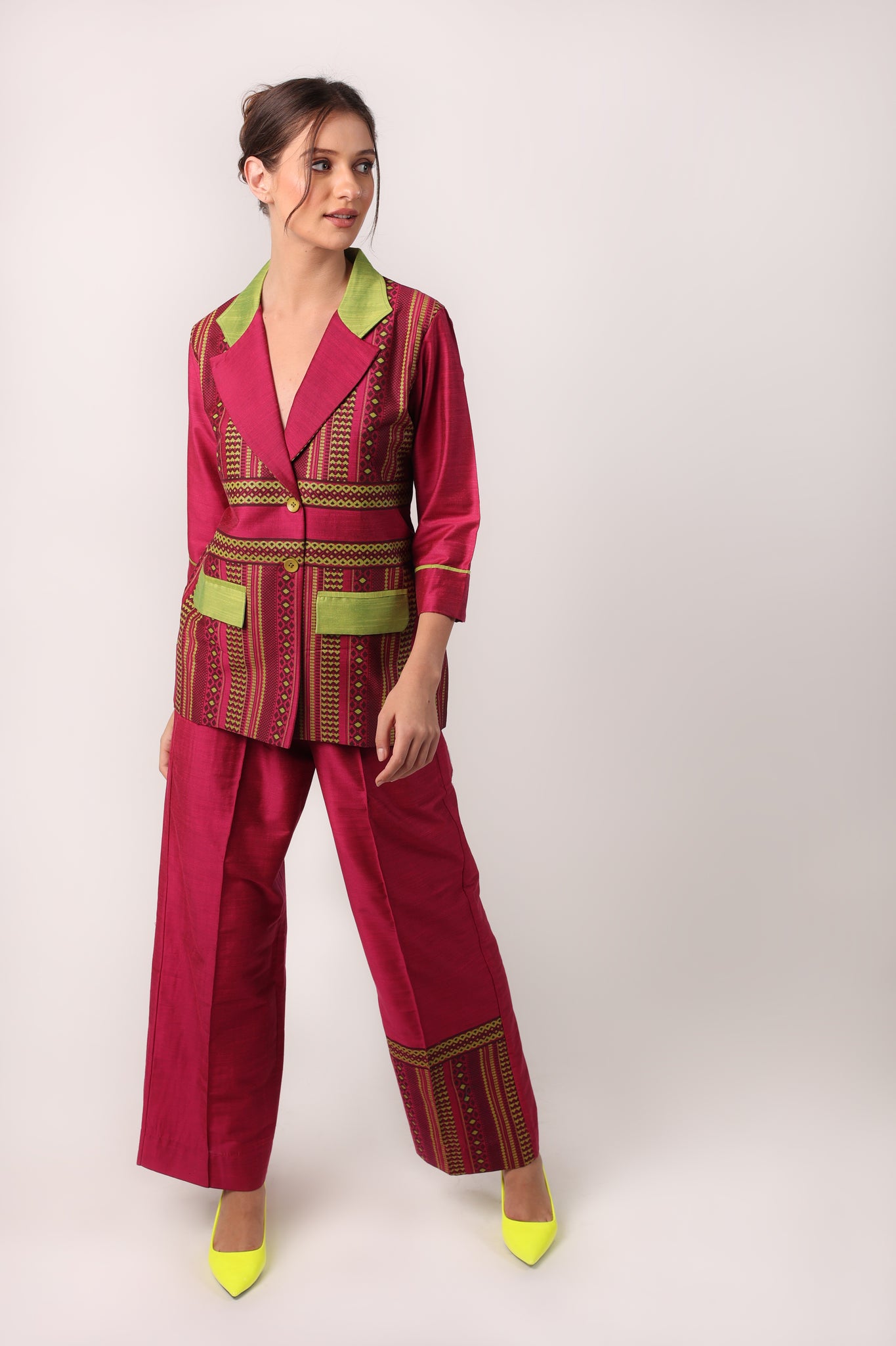 YOU WILL STAND OUT FROM THE CROWD WEARING OUR STATEMENT COORD SETS. MAKE THOSE HEADS TURN BY WEARING THIS EXQUISITELY CRAFTED COTTON BLAZER AND STRAIGHT PANTS. THE COLOUR COMBINATION MAKES IT AN ADD ON TO YOUR STYLE STATEMENT.