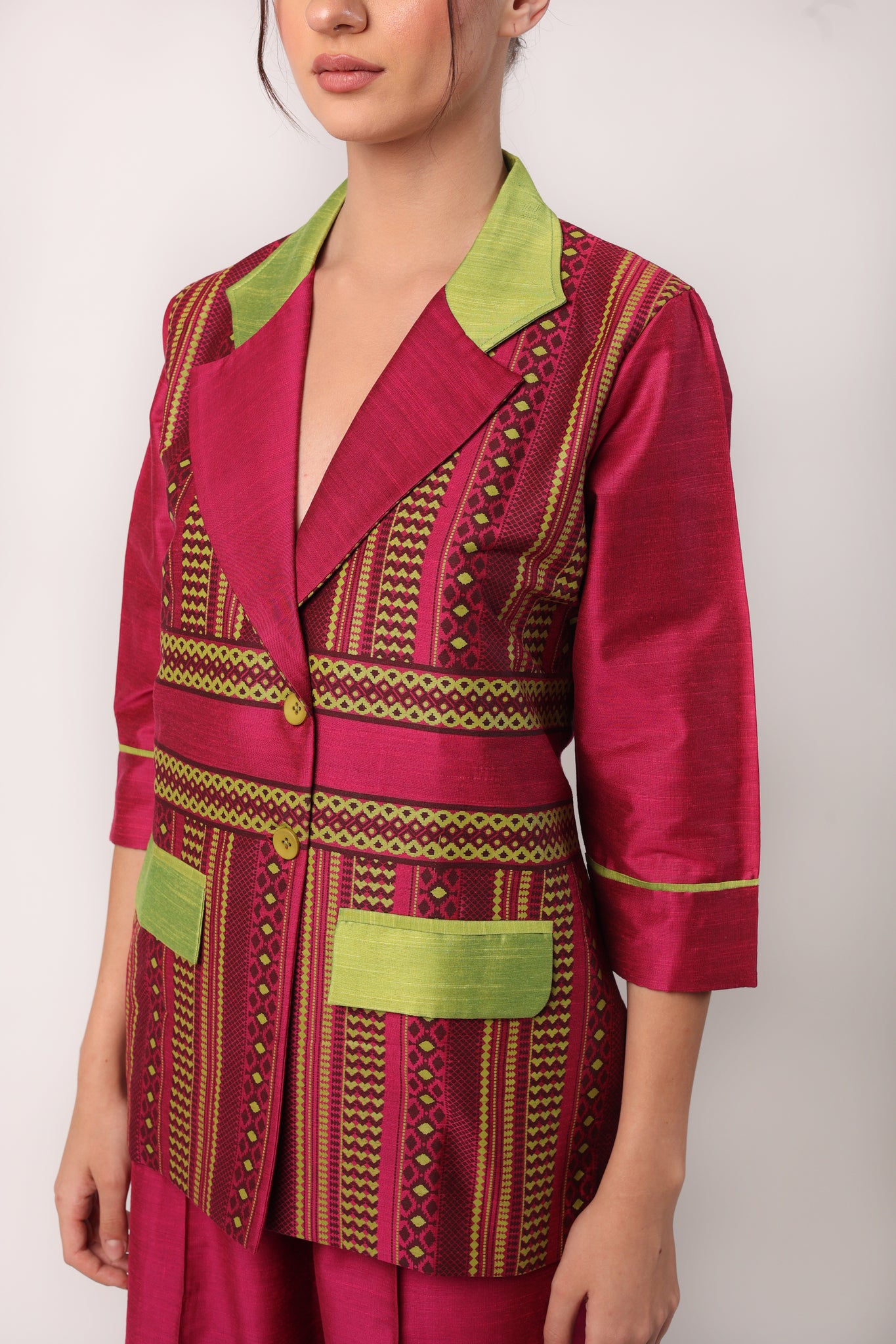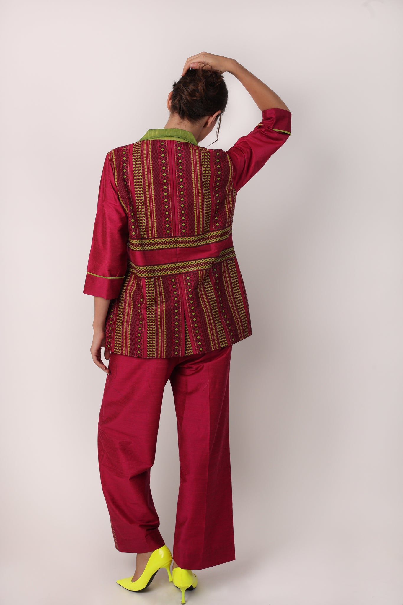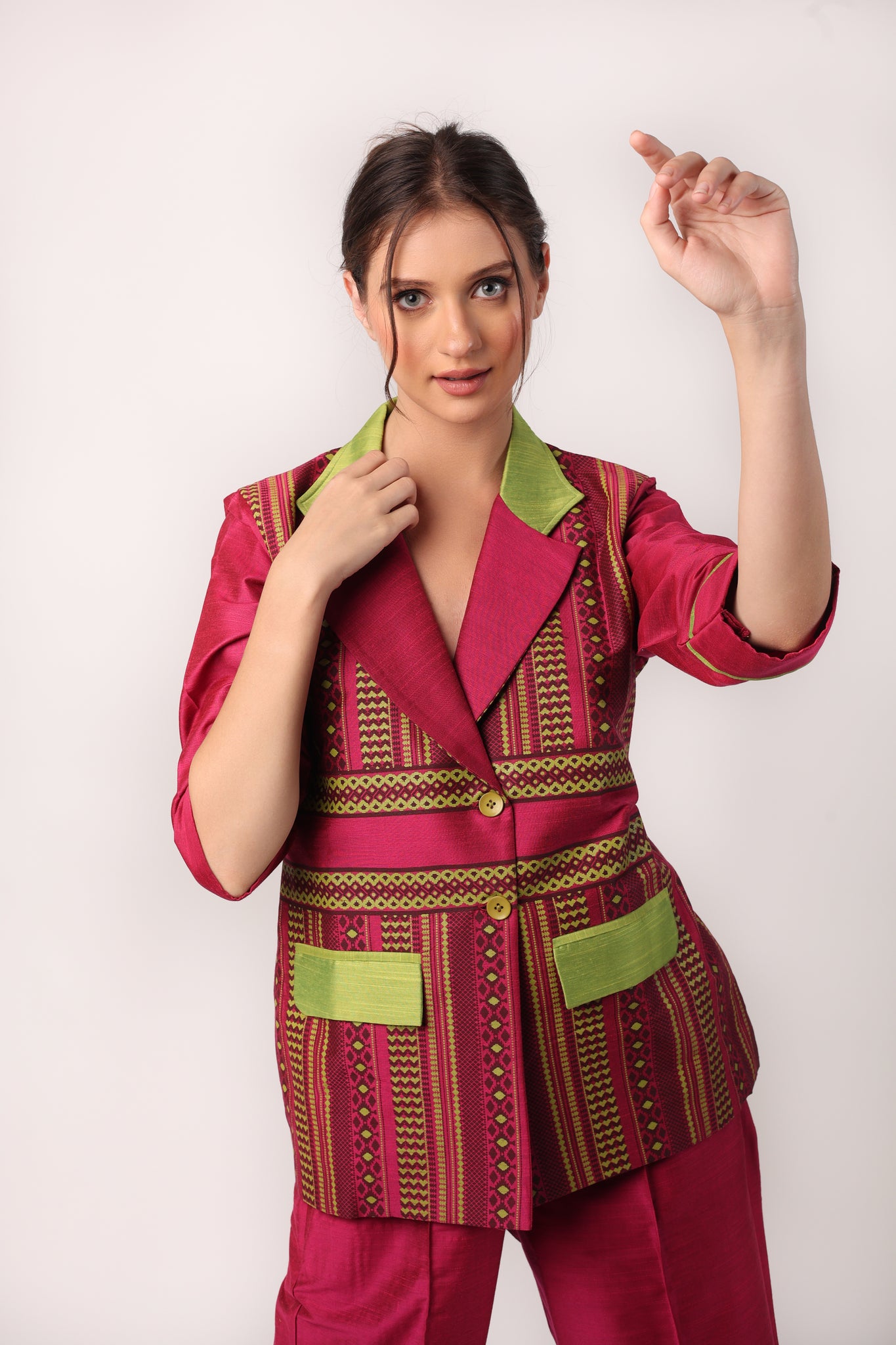 YOU WILL STAND OUT FROM THE CROWD WEARING OUR STATEMENT COORD SETS. MAKE THOSE HEADS TURN BY WEARING THIS EXQUISITELY CRAFTED COTTON BLAZER AND STRAIGHT PANTS. THE COLOUR COMBINATION MAKES IT AN ADD ON TO YOUR STYLE STATEMENT.