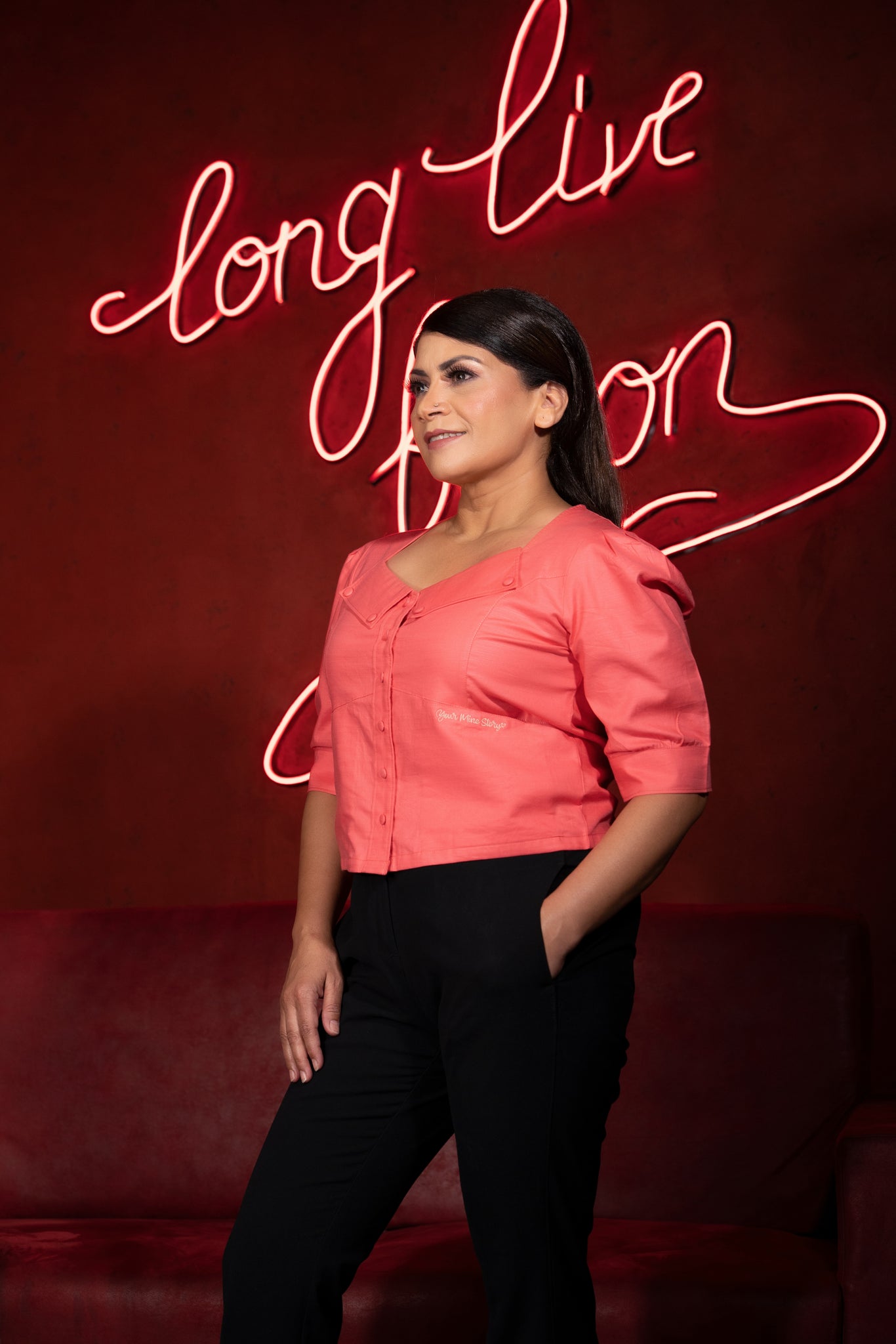Our solid neon pink top is catching all the attention this extended summer with its comfortable fit and button down front. Style it with your trousers and jeans to give a formal look.