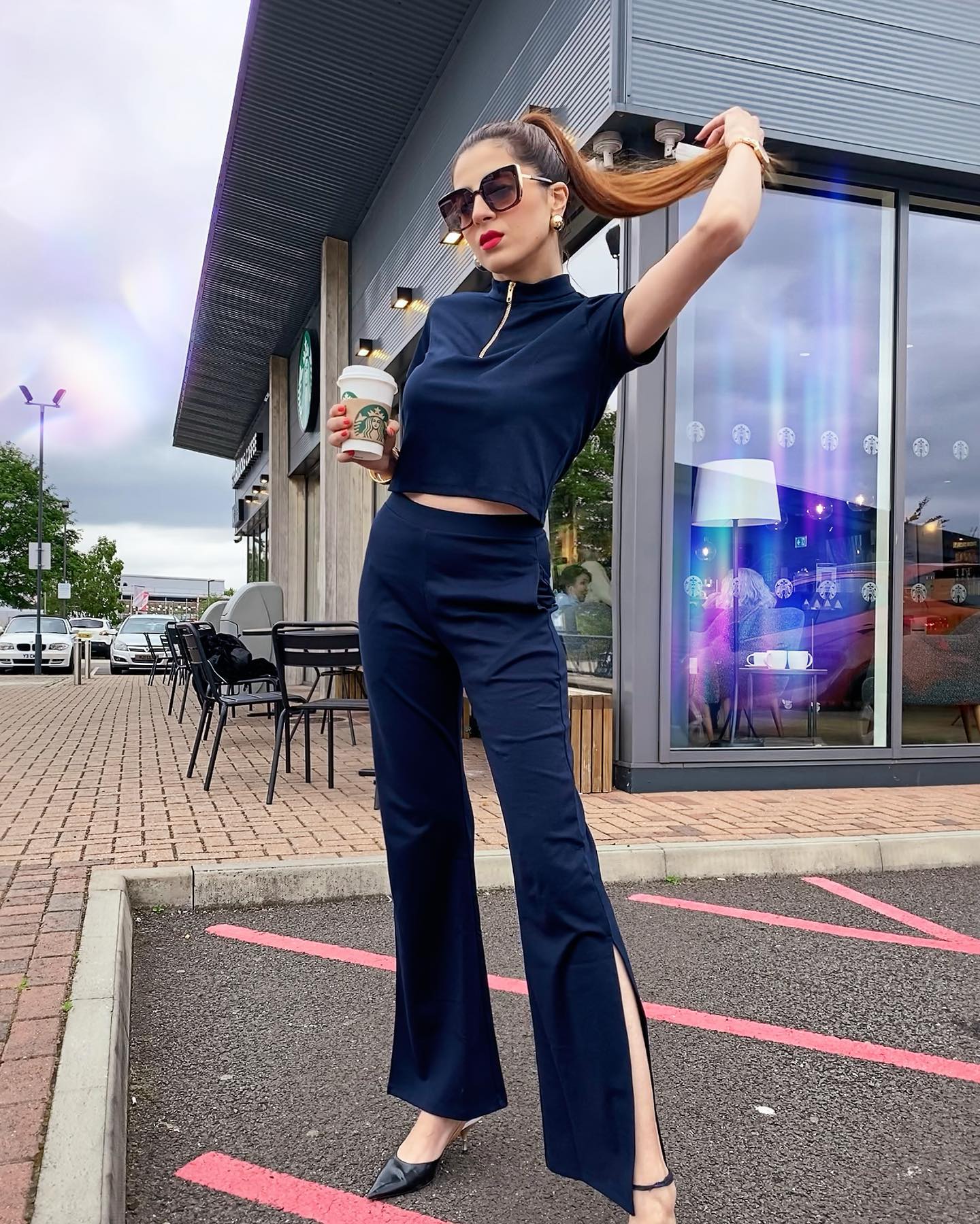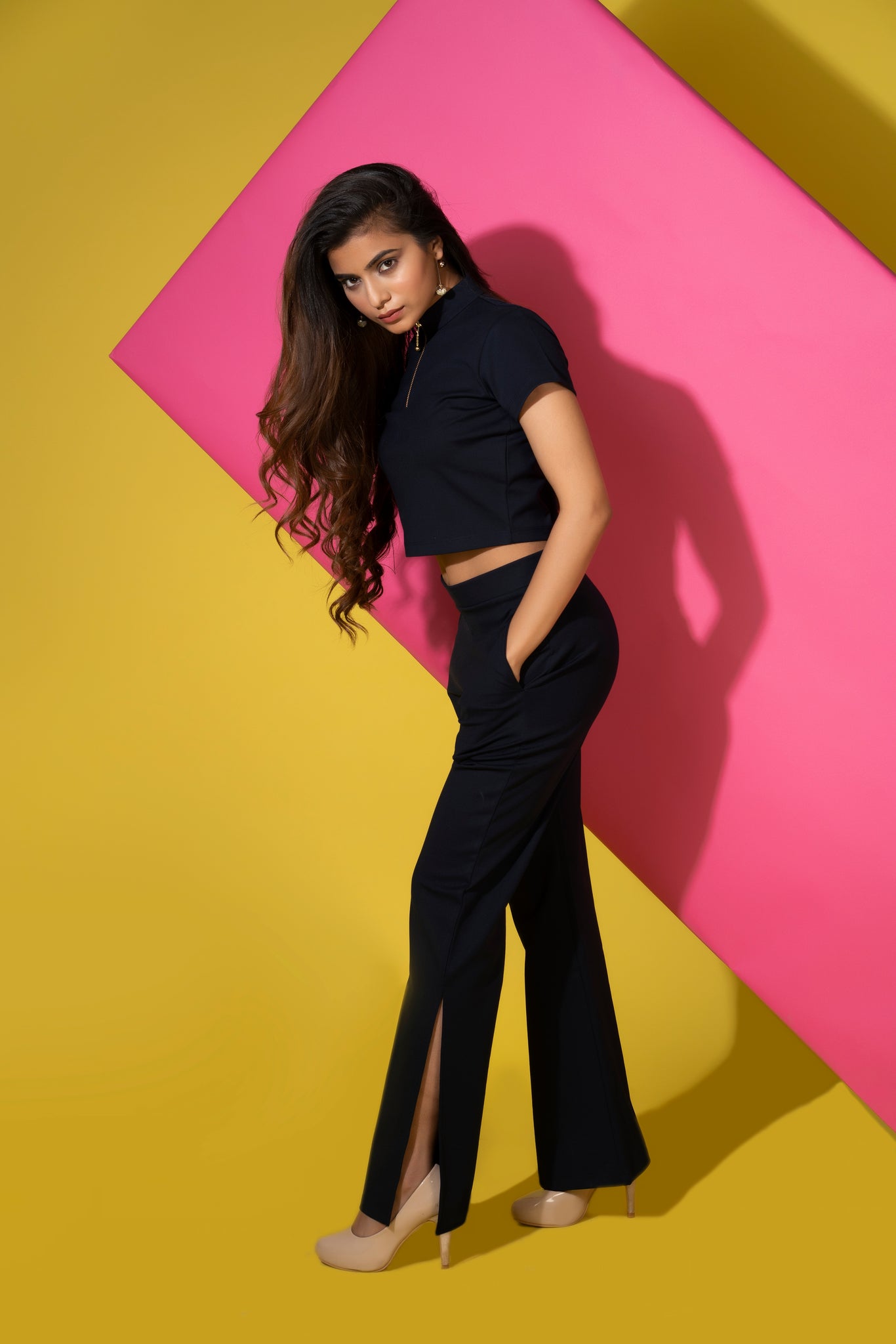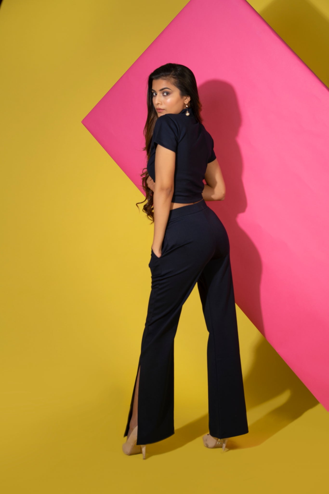 High waist flared Leg Trousers with side slit co-ordinated with gold front zipper top.