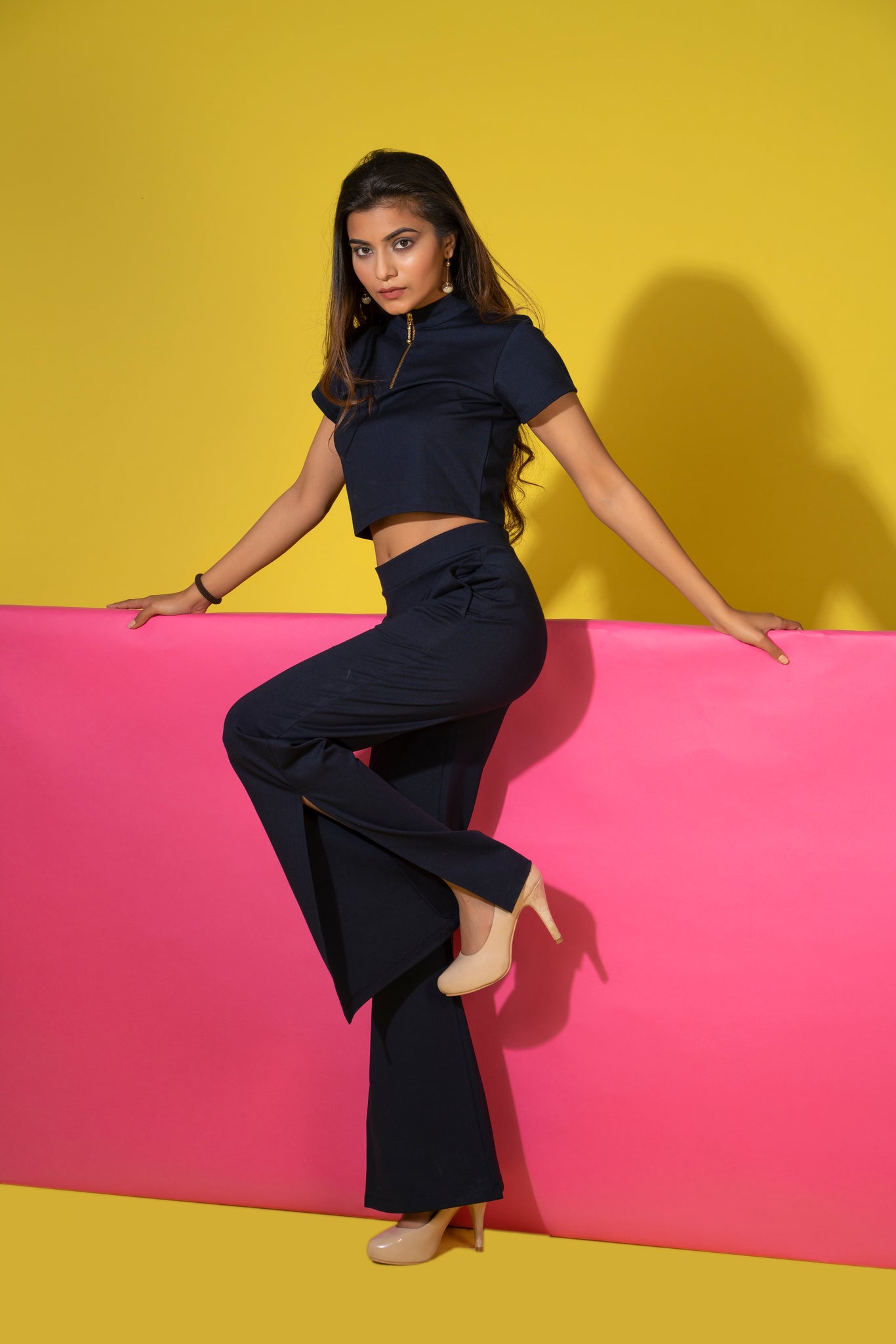 High waist flared Leg Trousers with side slit co-ordinated with gold front zipper top. Fabric: CANVAS LYCRA. MODEL SIZE & FIT The model (height 5.4ft) is wearing size S. DISCLAIMER : There might be a slight variation in...Read more