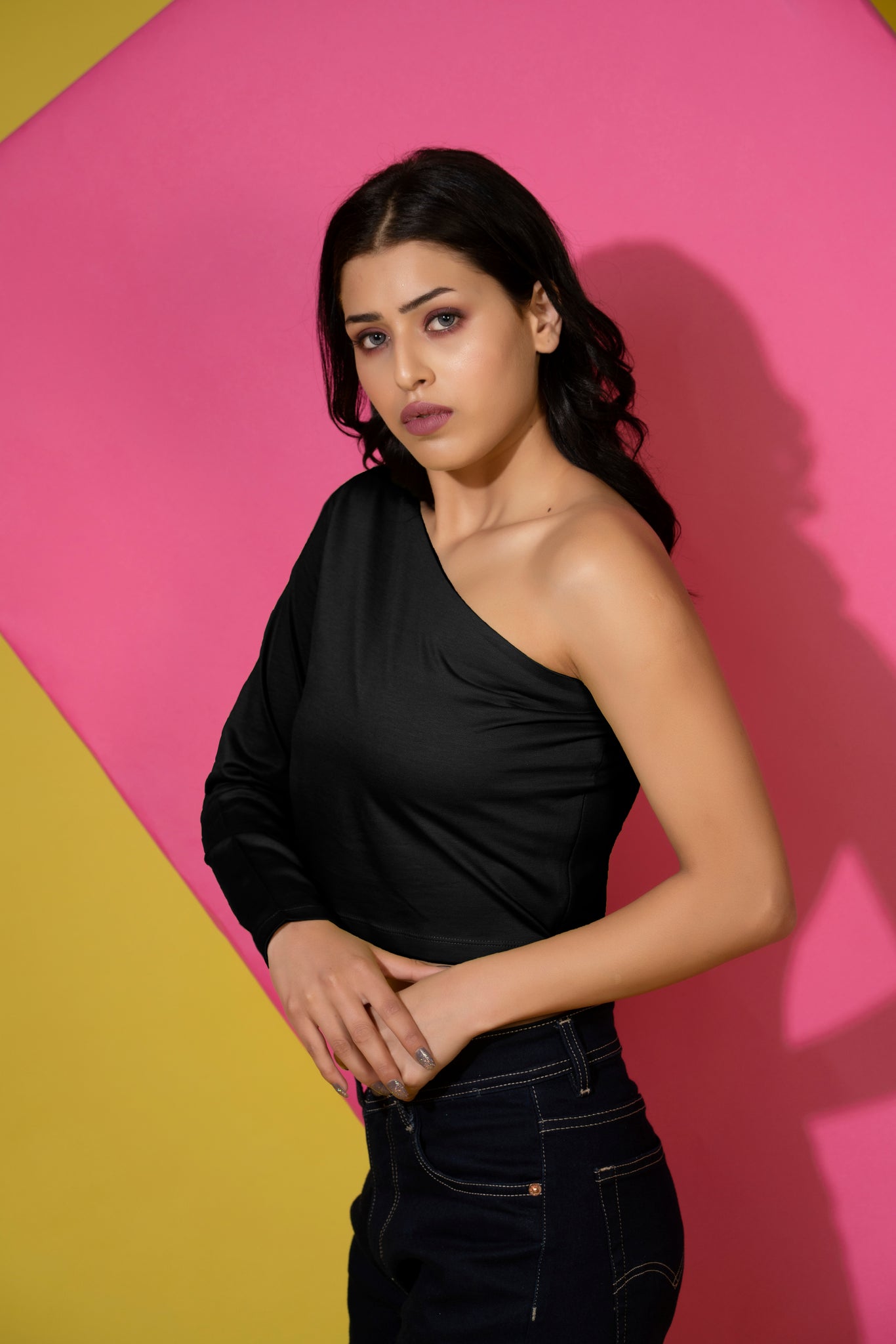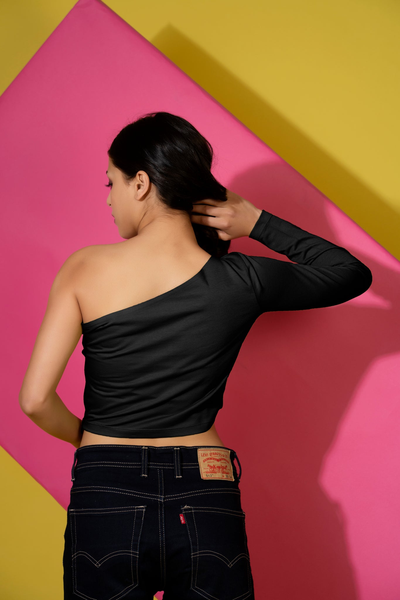 Be bold today and carry off this one shoulder fitted crop to. Flaunt your inner sense of style.