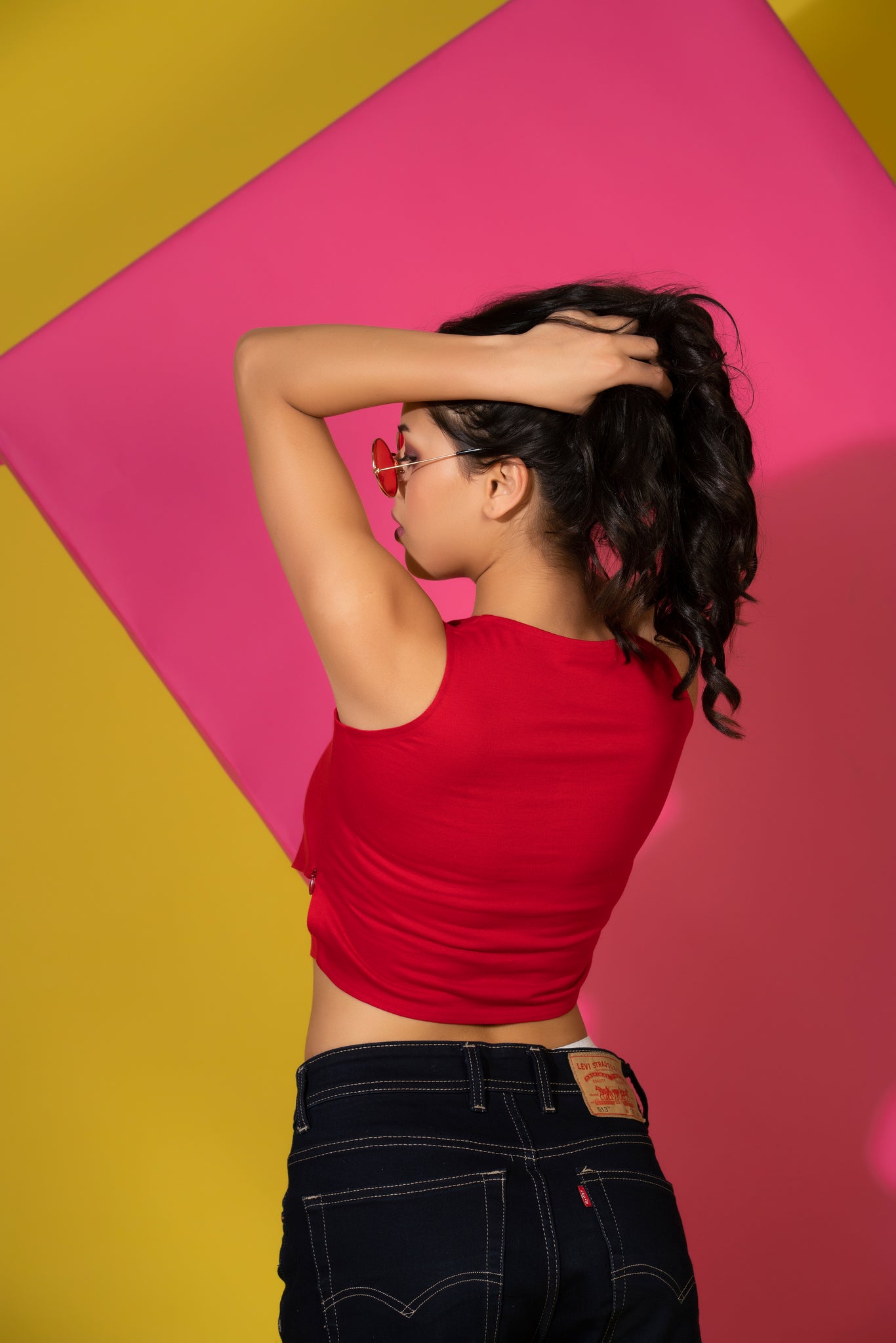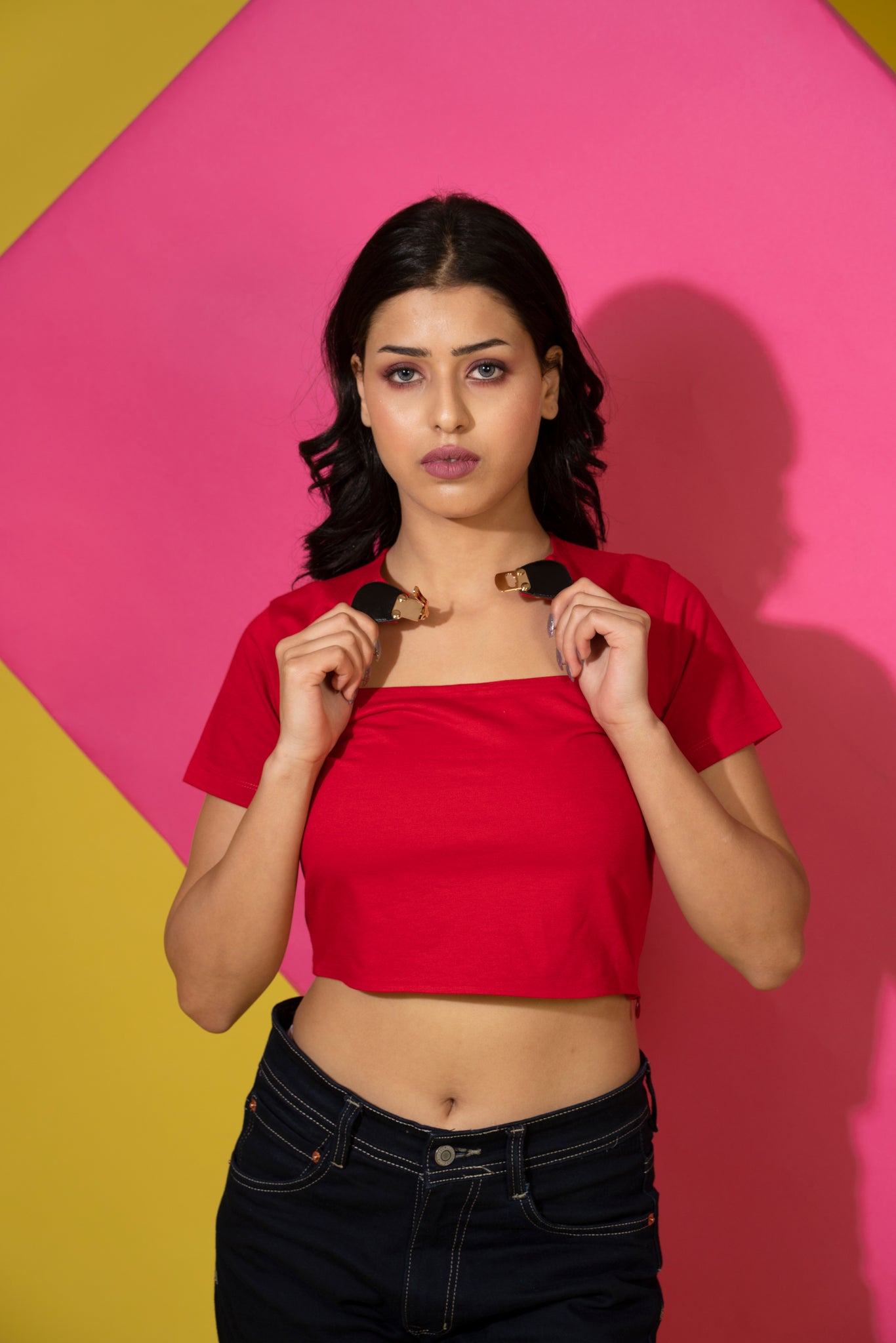 MONO PIQUE LYCRA. Be the next style icon wherever you go with this Red coloured cut out and buckeled neck crop top. MODEL SIZE & FIT The model (height 5.5ft) is wearing size S. DISCLAIMER : There might...Read more