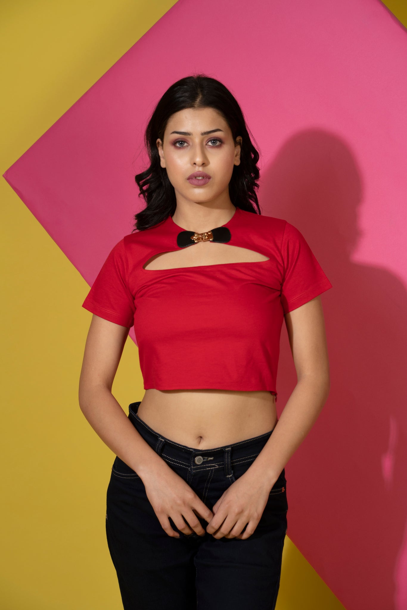 Be the next style icon wherever you go with this Red coloured cut out and buckeled neck crop top.