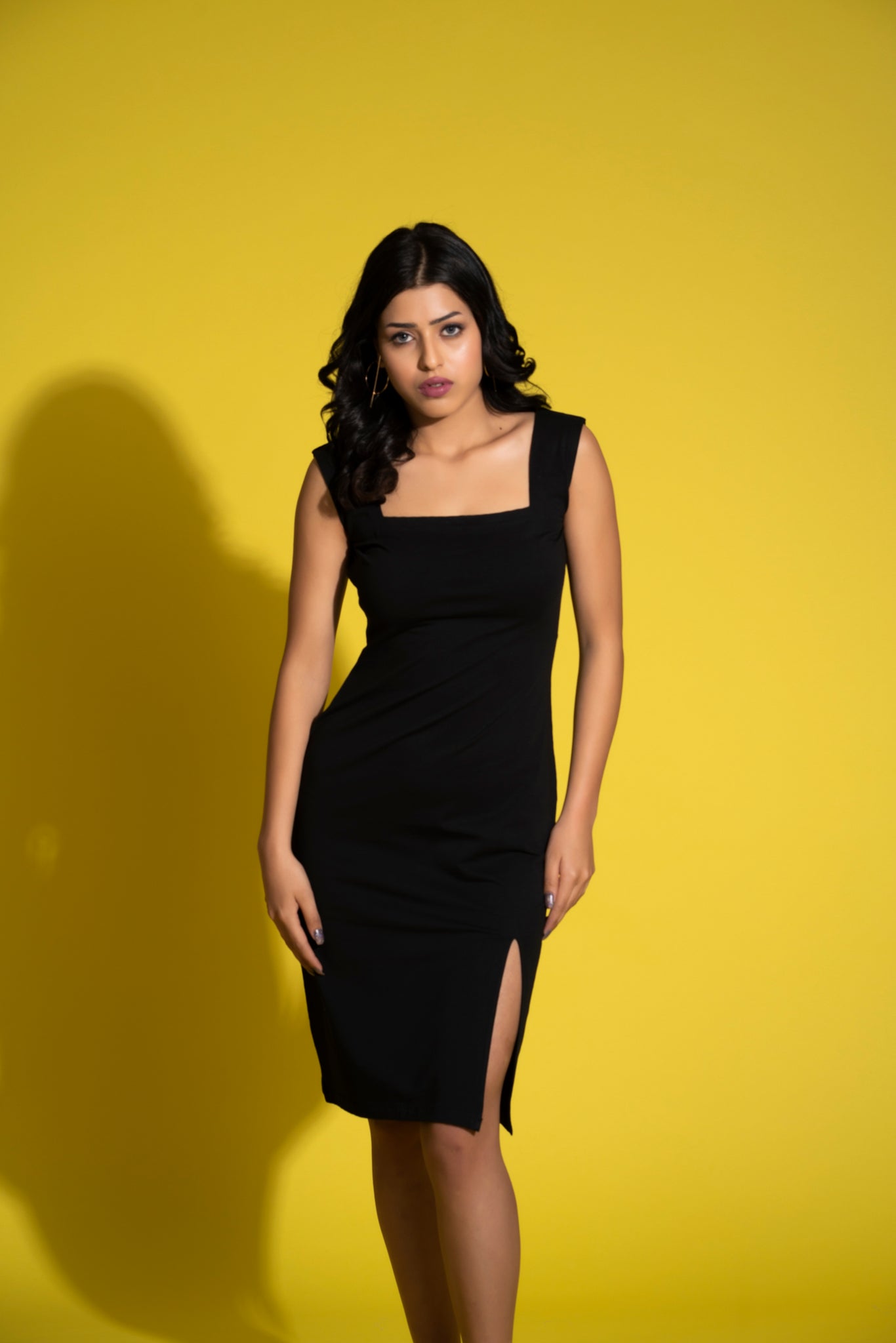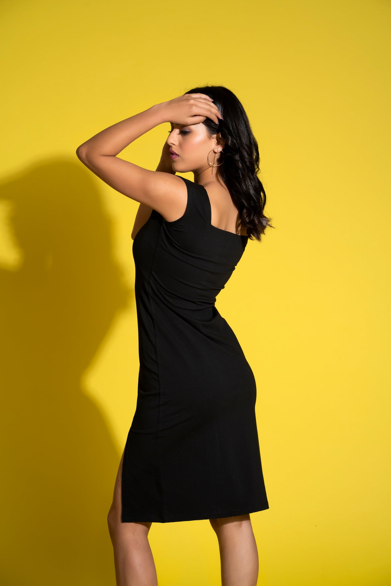 A Solid Black dress with side slit, knee length and square neck - front and back. Fabric: PIXEL SELF KNITTED LYCRA. MODEL SIZE & FITThe model (height 5.5ft) is wearing size S. DISCLAIMER : There might be a...Read more