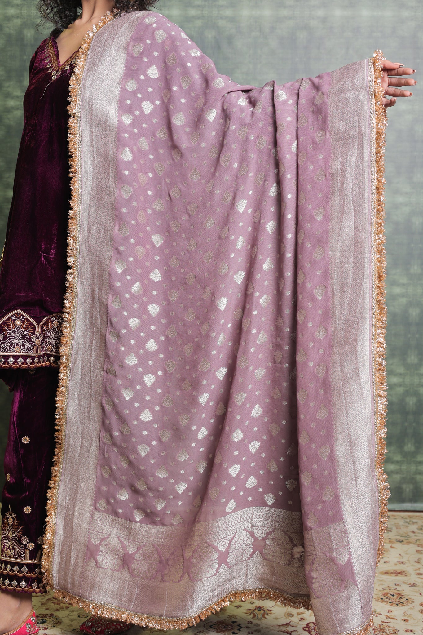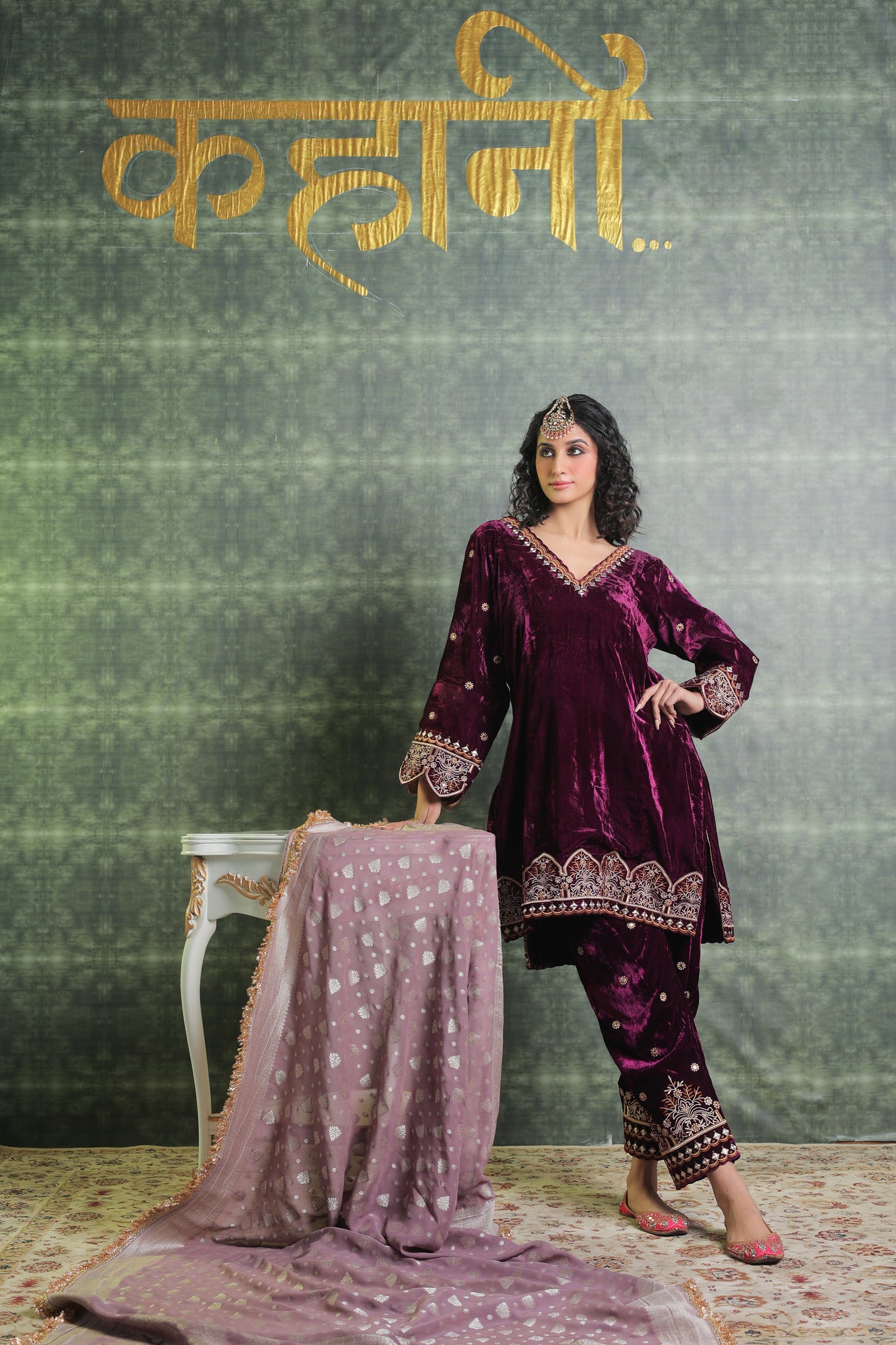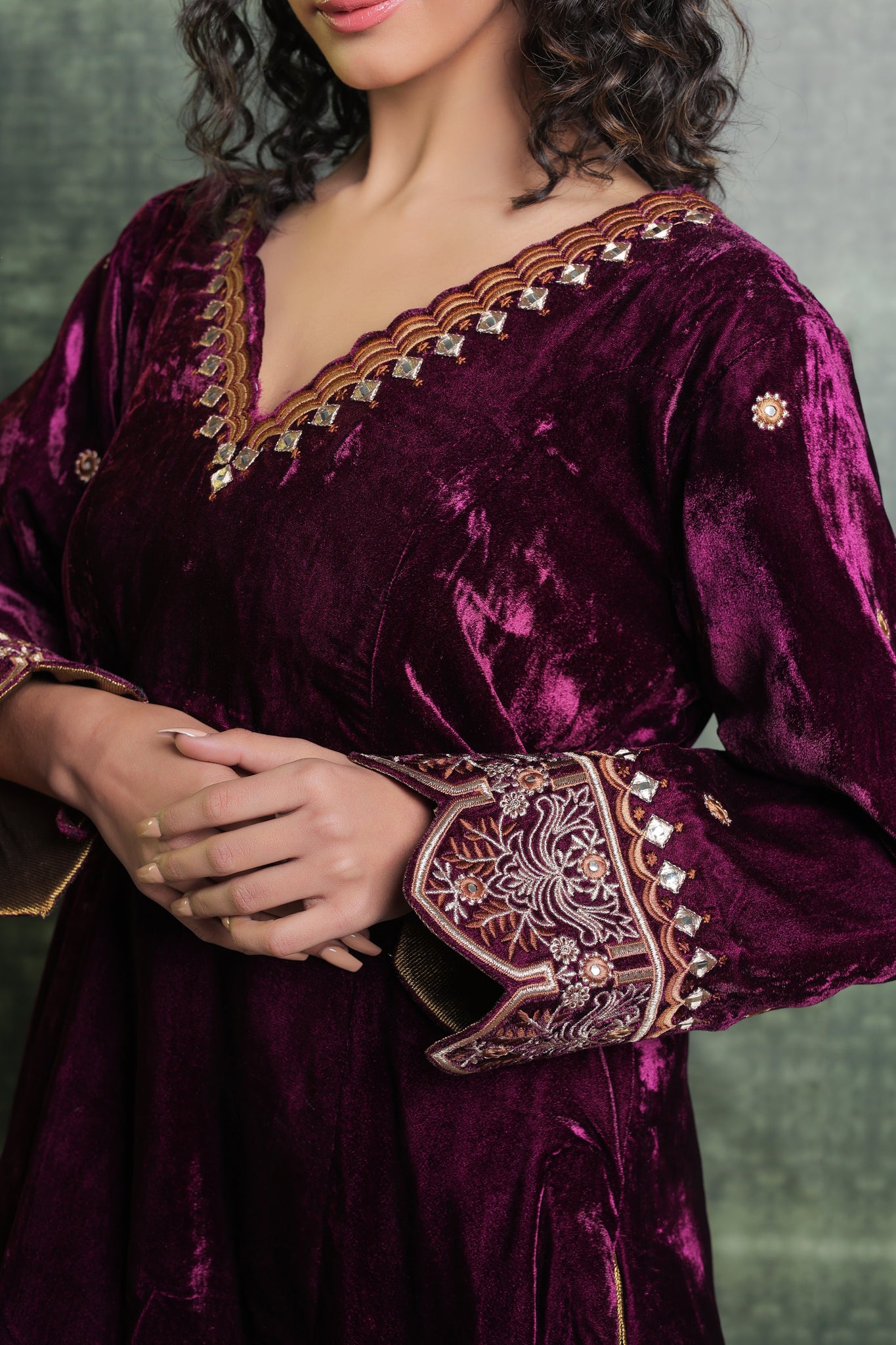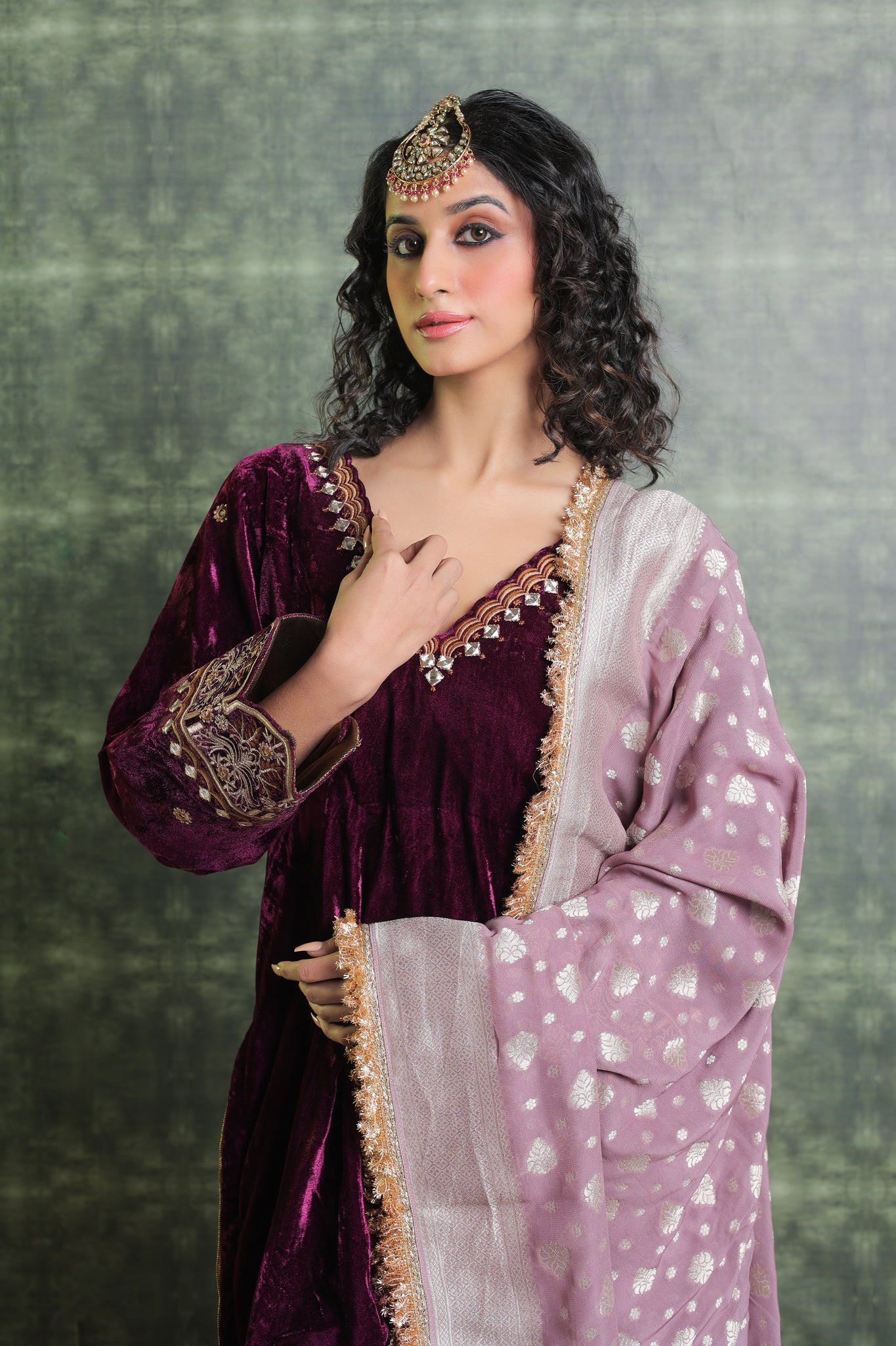 Exquisitely festive, this pure velvet suit includes a Kurta with a gorgeously detailed V neck. Beautiful embroidery on the ankle-length salwar lends even more refinement to the overall ensemble. Gorgeous Lace detailing adorns the Dupatta. You can Customise the Kurta and Salwar Length. Our team will assist you for the same. Outfits have 2-3 inches of extra margin.