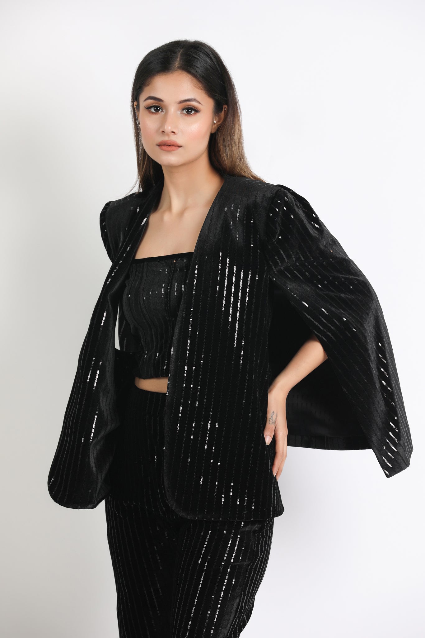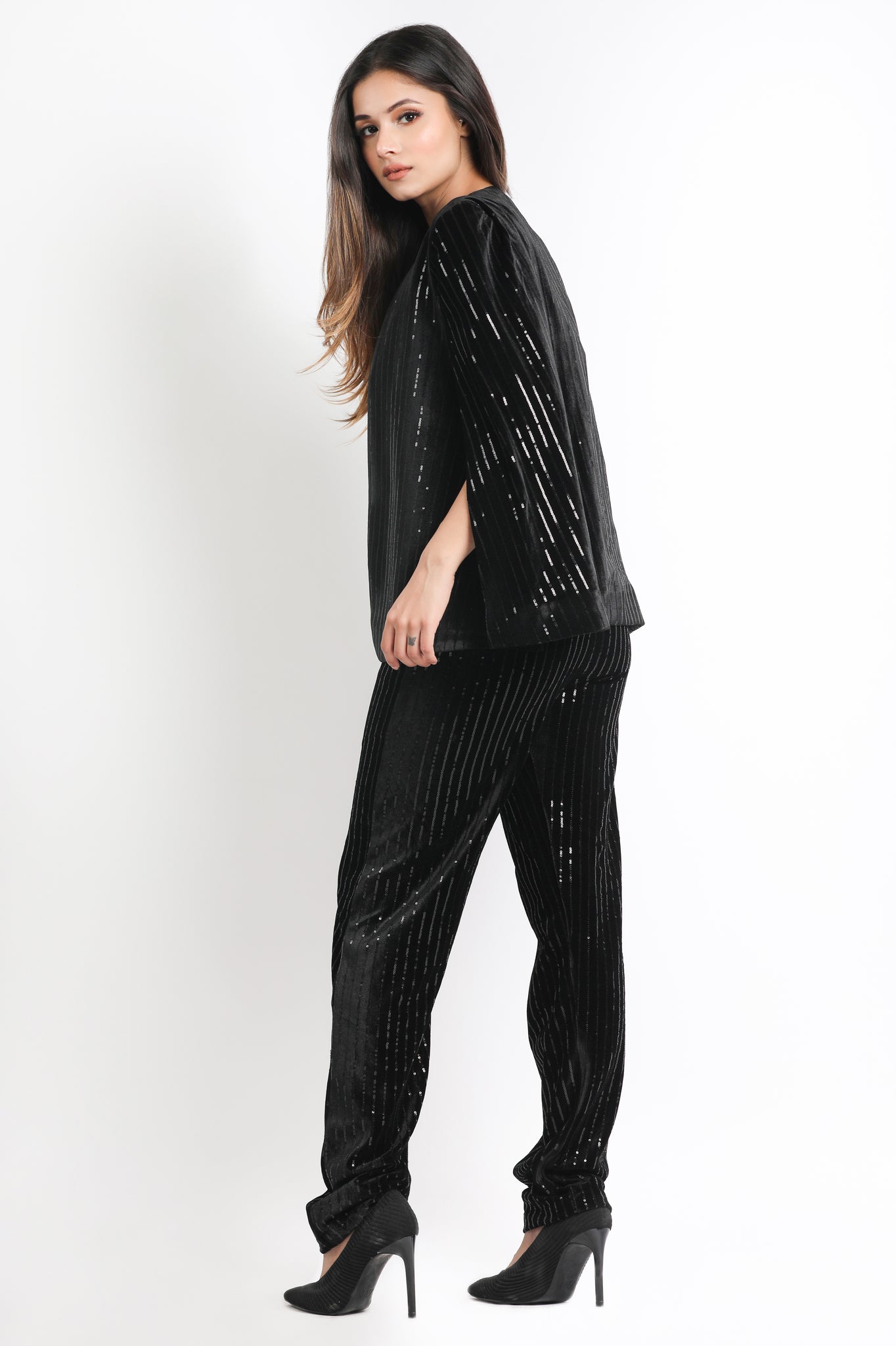 This sequin black Velvet Pant suit is beautifully tailored which is a perfect outfit for Parties, evenings and Dates. It's time to rock Sequin to any Damm party!