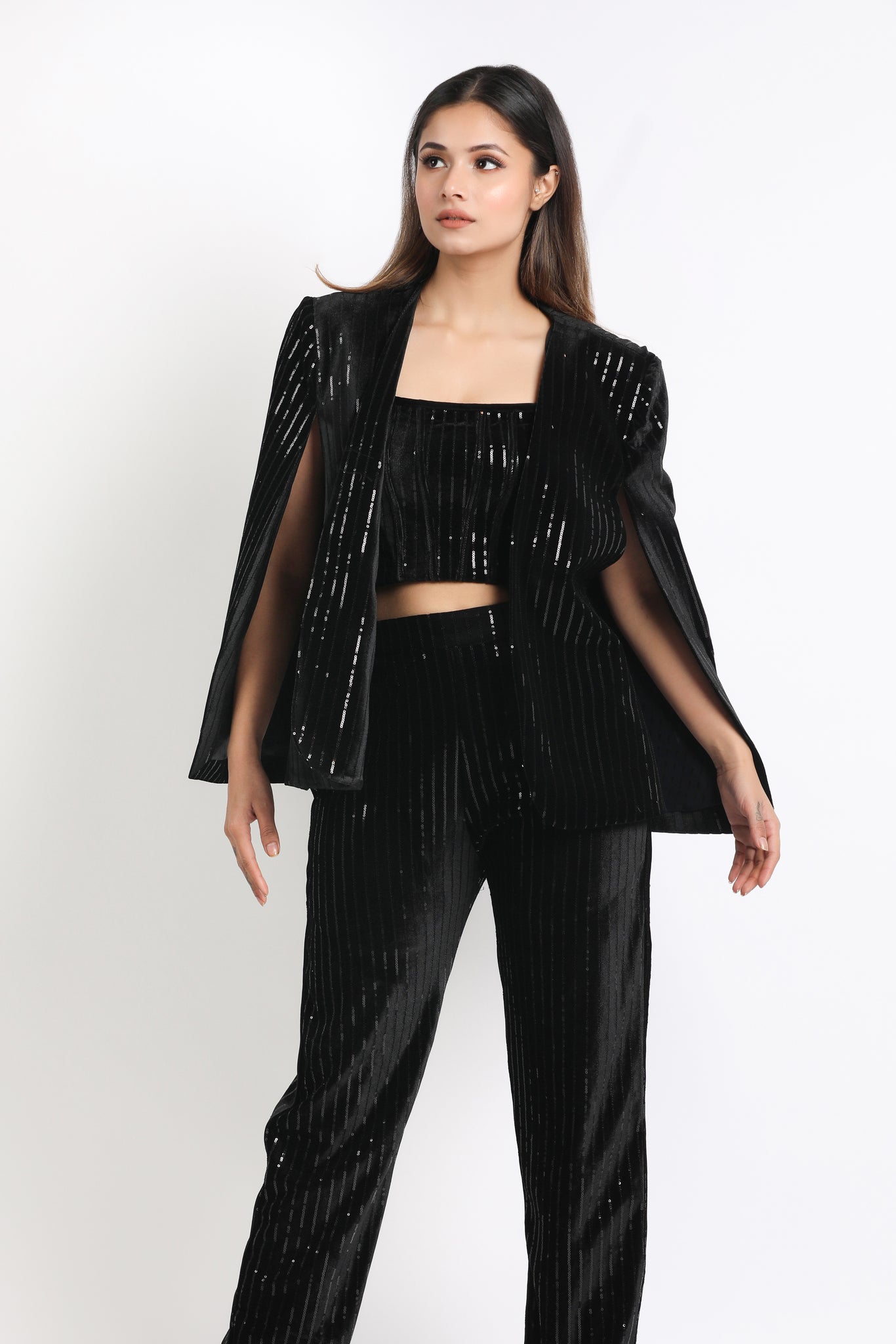This sequin black Velvet Pant suit is beautifully tailored which is a perfect outfit for Parties, evenings and Dates. It's time to rock Sequin to any Damm party!