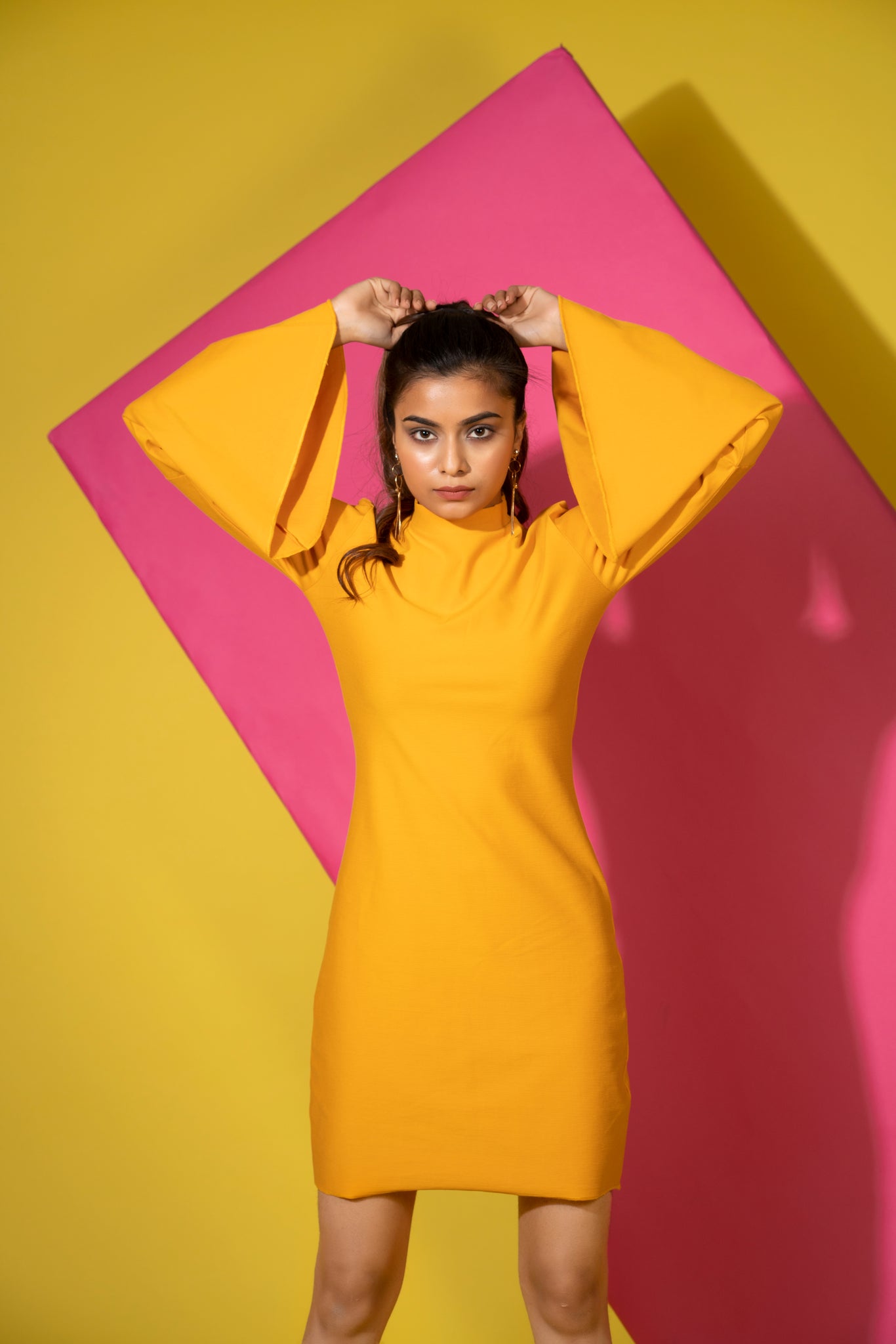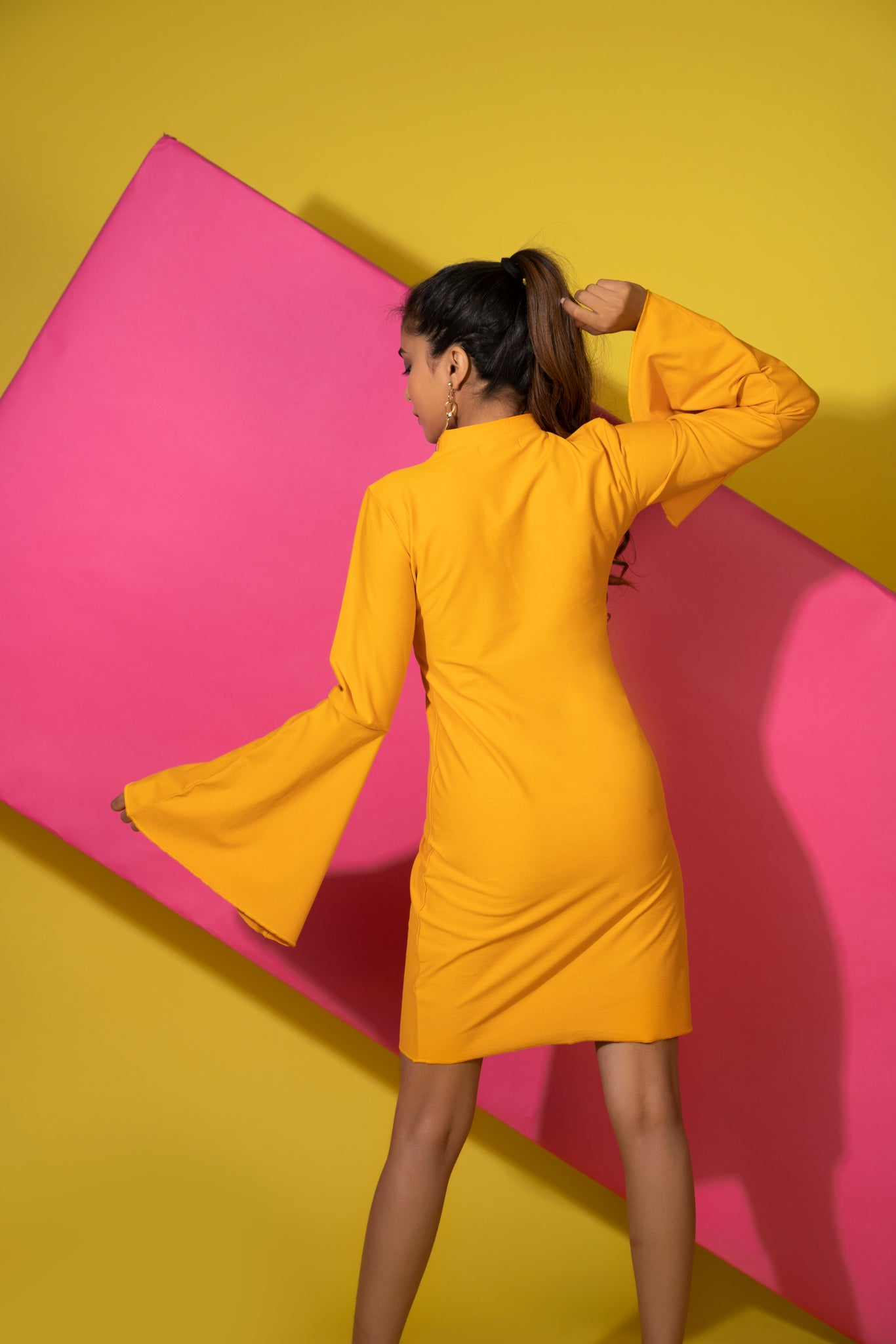 Spruce up your collection with this sunny yellow dress features bell sleeves and a straight fit , perfect for every occassion be it a day out with friends or a night get together with family.