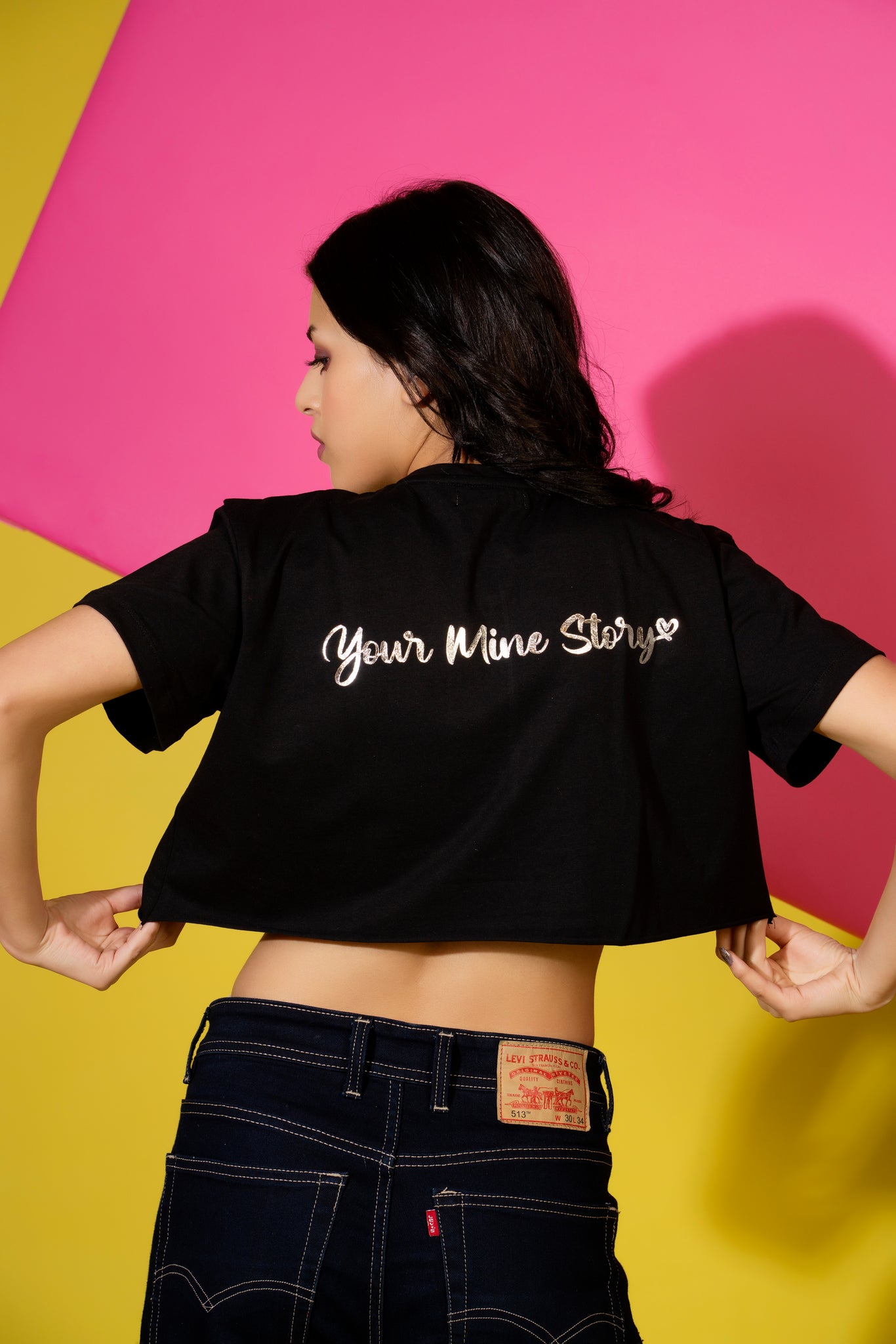 Crafted in cotton , this black crop tee printed with YOUR MINE STORY logo is perfect to welcome summers.