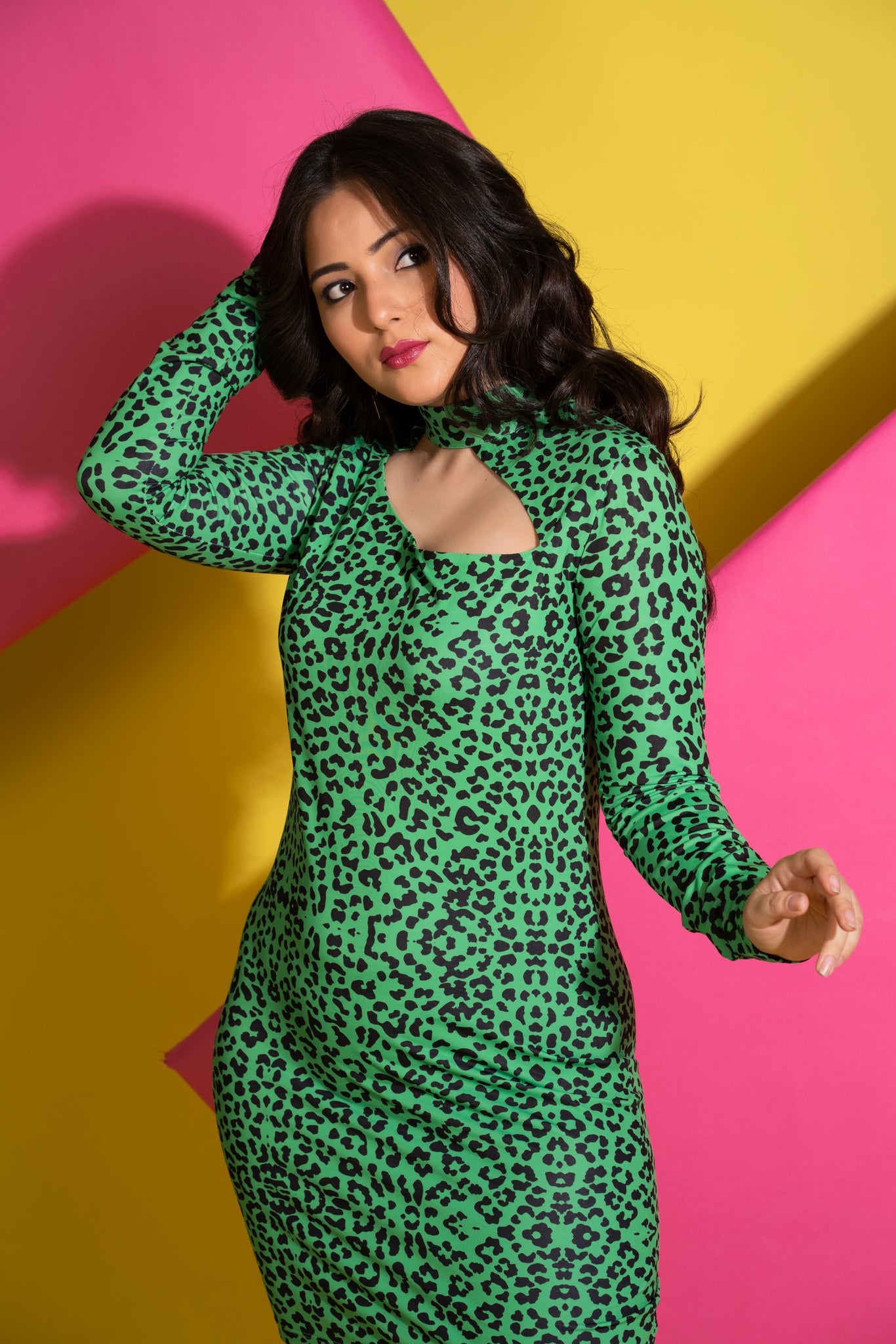 Body- con mini dress with a cut -out neck & full sleeves, is a perfect outfit to beat the party vibe and casual outings.