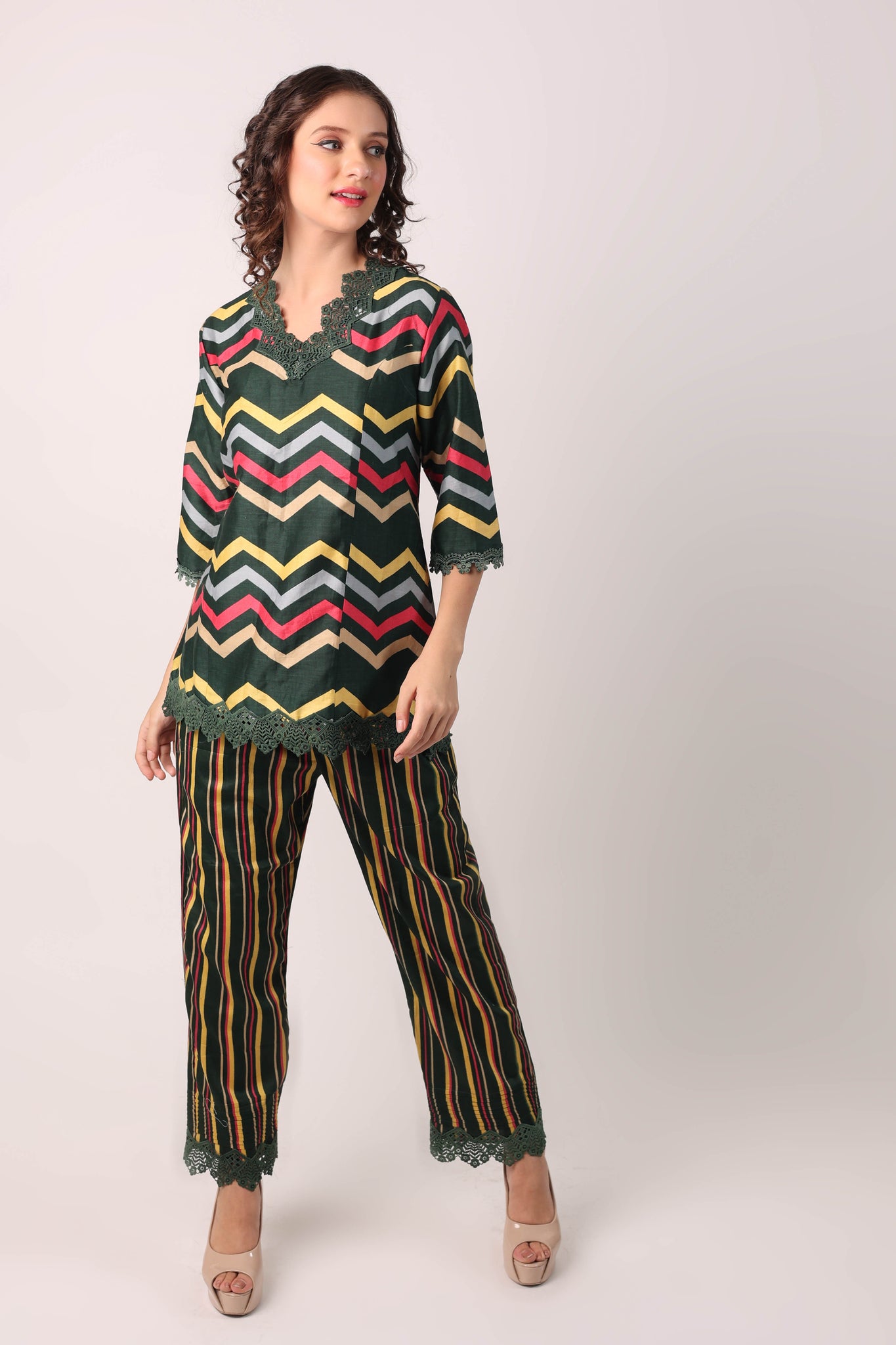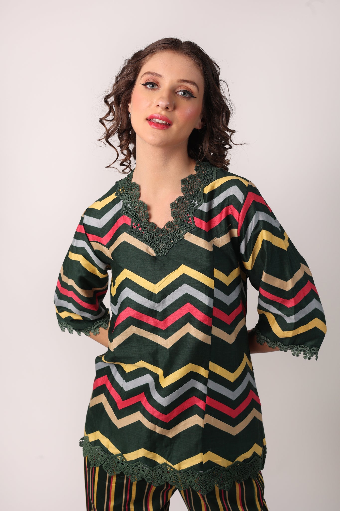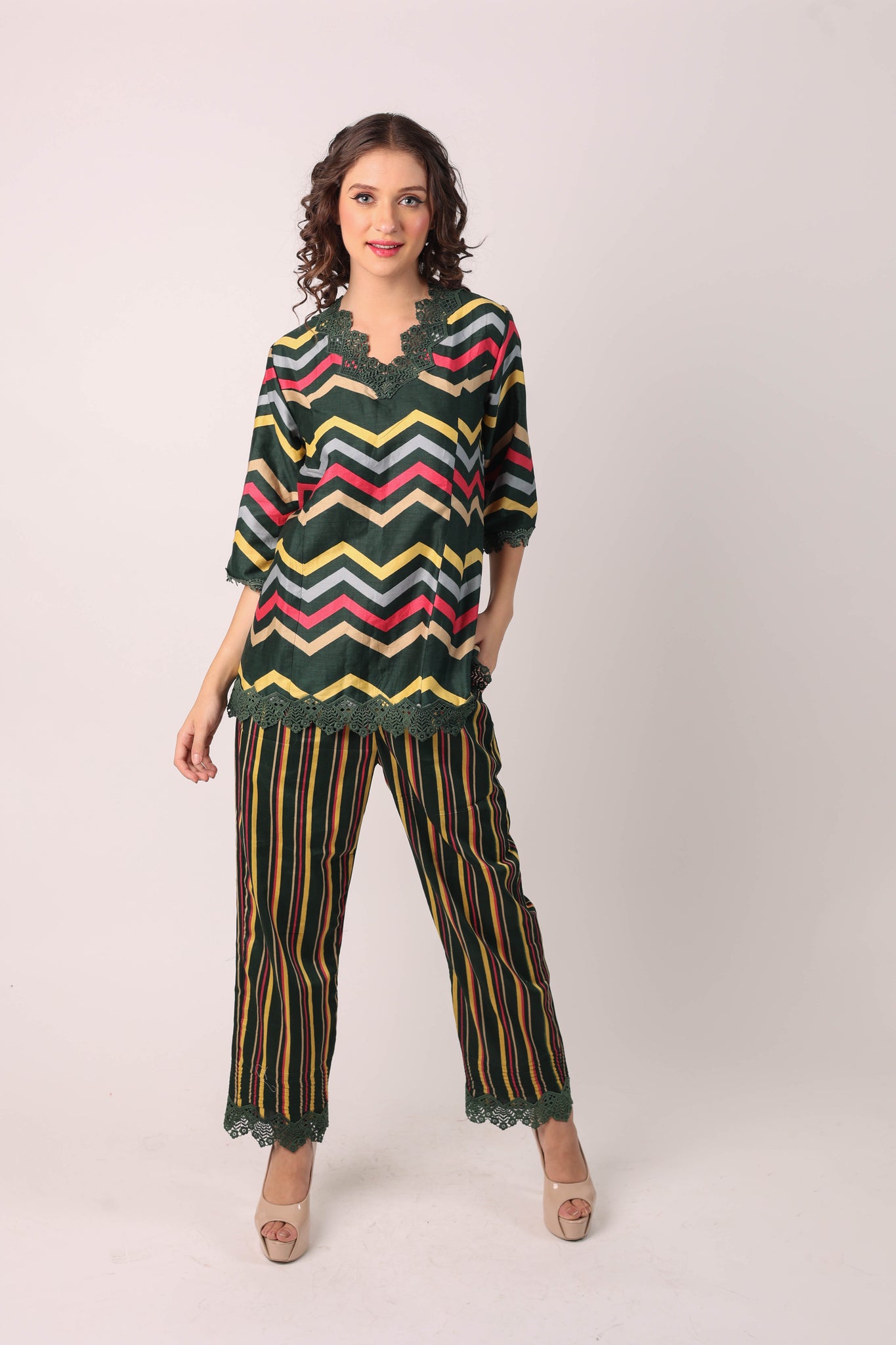 THIS COTTON COORD SET IS EXQUISITELY MADE AND DESIGNED WITH PRINT AND LACE ACCENTS. IT IS INCREDIBLY COMFY TO WEAR YOUR HOT SUMMER IN THE MOST FASHIONABLE WAY!