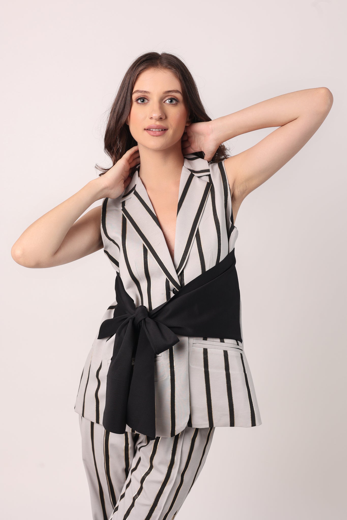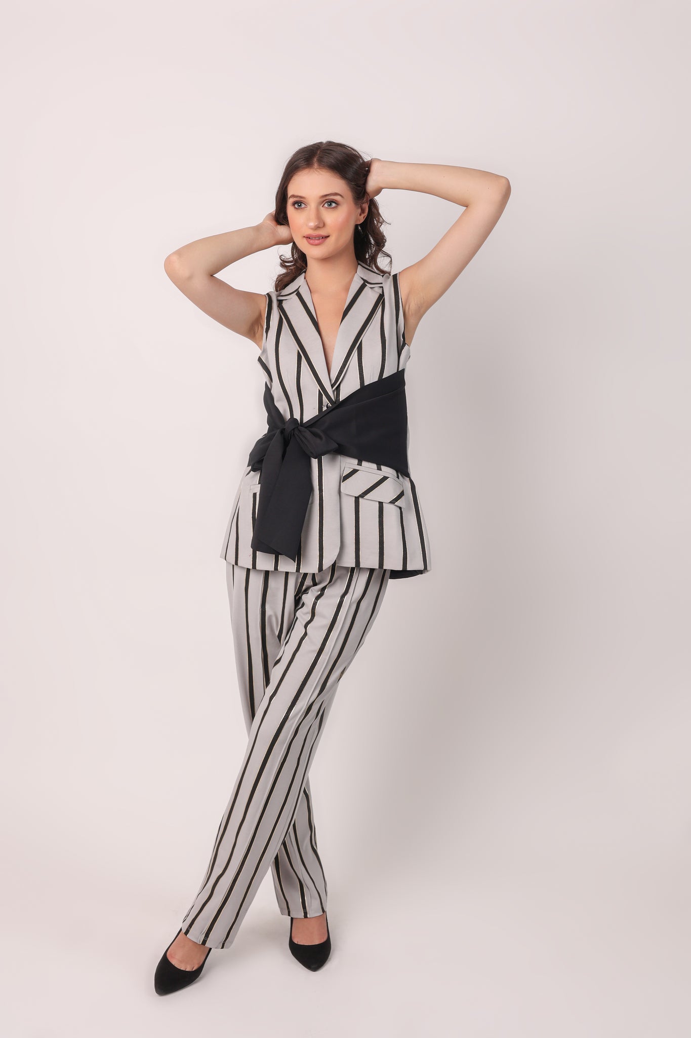 THIS ELEGANTLY MADE STRIPED SLEEVELESS BLAZER LOOKS STUNNING WHEN WORN WITH STRAIGHT-LEG TROUSERS. THIS GORGEOUS COORDINATED SET IS SUPER CHIC AND WILL ROCK ANY FORMAL EVENT!