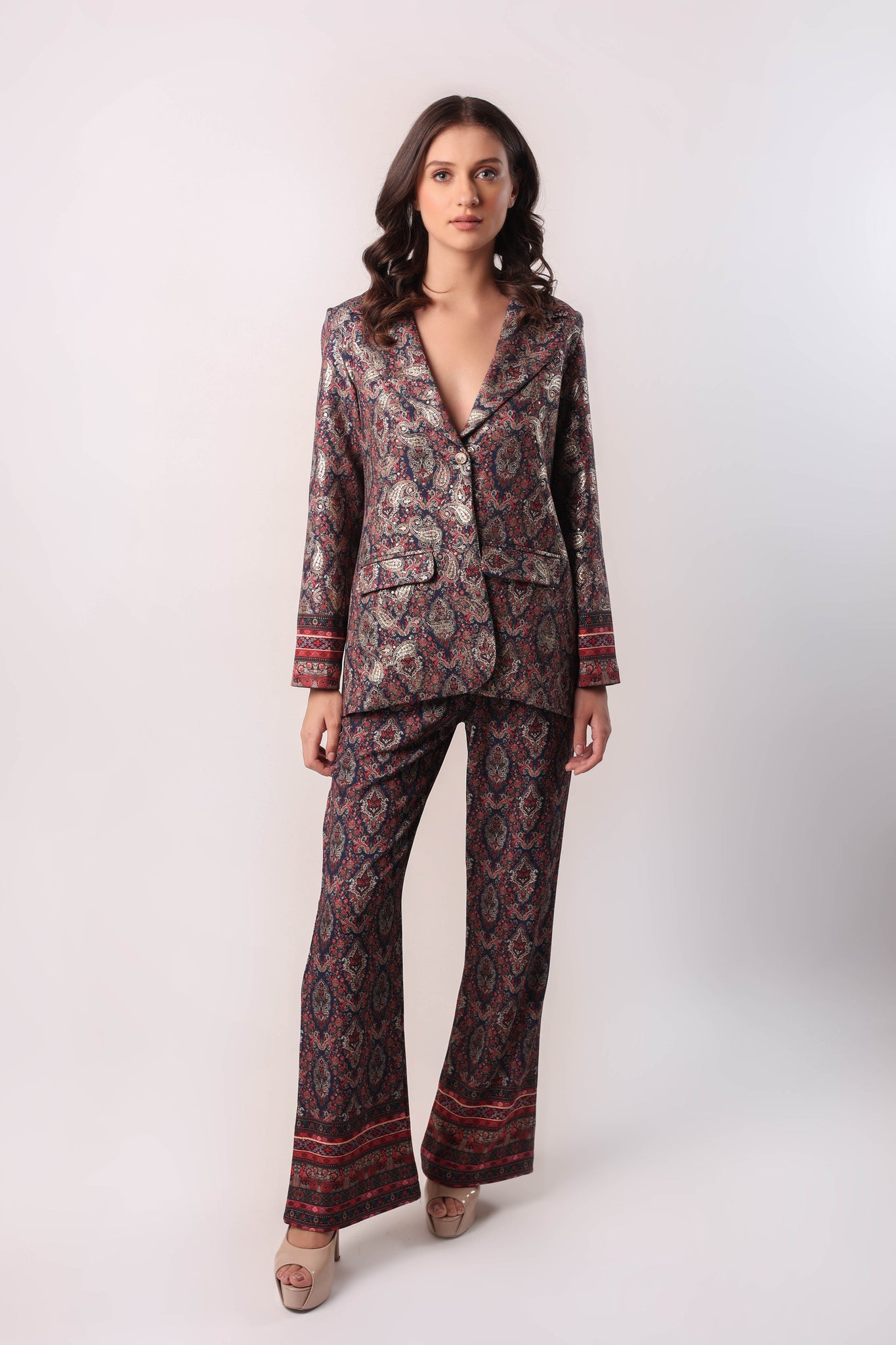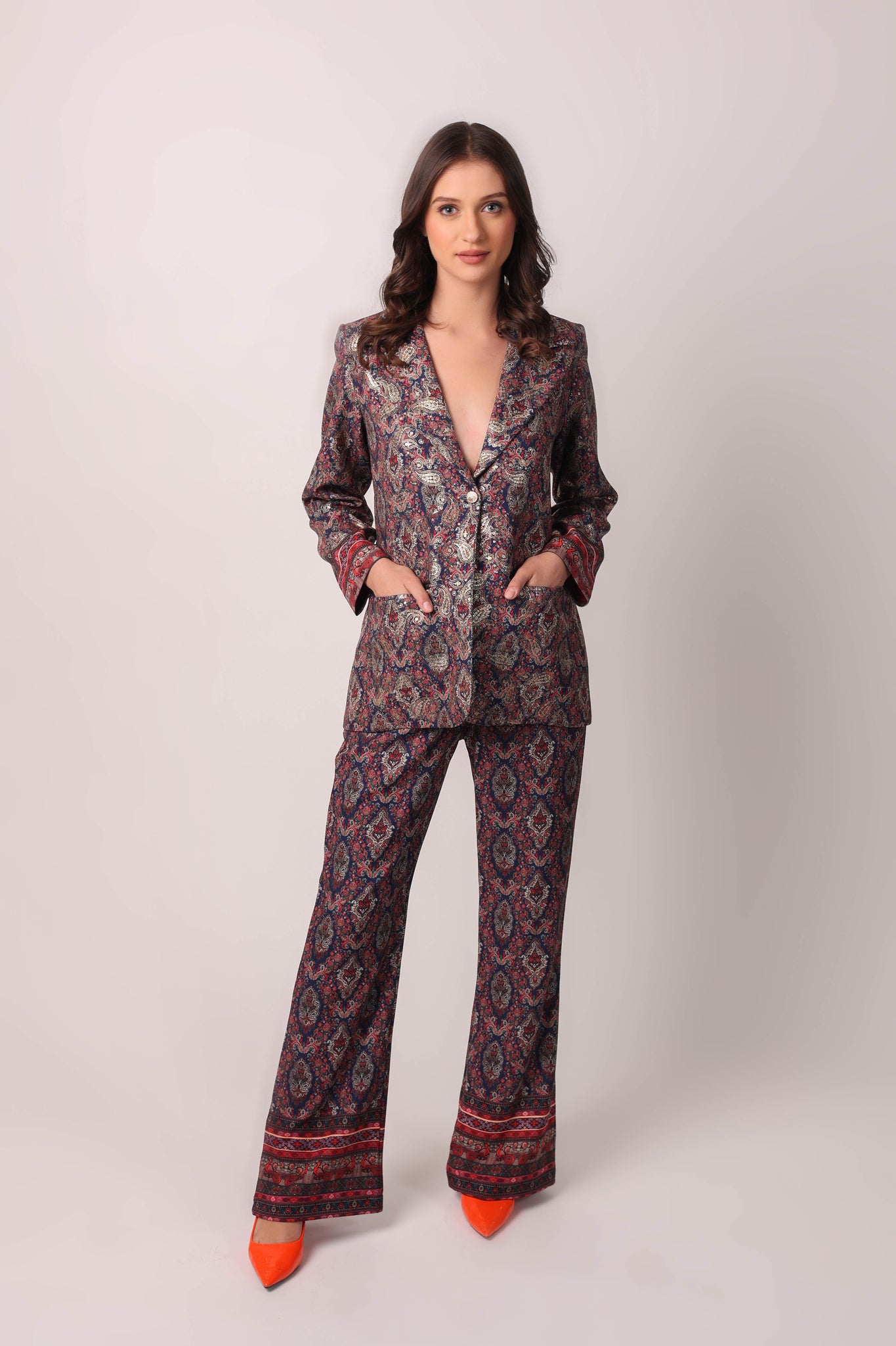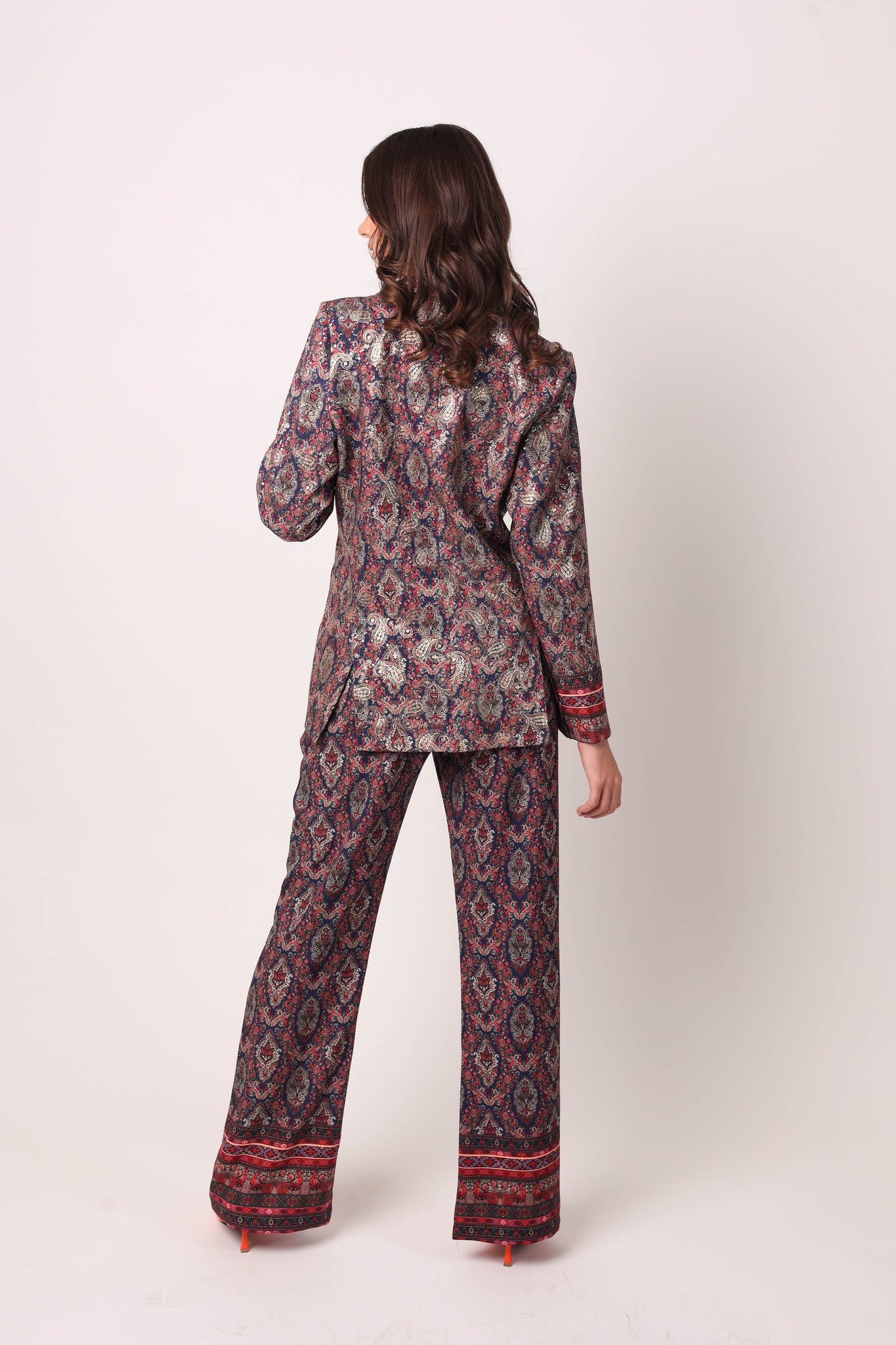 THESE BELL BOTTOM PANTS FEATURING FOIL PRINT DETAILING IS A MUST HAVE FORMALS IN YOUR WARDROBE. THE PRINTS ARE DESIGNED IN-HOUSE THAT MAKES IT ONE OF IT'S KIND.